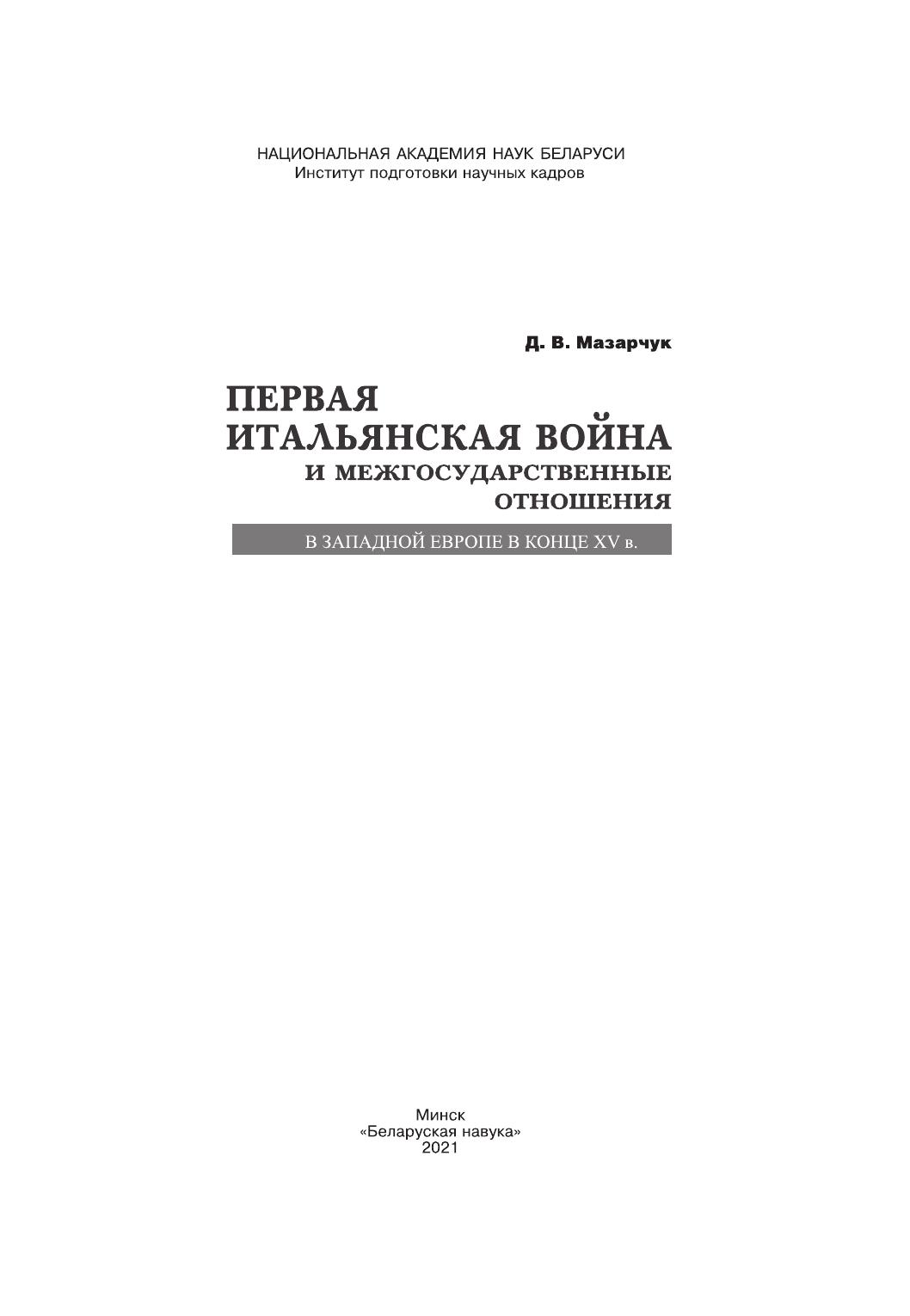 В написанной на основе зарубежных источников монографии рассматриваются межгосударственные отношения в Западной Европе в конце XV в. на материале Первой Итальянской войны (1494–1495 гг.). Особое внимание уделяется дипломатической подготовке и ходу военных действий, соперничеству ведущих европейских государств на внешнеполитической арене, складыванию форм и методов дипломатии раннего Нового времени.