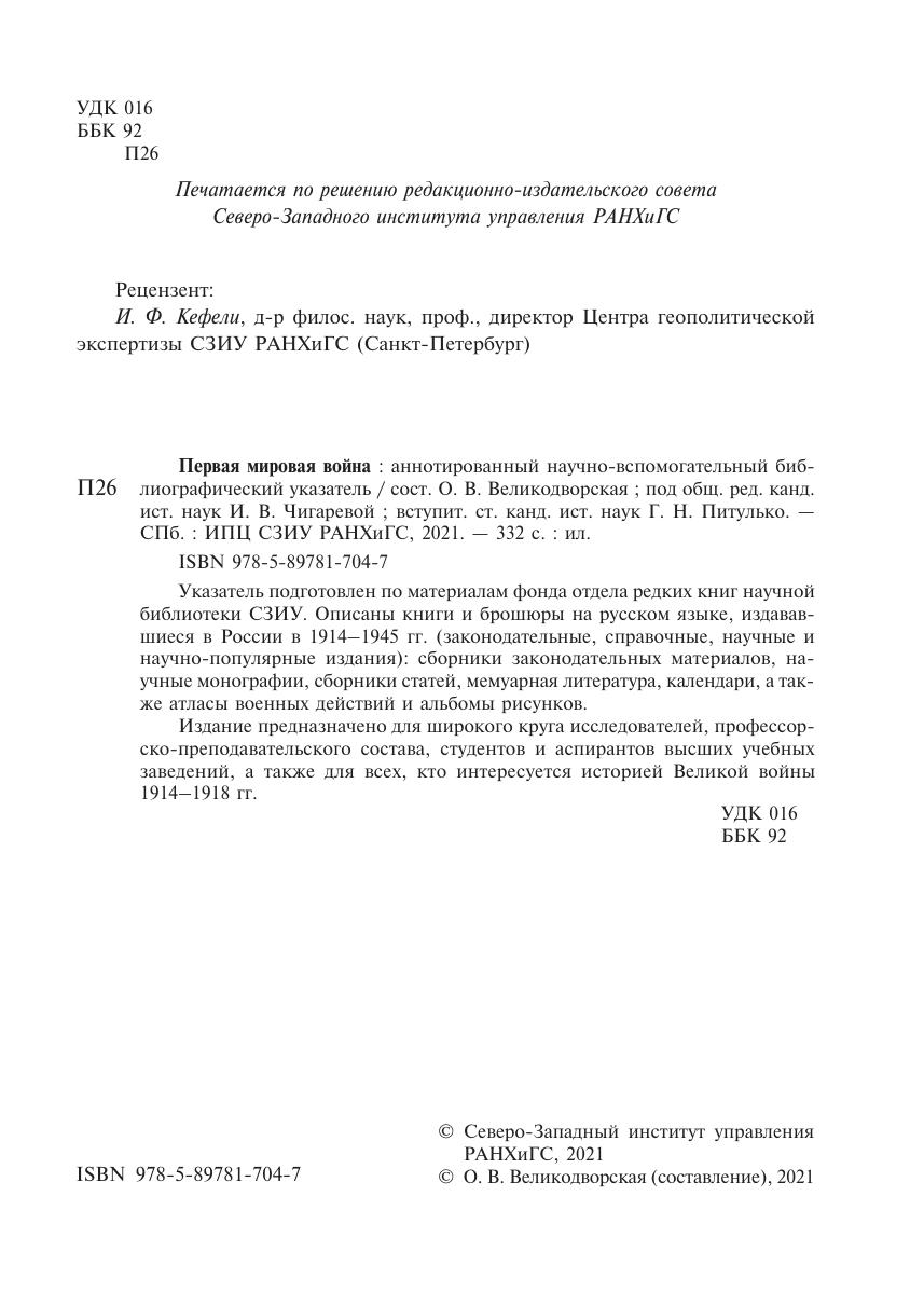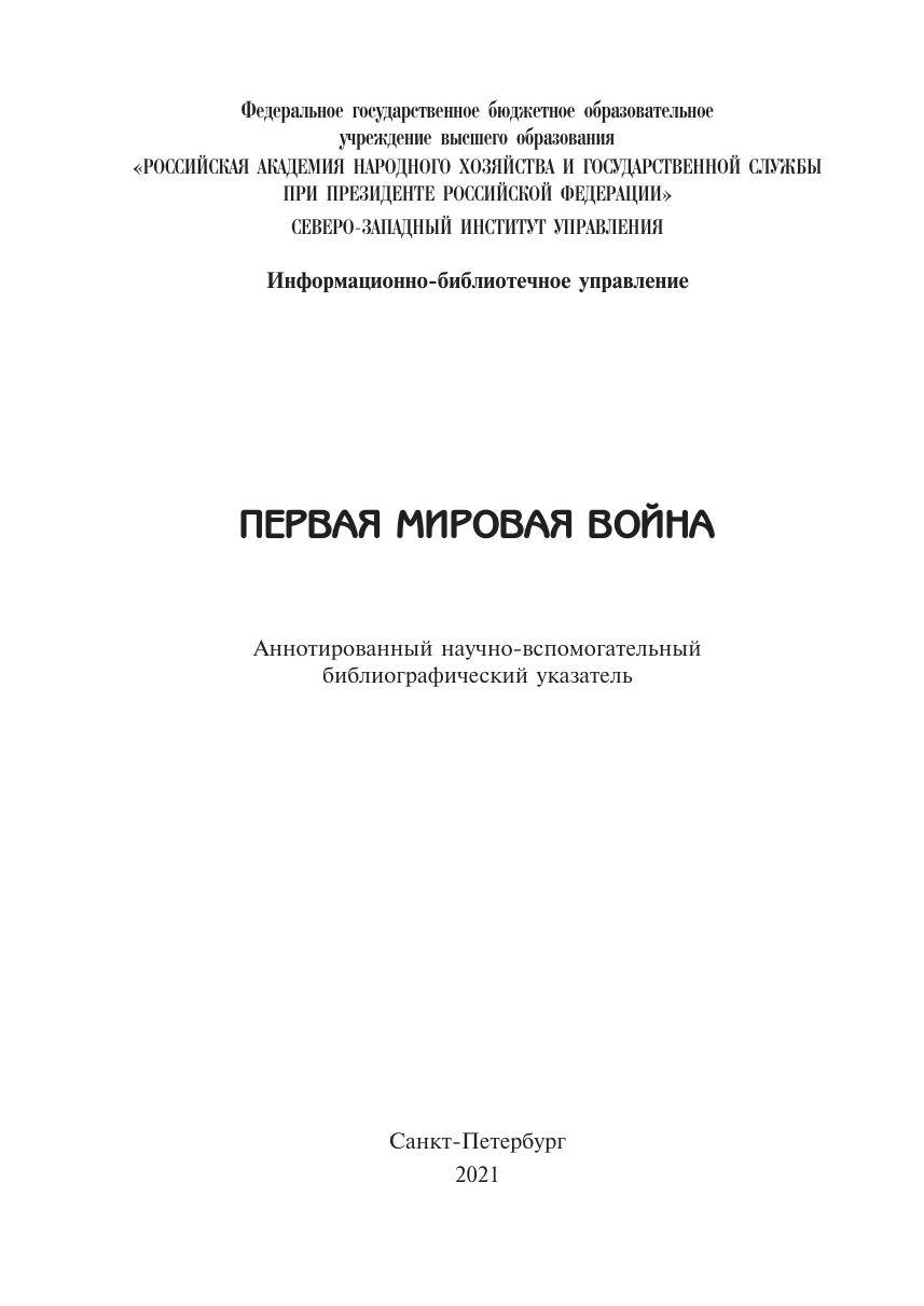 Указатель подготовлен по материалам фонда отдела редких книг научной библиотеки СЗИУ. Описаны книги и брошюры на русском языке, издававшиеся в России в 1914–1945 гг. (законодательные, справочные, научные и научно-популярные издания): сборники законодательных материалов, научные монографии, сборники статей, мемуарная литература, календари, а также атласы военных действий и альбомы рисунков. Издание предназначено для широкого круга исследователей, профессорско-преподавательского состава, студентов и аспирантов высших учебных заведений, а также для всех, кто интересуется историей Великой войны 1914–1918 гг.