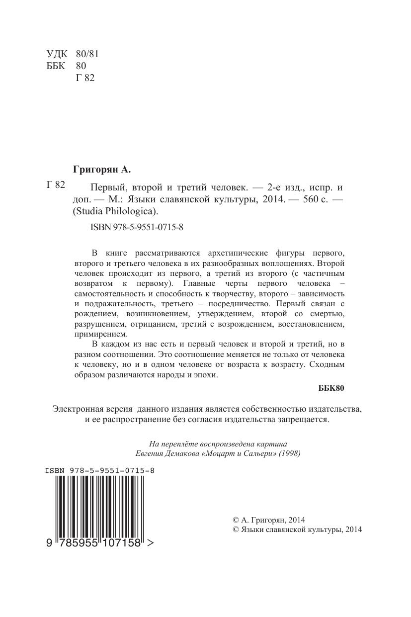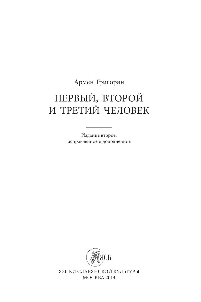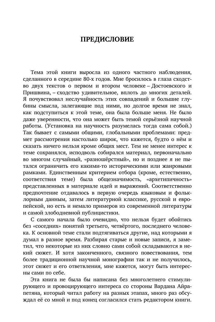 В книге рассматриваются архетипические фигуры первого, второго и третьего человека в их разнообразных воплощениях. Второй человек происходит из первого, а третий из второго (с частичным возвратом к первому). Главные черты первого человека - самостоятельность и способность к творчеству, второго - зависимость и подражательность, третьего - посредничество. Первый связан с рождением, возникновением, утверждением, второй со смертью, разрушением, отрицанием, третий с возрождением, восстановлением, примирением. В каждом из нас есть и первый человек и второй и третий, но в разном соотношении. Это соотношение меняется не только от человека к человеку, но и в одном человеке от возраста к возрасту. Сходным образом различаются народы и эпохи.