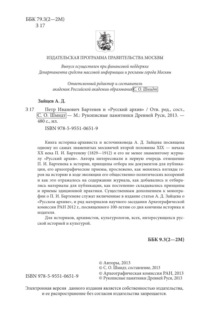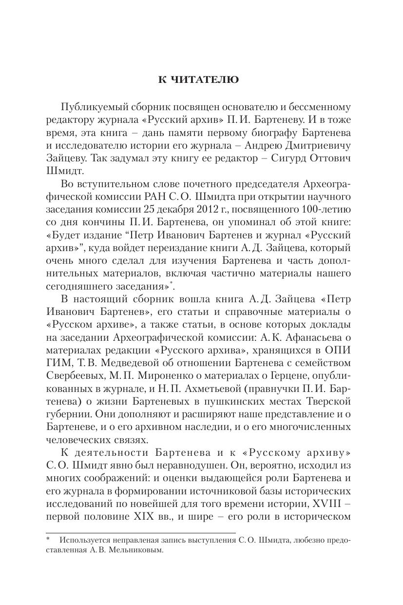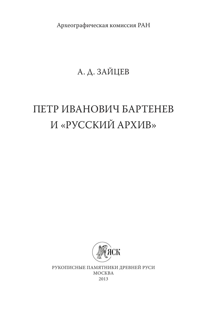 Книга историка-архивиста и источниковеда А.Д.Зайцева посвящена одному из самых знаменитых москвичей второй половины XIX – начала XX века П.И.Бартеневу и его не менее знаменитому журналу «Русский архив». Автора интересовали в первую очередь отношение П.И.Бартенева к истории, принципы отбора им документов для публикации, его археографические приемы, прослежено, как менялись взгляды героя на историю в ходе эволюции его общественно-политических воззрений и как это отражалось на содержании журнала, как добывались и отбирались материалы для публикации, как постепенно складывались принципы и приемы эдиционной практики. Существенным дополнением к монографии о П.И.Бартеневе служат включенные в издание статьи А.Д.Зайцева о «Русском архиве», и ряд материалов научного заседания Археографической комиссии РАН 2012 г., посвященного 100-летию со дня кончины историка и издателя. Для историков, архивистов, культурологов, всех, интересующихся русской историей и культурой.