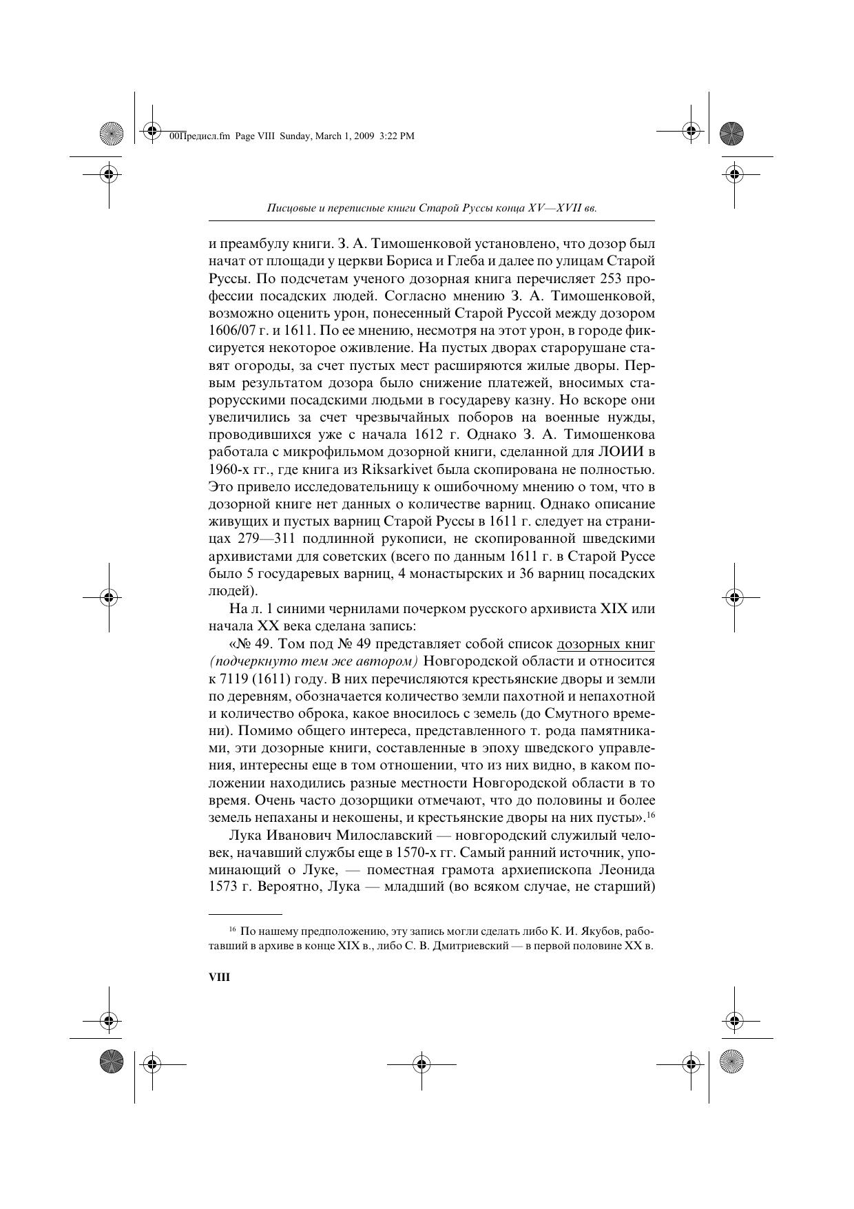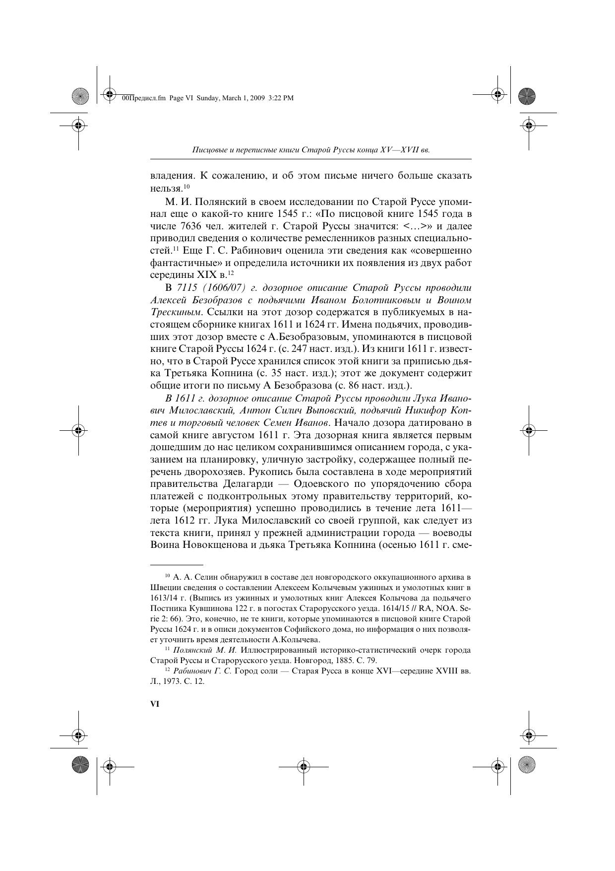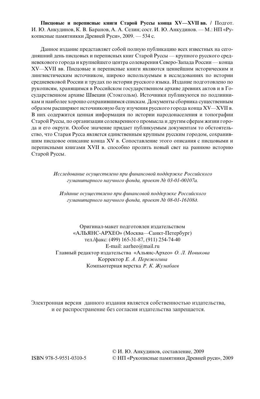 Данное издание представляет собой полную публикацию всех известных на сегодняшний день писцовых и переписных книг Старой Руссы - крупного русского средневекового города и крупнейшего центра солеварения Северо-Запада России - конца XV-XVII вв. Писцовые и переписные книги являются ценнейшим историческим и лингвистическим источником, широко используемым в исследованиях по истории средневековой России и трудах по истории русского языка. Издание подготовлено по рукописям, хранящимся в Российском государственном архиве древних актов и в Государственном архиве Швеции (Стокгольм). Источники публикуются по подлинникам и наиболее хорошо сохранившимся спискам. Документы сборника существенным образом расширяют источниковую базу изучения русского города конца XV-XVII в. В них содержится ценная информация по истории народонаселения и топографии Старой Руссы, по организации солеваренного промысла и другим сферам жизни города и его округи. Особое значение придает публикуемым документам то обстоятельство, что Старая Русса является единственным крупным русским городом, сохранившим писцовое описание конца XV в. Сопоставление этого описания с писцовыми и переписными книгами XVII в. способно пролить новый свет на раннюю историю Старой Руссы. Книга предназначена для историков, филологов и всех интересующихся историей России.
