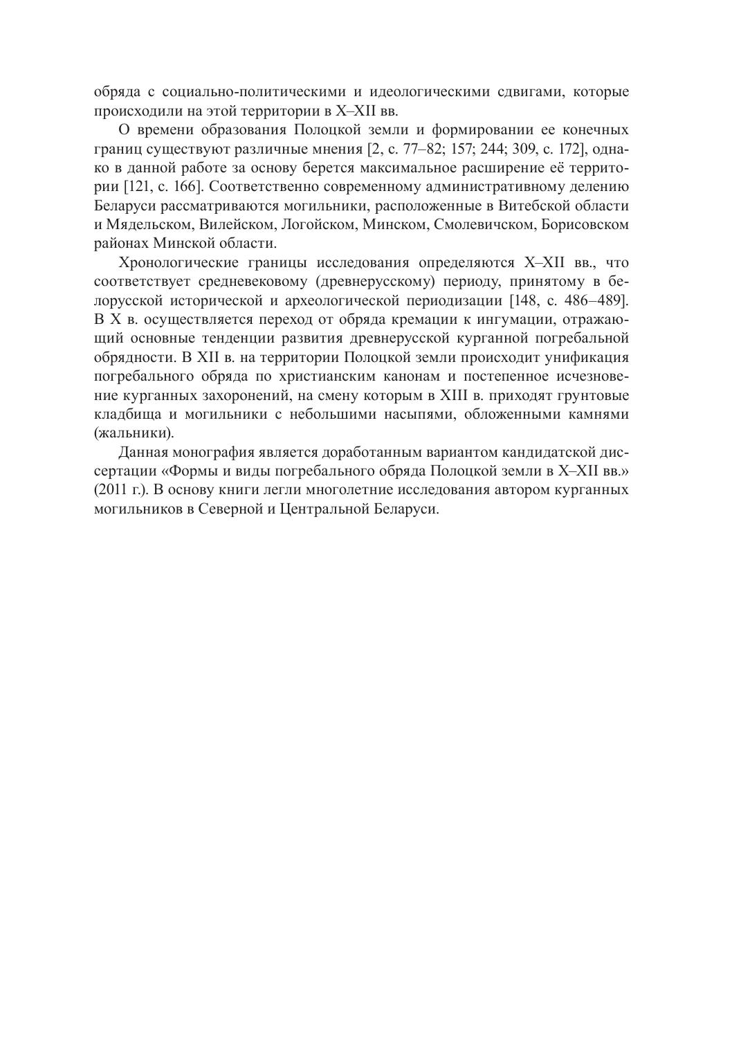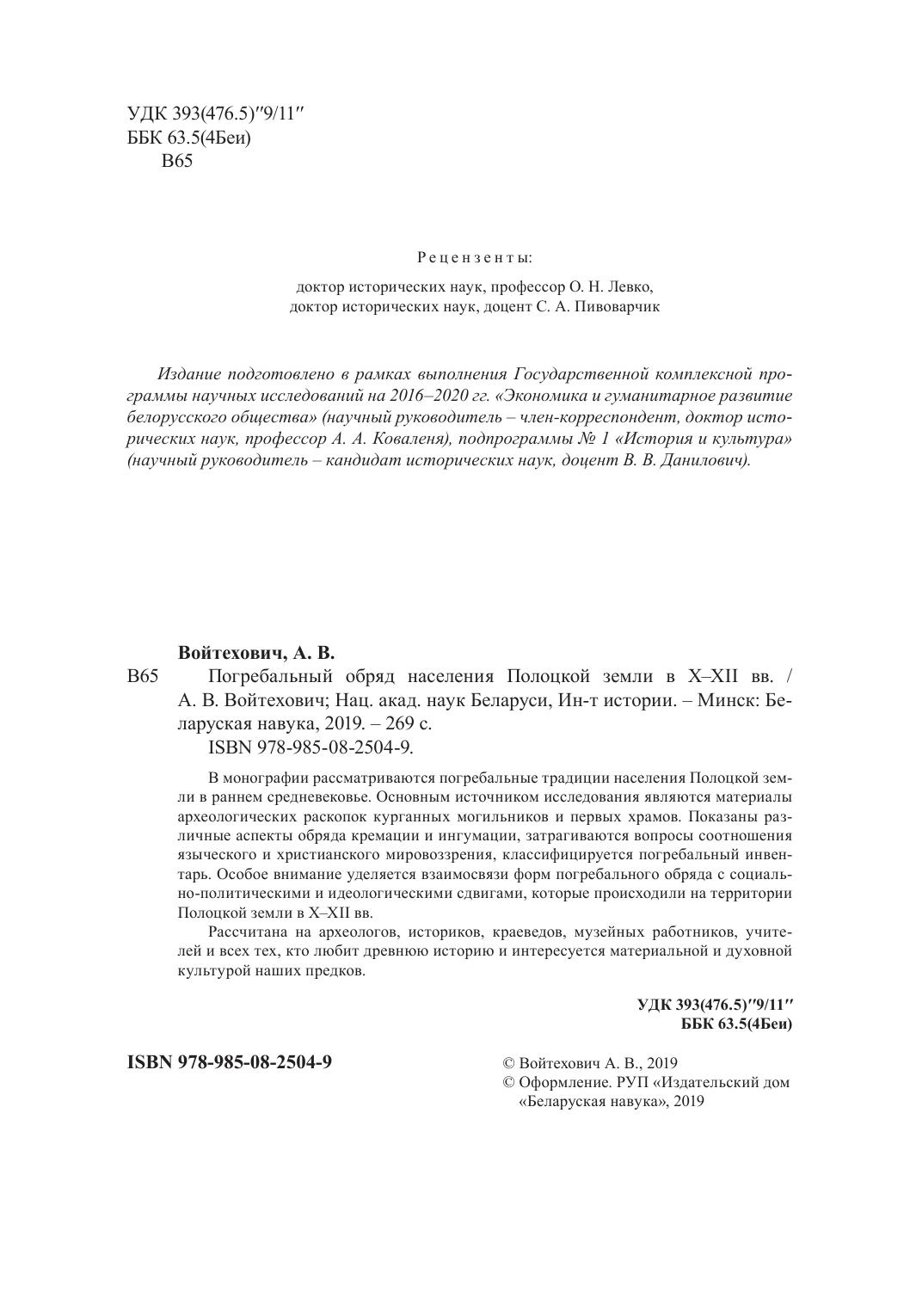 В монографии рассматриваются погребальные традиции населения Полоцкой земли в раннем средневековье. Основным источником исследования являются материалы археологических раскопок курганных могильников и первых храмов. Показаны различные аспекты обряда кремации и ингумации, затрагиваются вопросы соотношения языческого и христианского мировоззрения, классифицируется погребальный инвентарь. Особое внимание уделяется взаимосвязи форм погребального обряда с социально-политическими и идеологическими сдвигами, которые происходили на территории Полоцкой земли в Х–ХІІ вв. Рассчитана на археологов, историков, краеведов, музейных работников, учителей и всех тех, кто любит древнюю историю и интересуется материальной и духовной культурой наших предков.