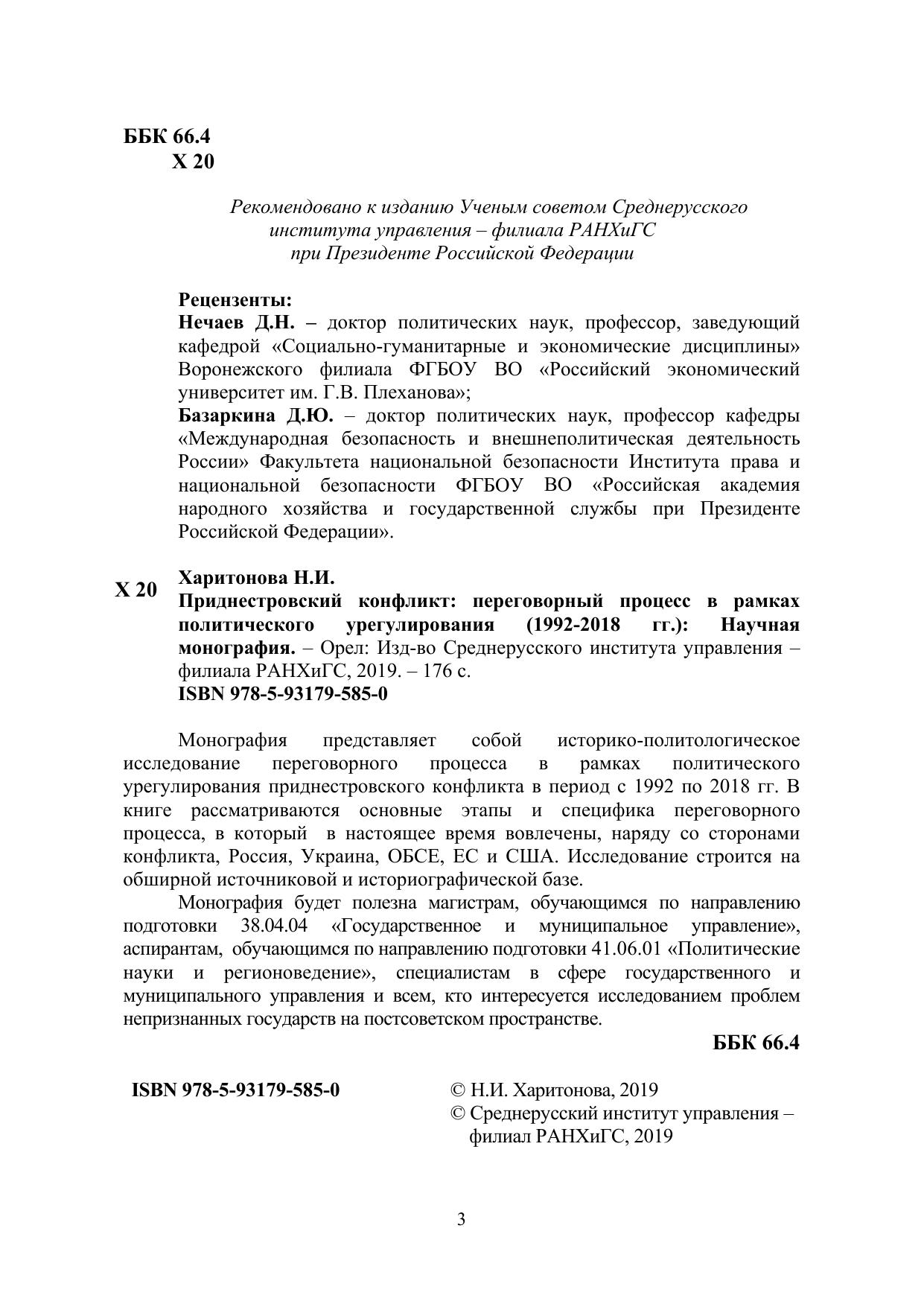Монография представляет собой историко-политологическое исследование переговорного процесса в рамках политического урегулирования приднестровского конфликта в период с 1992 по 2018 гг. В книге рассматриваются основные этапы и специфика переговорного процесса, в который в настоящее время вовлечены, наряду со сторонами конфликта, Россия, Украина, ОБСЕ, ЕС и США. Исследование строится на обширной источниковой и историографической базе. Монография будет полезна магистрам, обучающимся по направлению подготовки 38.04.04 «Государственное и муниципальное управление», аспирантам, обучающимся по направлению подготовки 41.06.01 «Политические науки и регионоведение», специалистам в сфере государственного и муниципального управления и всем, кто интересуется исследованием проблем непризнанных государств на постсоветском пространстве.