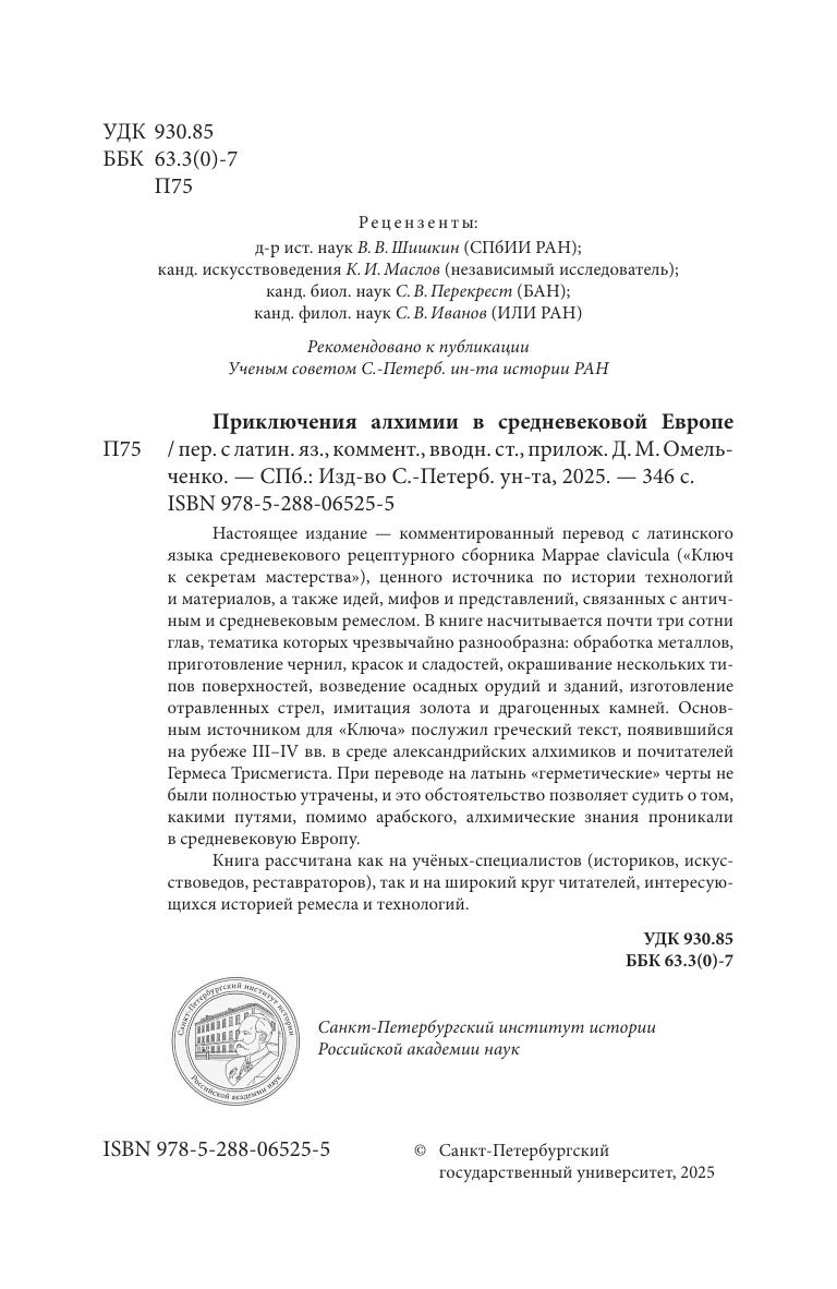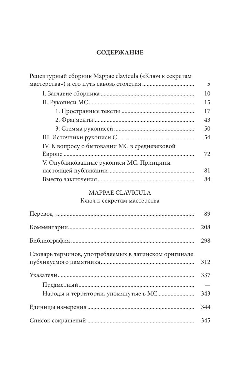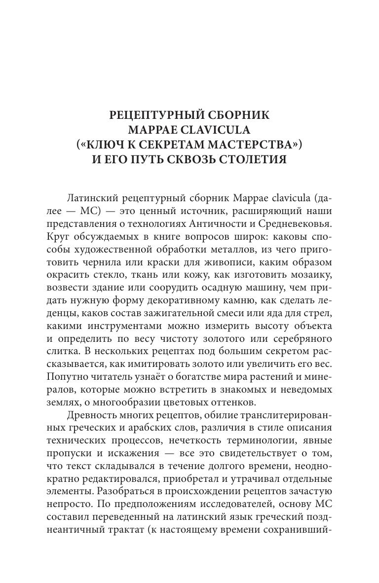 Настоящее издание — комментированный перевод с латинского языка средневекового рецептурного сборника Mappae сlavicula («Ключ к секретам мастерства»), ценного источника по истории технологий и материалов, а также идей, мифов и представлений, связанных с античным и средневековым ремеслом. В книге насчитывается почти три сотни глав, тематика которых чрезвычайно разнообразна: обработка металлов, приготовление чернил, красок и сладостей, окрашивание нескольких типов поверхностей, возведение осадных орудий и зданий, изготовление отравленных стрел, имитация золота и драгоценных камней. Основным источником для «Ключа» послужил греческий текст, появившийся на рубеже III–IV вв. в среде александрийских алхимиков и почитателей Гермеса Трисмегиста. При переводе на латынь «герметические» черты не были полностью утрачены, и это обстоятельство позволяет судить о том, какими путями, помимо арабского, алхимические знания проникали в средневековую Европу. Книга рассчитана как на учёных-специалистов (историков, искусствоведов, реставраторов), так и на широкий круг читателей, интересующихся историей ремесла и технологий.