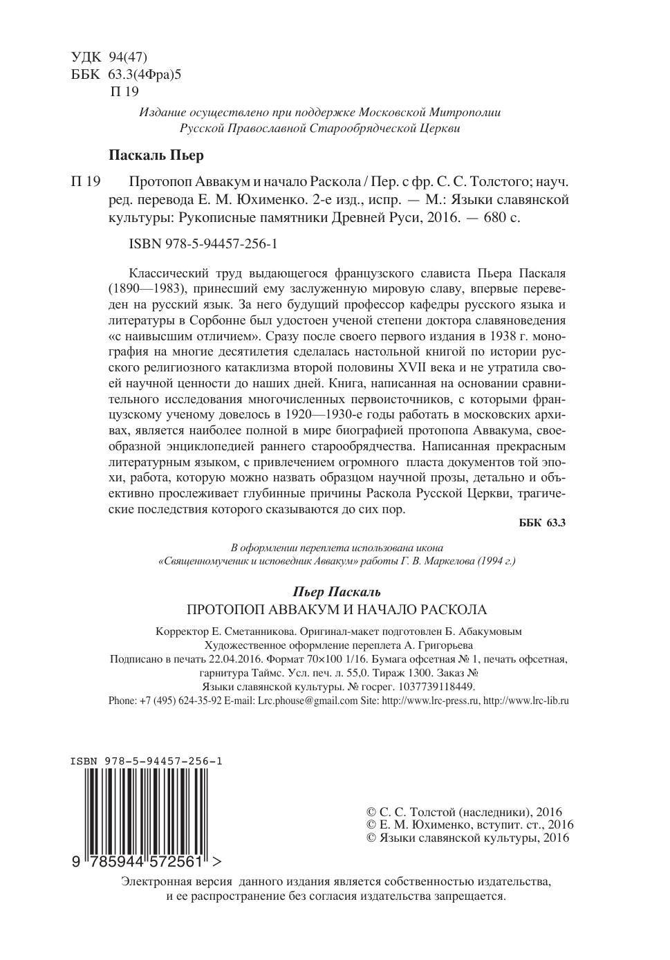 Классический труд выдающегося французского слависта Пьера Паскаля (1890–1983), принесший ему заслуженную мировую славу, впервые переведен на русский язык. За него будущий профессор кафедры русского языка и литературы в Сорбонне был удостоен ученой степени доктора славяноведения «с наивысшим отличием». Сразу после своего первого издания в 1938 г. монография на многие десятилетия сделалась настольной книгой по истории русского религиозного катаклизма второй половины XVII века и не утратила своей научной ценности до наших дней. Книга, написанная на основании сравнительного исследования многочисленных первоисточников, с которыми французскому ученому довелось в 1920–1930-е годы работать в московских архивах, является наиболее полной в мире биографией протопопа Аввакума, своеобразной энциклопедией раннего старообрядчества. Написанная прекрасным литературным языком, с привлечением огромного пласта документов той эпохи, работа, которую можно назвать образцом научной прозы, детально и объективно прослеживает глубинные причины Раскола Русской Церкви, трагические последствия которого сказываются до сих пор.