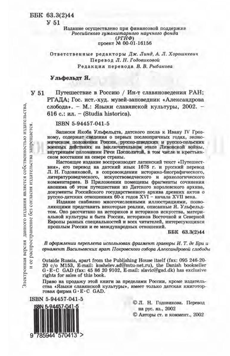 Записки Якоба Ульфельдта, датского посла к Ивану IV Грозному, содержат сведения о первых послеопричных годах, экономическом положении России, русско-шведских и русско-польских военных действиях на заключительном этапе Ливонской войны, внутреннем положении Речи Посполитой, в том числе и крестьянском восстании на севере страны. Настоящее издание воспроизводит латинский текст «Путешествия», его перевод на датский язык 1678 г. и русский перевод Л. Н. Годовиковой, в сопровождении историко-биографического, литературоведческого, искусствоведческого и археологического комментариев. В Приложении помещены фрагменты сочинения анонима об этом путешествии из Датского королевского архива, документы Российского государственного архива древних актов о русско-датских отношениях 60-х годов XVI – начала XVII века. Издание снабжено многочисленными иллюстрациями, позволяющими представить некоторые реалии, описанные Я. Ульфельдтом. Оно рассчитано на историков и историков искусства, материальной культуры и быта России, историков Восточной и Северной Европы разных специальностей и всех читателей, интересующихся прошлым России и ее международных отношений.