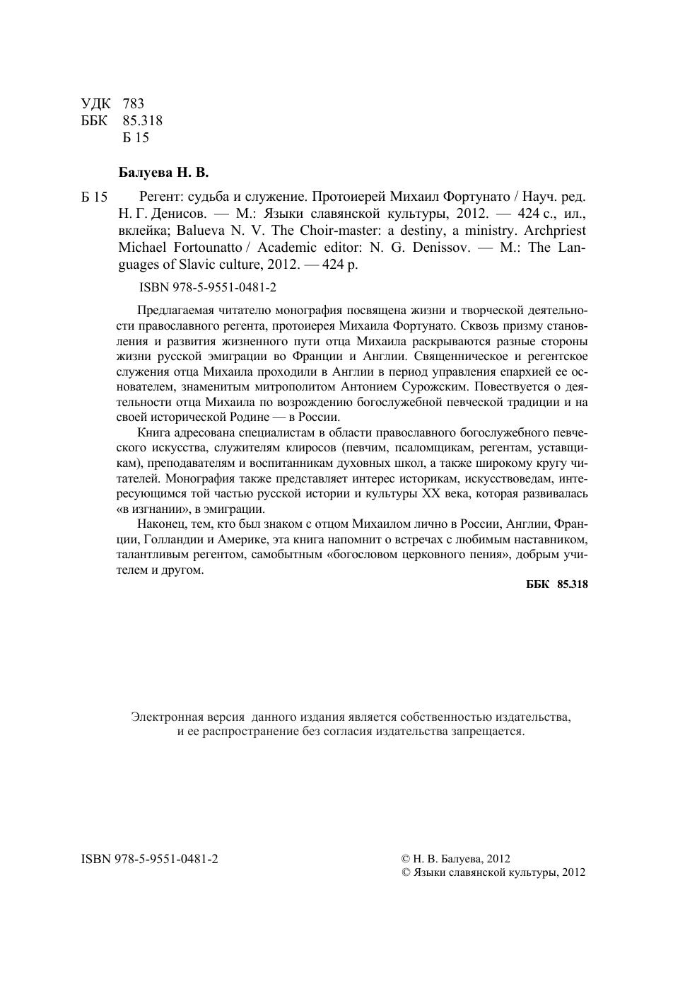 Предлагаемая читателю монография посвящена жизни и творческой деятельности православного регента, протоиерея Михаила Фортунато. Сквозь призму становления и развития жизненного пути отца Михаила раскрываются разные стороны жизни русской эмиграции во Франции и Англии. Священническое и регентское служения отца Михаила проходили в Англии в период управления епархией ее основателем, знаменитым митрополитом Антонием Сурожским. Повествуется о деятельности отца Михаила по возрождению богослужебной певческой традиции и на своей исторической Родине - в России. Книга адресована специалистам в области православного богослужебного певческого искусства, служителям клиросов (певчим, псаломщикам, регентам, уставщикам), преподавателям и воспитанникам духовных школ, а также широкому кругу читателей. Монография также представляет интерес историкам, искусствоведам, интересующимся той частью русской истории и культуры XX века, которая развивалась "в изгнании", в эмиграции.