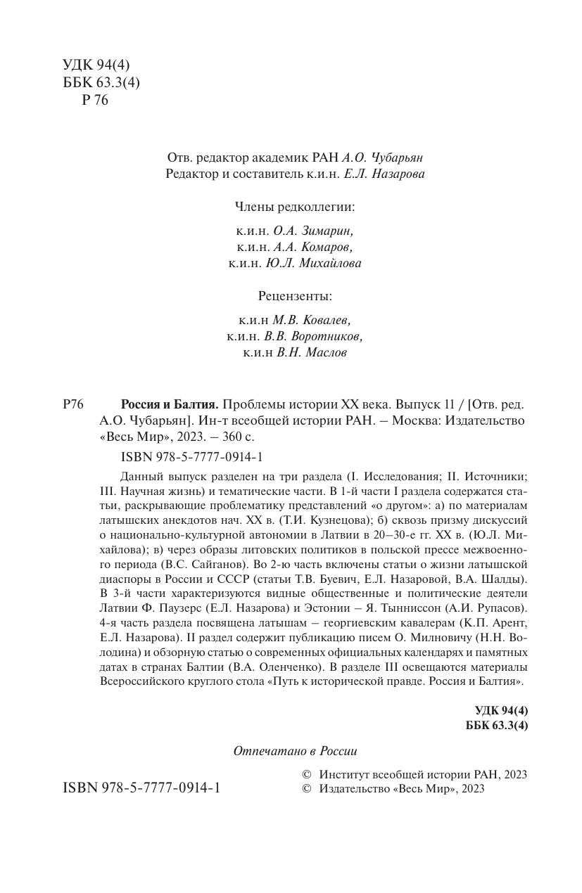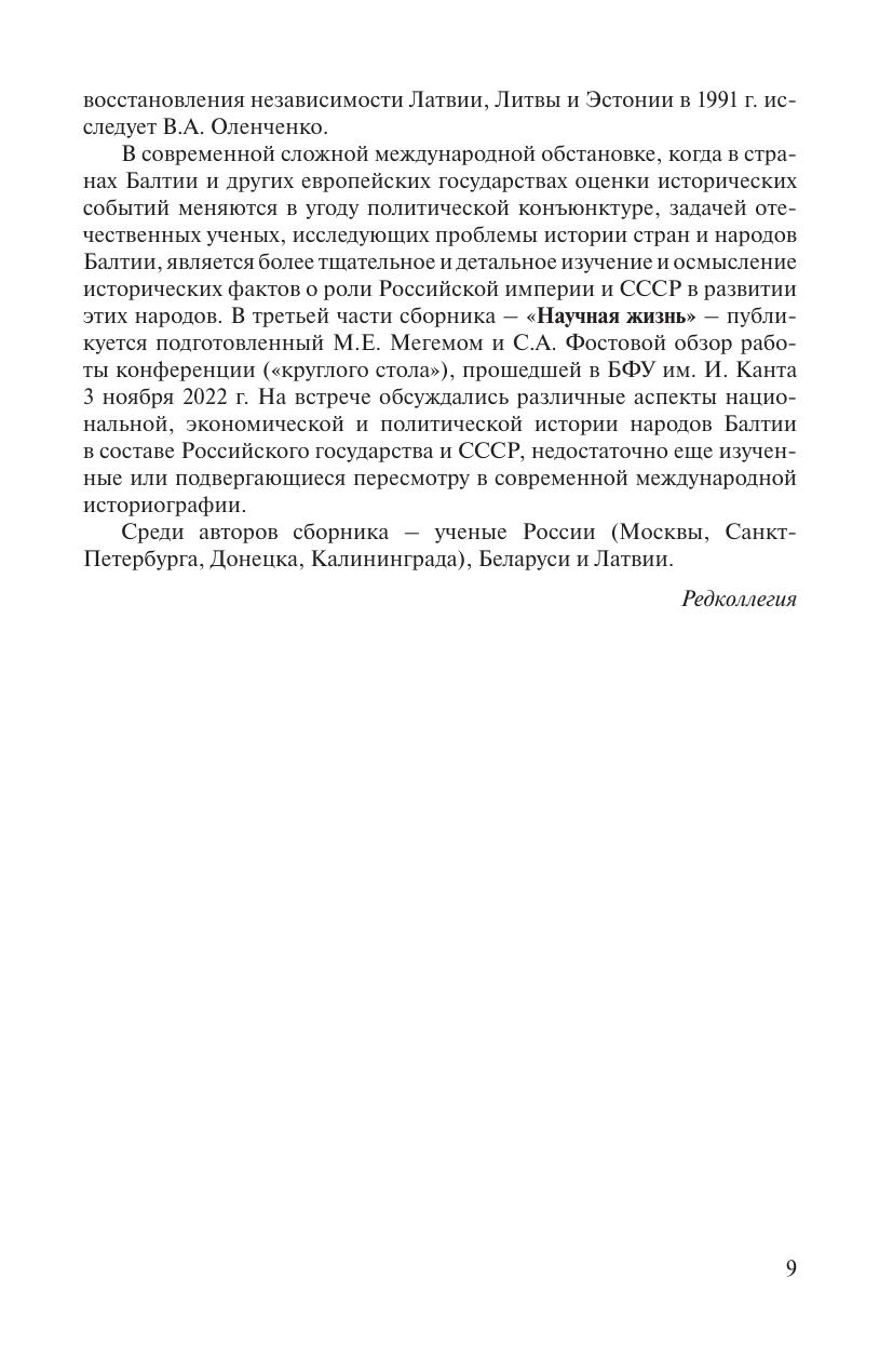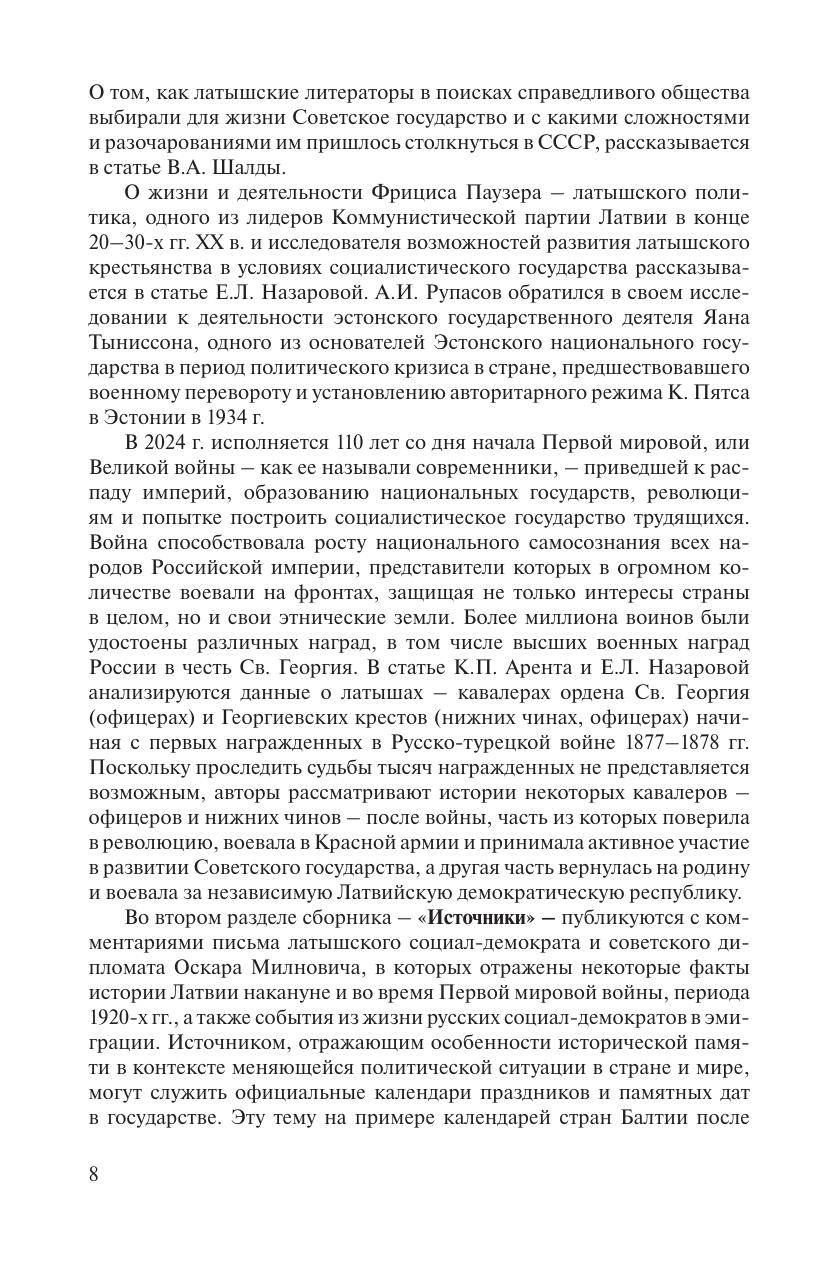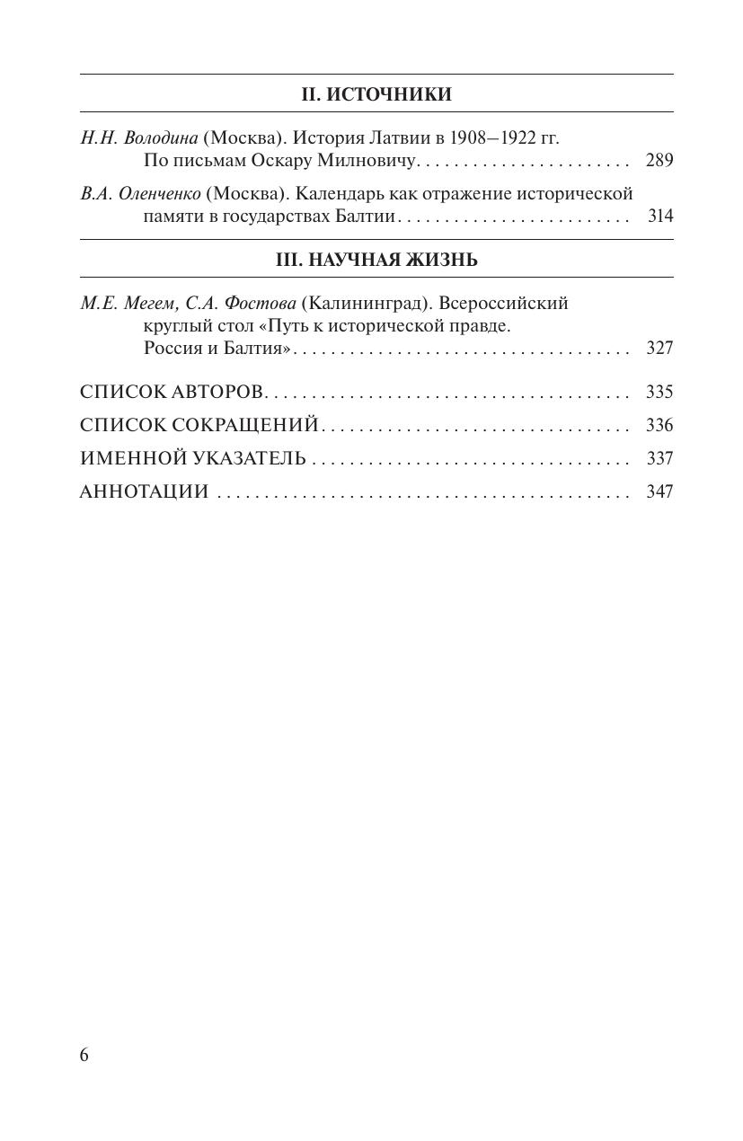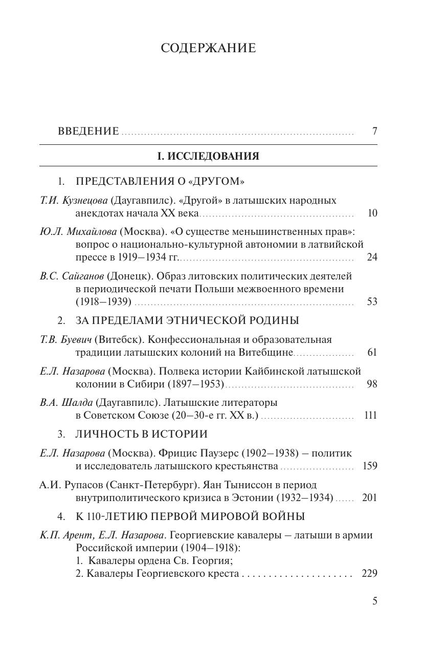 Данный выпуск разделен на три раздела (I. Исследования; II. Источники; III. Научная жизнь) и тематические части. В 1-й части I раздела содержатся статьи, раскрывающие проблематику представлений «о другом»: а) по материалам латышских анекдотов нач. XX в. (Т.И. Кузнецова); б) сквозь призму дискуссий о национально-культурной автономии в Латвии в 20–30-е гг. XX в. (Ю.Л. Михайлова); в) через образы литовских политиков в польской прессе межвоенного периода (В.С. Сайганов). Во 2-ю часть включены статьи о жизни латышской диаспоры в России и СССР (статьи Т.В. Буевич, Е.Л. Назаровой, В.А. Шалды). В 3-й части характеризуются видные общественные и политические деятели Латвии Ф. Паузерс (Е.Л. Назарова) и Эстонии – Я. Тынниссон (А.И. Рупасов). 4-я часть раздела посвящена латышам – георгиевским кавалерам (К.П. Арент, Е.Л. Назарова). II раздел содержит публикацию писем О. Милновичу (Н.Н. Володина) и обзорную статью о современных официальных календарях и памятных датах в странах Балтии (В.А. Оленченко). В разделе III освещаются материалы Всероссийского круглого стола «Путь к исторической правде. Россия и Балтия».