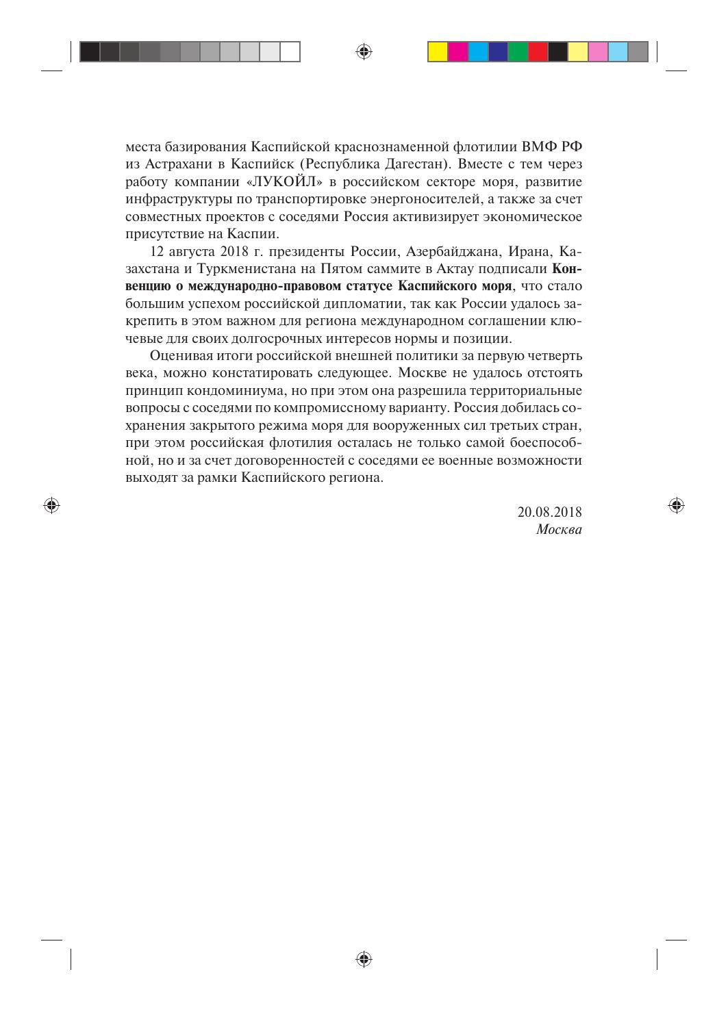 Монография посвящена анализу стратегии России в отношении важного для ее внешней политики каспийского направления. Автор показывает, к каким серьезным изменениям вокруг Каспийского моря привел распад СССР в 1991 г., как Россия адаптировала свою стратегию в отношении моря в условиях появления трех новых независимых государств и повышенного интереса западных политических кругов к ресурсам моря. Как при активнейшем российском участии в августе 2018 г. была подписана Конвенция о международно-правовом статусе Каспийского моря. Этот документ позволил обеспечить благоприятную для России систему региональной безопасности, а также сформировать правовую базу для защиты экологии моря и развития экономических отношений с соседями.