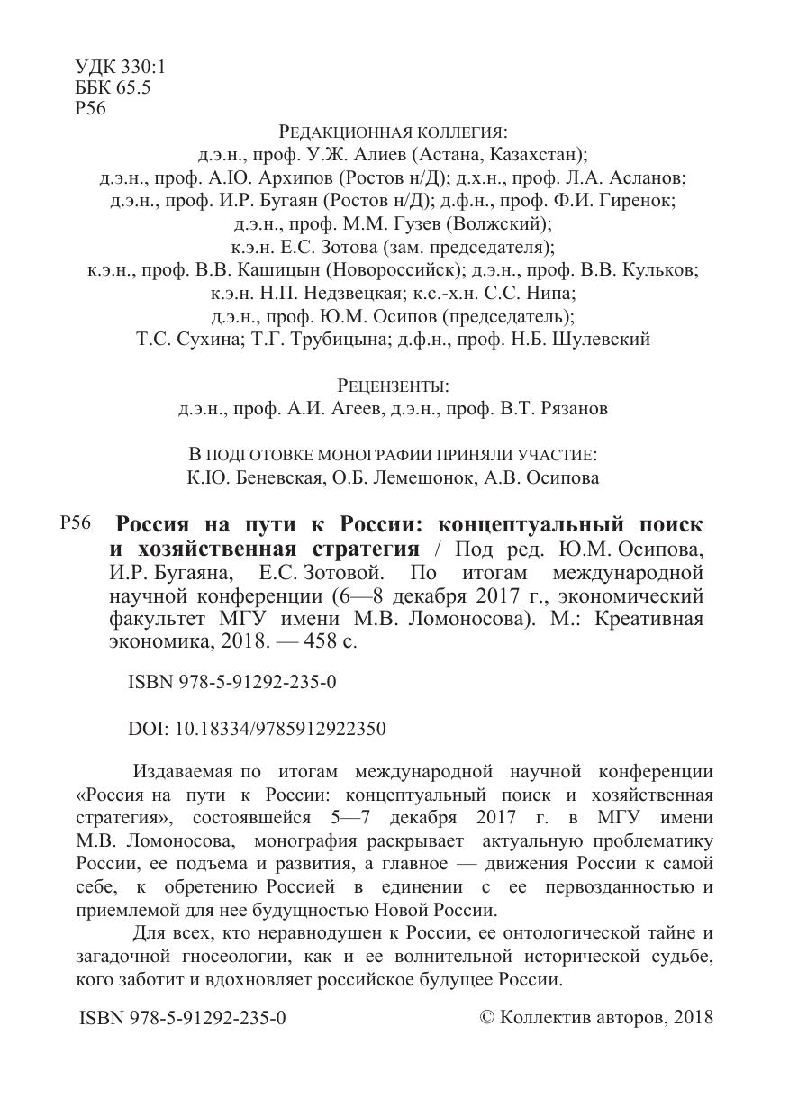 Издаваемая по итогам международной научной конференции «Россия на пути к России: концептуальный поиск и хозяйственная стратегия», состоявшейся 5—7 декабря 2017 г. в МГУ имени М.В. Ломоносова, монография раскрывает актуальную проблематику России, ее подъема и развития, а главное — движения России к самой себе, к обретению Россией в единении с ее первозданностью и приемлемой для нее будущностью Новой России. Для всех, кто неравнодушен к России, ее онтологической тайне и загадочной гносеологии, как и ее волнительной исторической судьбе, кого заботит и вдохновляет российское будущее России.