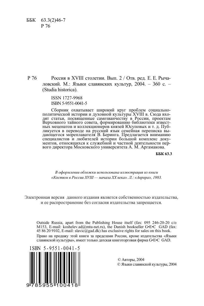 Сборник охватывает широкий круг проблем социально-политической истории и духовной культуры XVIII в. Сюда входят статьи, посвященные самозванчеству в России, проектам Верховного тайного совета, формированию библиотеки известных меценатов и коллекционеров князей Юсуповых и т. д. Публикуется в переводе на русский язык семейная переписка выдающегося мореплавателя В. Беринга. Предлагается вниманию специалистов и любителей истории большой комплекс документов, относящихся к служебной и частной деятельности первого директора Московского университета А. М. Аргамакова.
