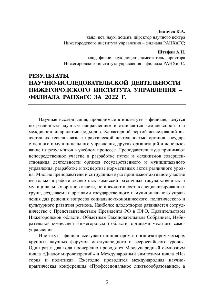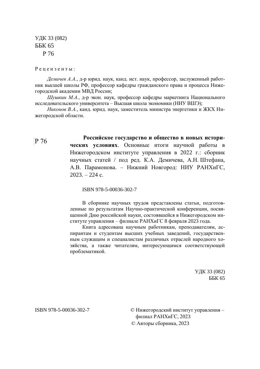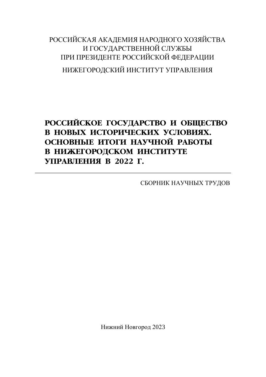 Российское государство и общество в новых исторических условиях. Основные итоги научной работы в Нижегородском институте управления в 2022 г.: сборник научных статей