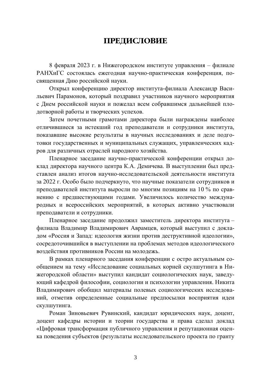 В сборнике научных трудов представлены статьи, подготовленные по результатам Научно-практической конференции, посвященной Дню российской науки, состоявшейся в Нижегородском институте управления – филиале РАНХиГС 8 февраля 2023 года. Книга адресована научным работникам, преподавателям, аспирантам и студентам высших учебных заведений, государственным служащим и специалистам различных отраслей народного хозяйства, а также читателям, интересующимся соответствующей проблематикой.