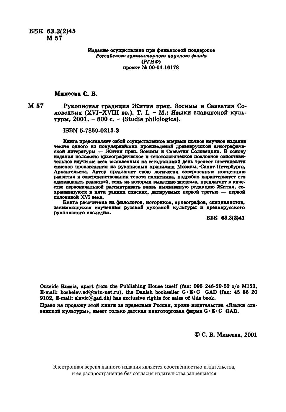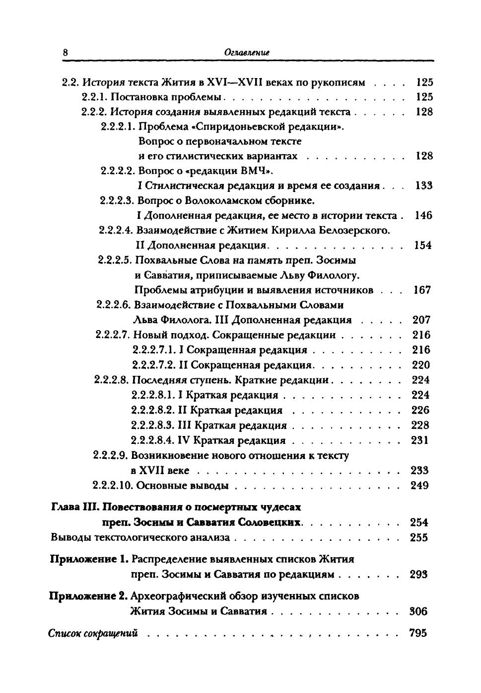 Книга представляет собой осуществленное впервые полное научное издание текста одного из популярнейших произведений древнерусской агиографической литературы — Жития преп. Зосимы и Савватия Соловецких. В основу издания положено археографическое и текстологическое пословное сопоставительное изучение всех выявленных на сегодняшний день трехсот шестидесяти списков произведения из рукописных хранилищ Москвы, -Санкт-Петербурга, Архангельска. Автор предлагает свою логически завершенную концепцию развития и совершенствования текста памятника, подробно характеризует его одиннадцать редакций, семь из которых выделено впервые, предлагает в качестве первоначальной рассматривать вновь выявленную редакцию Жития, сохранившуюся в пяти ранних списках, датируемых первой третью — первой половиной XVI века. Книга рассчитана на филологов, историков, археографов, специалистов, занимающихся изучением русской духовной культуры и древнерусского рукописного наследия.