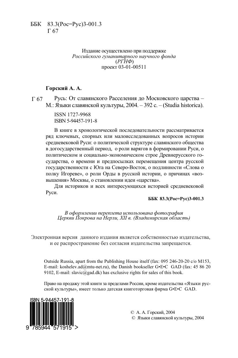 В книге в хронологической последовательности рассматривается ряд ключевых, спорных или малоисследованных вопросов истории средневековой Руси: о политической структуре славянского общества в догосударственный период, о роли варягов в формировании Руси, о политическом и социально-экономическом строе Древнерусского государства, о времени и предпосылках перемещения центра русской государственности с Юга на Северо-Восток, о подлинности "Слова о полку Игореве", о роли Орды в русской истории, о причинах "возвышения" Москвы, о становлении идеи "царства". Для историков и всех интересующихся историей средневековой Руси.