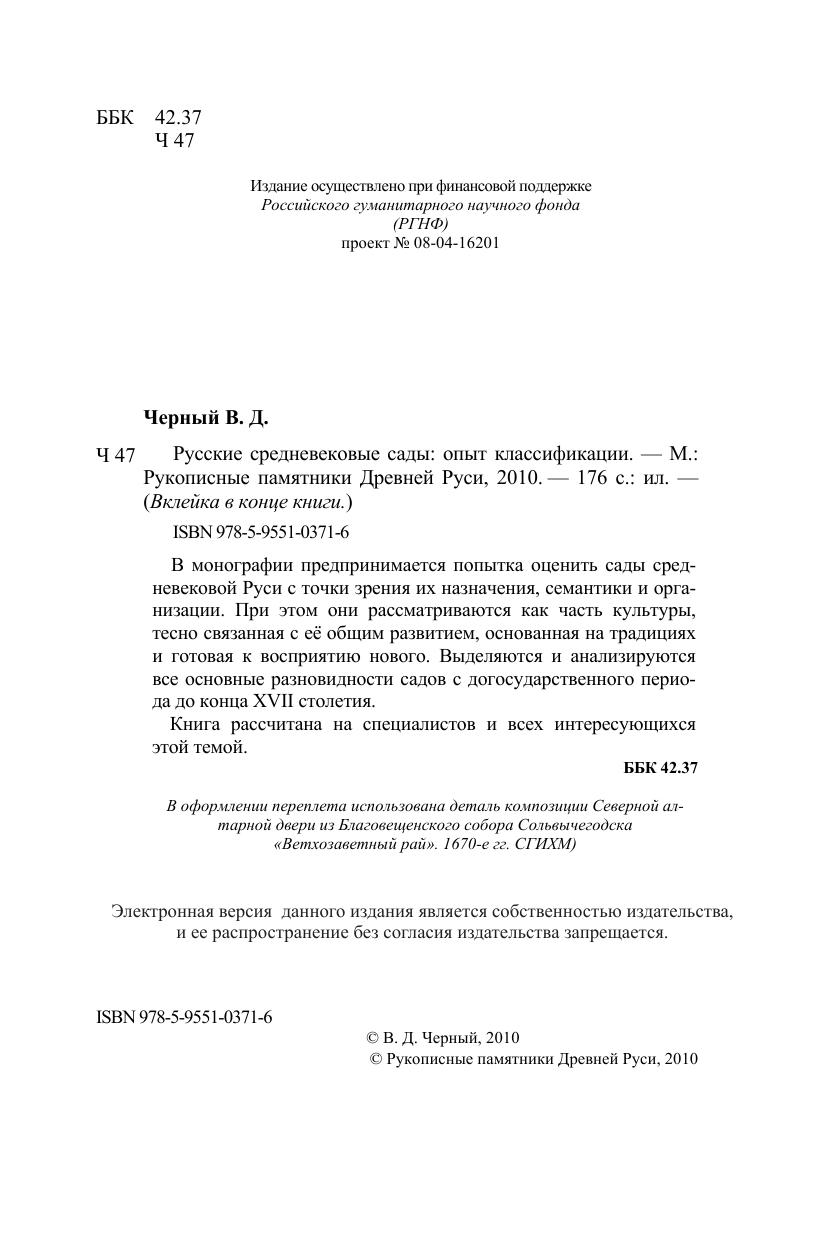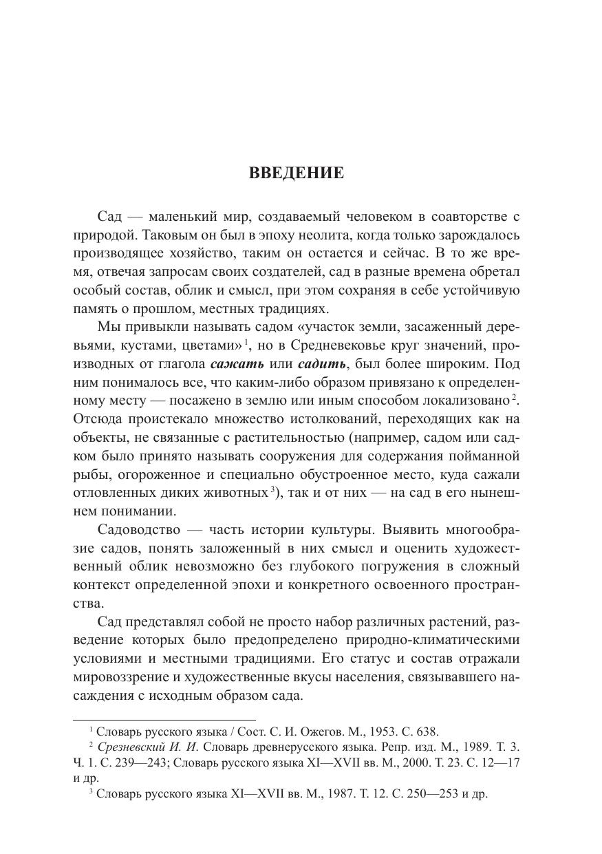В монографии предпринимается попытка оценить сады средневековой Руси с точки зрения их назначения, семантики и организации. При этом они рассматриваются как часть культуры, тесно связанная с ее общим развитием, основанная на традициях и готовая к восприятию нового. Выделяются и анализируются все основные разновидности садов с догосударственного периода до конца XVII столетия. Книга рассчитана на специалистов и всех интересующихся этой темой.