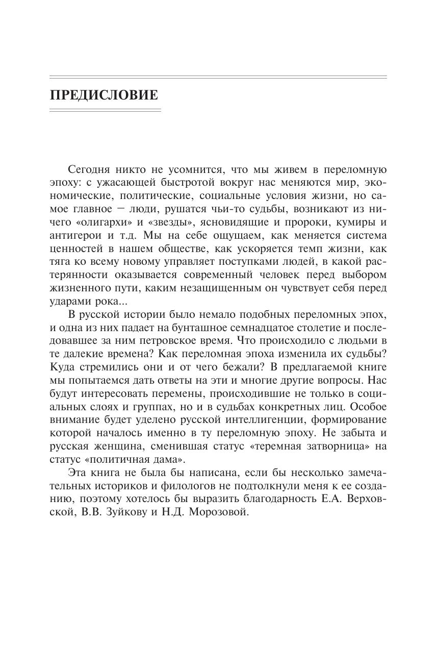 Рассматриваются сложные социокультурные изменения, происходившие с сословиями и социальными группами, а также с отдельными историческими лицами в переломную эпоху в канун петровских преобразований и во время реформ петра великого. прослеживаются судьбы русских царей, представителей белого и черного духовенства, служилых людей, купечества, зодчих, поэтов и писателей, художников, музыкантов, ученых, а также судьбы русских женщин XVII – первой трети XVIII века. Для студентов высших учебных заведений, получающих образование по направлению (специальности) «история». может использоваться в учебном процессе колледжей и школ с углубленной гуманитарной подготовкой. привлечет внимание широкого круга читателей, интересующихся русской историей и культурой.