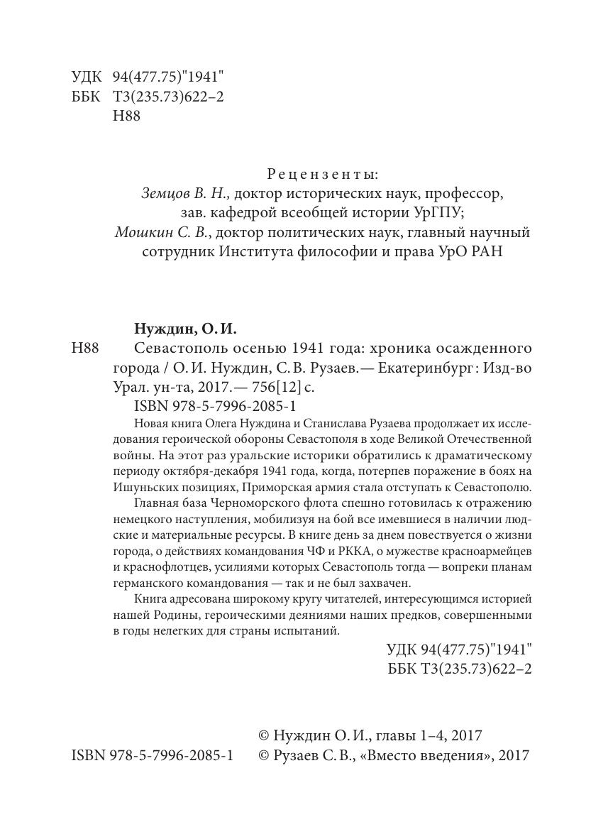 Новая книга Олега Нуждина и Станислава Рузаева продолжает их исследования героической обороны Севастополя в ходе Великой Отечественной войны. На этот раз уральские историки обратились к драматическому периоду октября-декабря 1941 года, когда, потерпев поражение в боях на Ишуньских позициях, Приморская армия стала отступать к Севастополю. Главная база Черноморского флота спешно готовилась к отражению немецкого наступления, мобилизуя на бой все имевшиеся в наличии людские и материальные ресурсы. В книге день за днем повествуется о жизни города, о действиях командования ЧФ и РККА, о мужестве красноармейцев и краснофлотцев, усилиями которых Севастополь тогда — вопреки планам германского командования — так и не был захвачен. Книга адресована широкому кругу читателей, интересующимся историей нашей Родины, героическими деяниями наших предков, совершенными в годы нелегких для страны испытаний.
