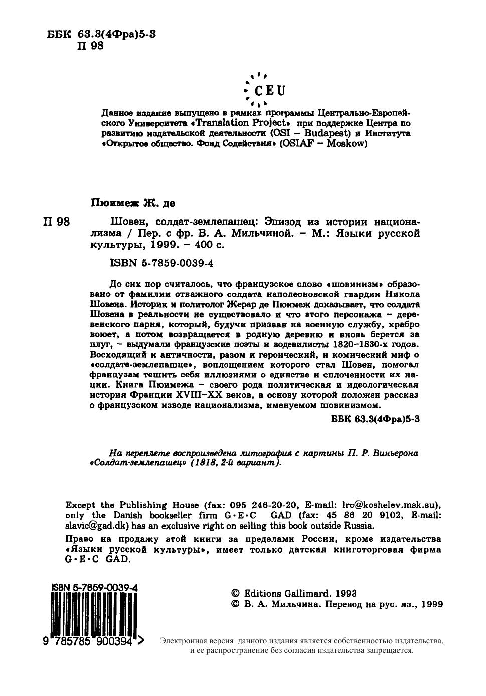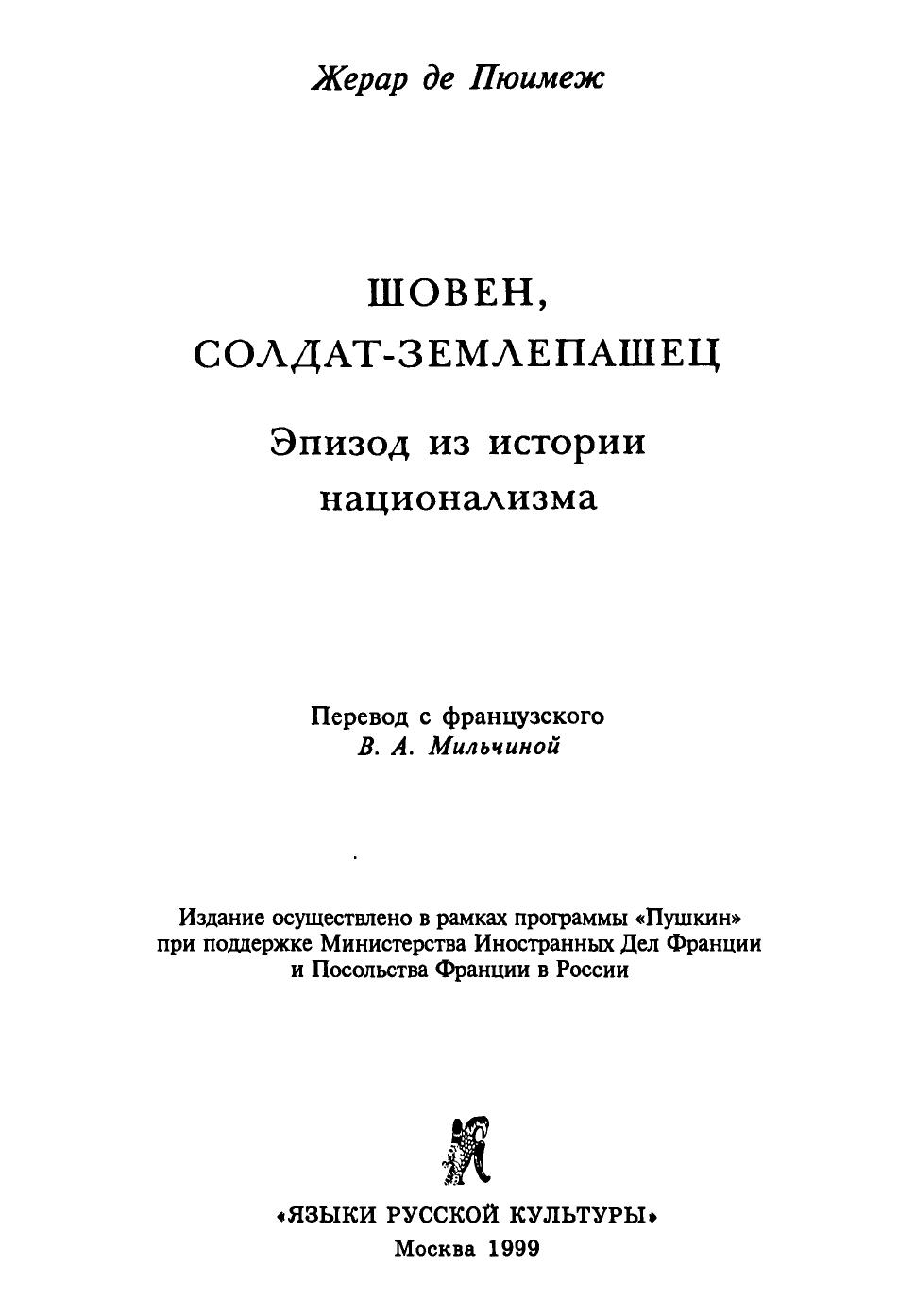 До сих пор считалось, что французское слово "шовинизм" образовано от фамилии отважного солдата наполеоновской гвардии Никола Шовена. Историк и политолог Жерар де Пюимеж доказывает, что солдата Шовена в реальности не существовало и что этого персонажа - деревенского парня, который, будучи призван на военную службу, храбро воюет, а потом возвращается в родную деревню и вновь берется за плуг, - выдумали французские поэты и водевилисты 1820-1830-х годов. Восходящий к античности, разом и героический, и комический миф о "солдате-землепашце", воплощением которого стал Шовен, помогал французам тешить себя иллюзиями о единстве и сплоченности их нации. Книга Пюимежа - своего рода политическая и идеологическая история Франции XVIII-XX века, в основу которой положен рассказ о французском изводе национализма, именуемом шовинизмом.
