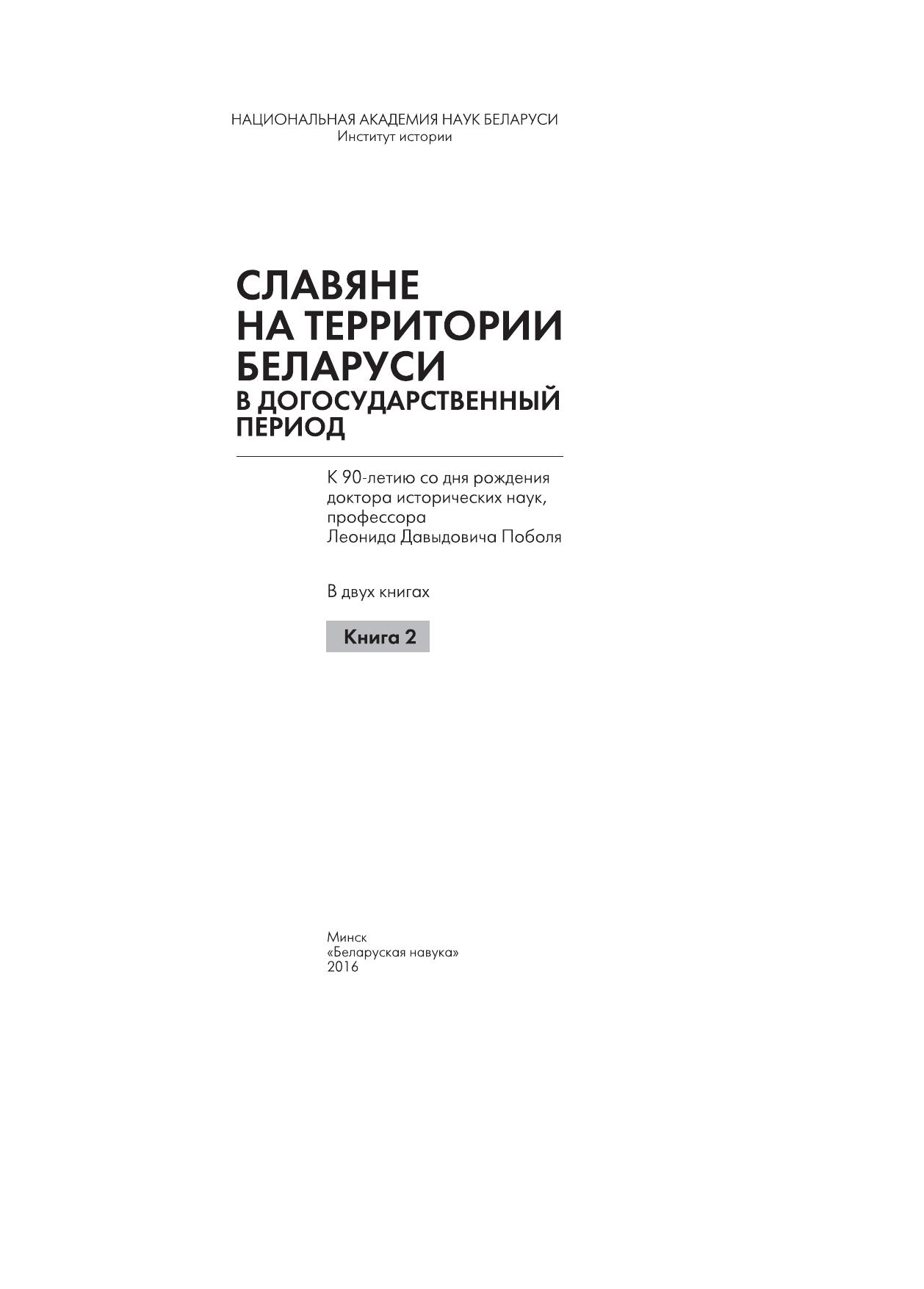 Славяне на территории Беларуси в догосударственный период: к 90-летию со дня рождения Леонида Давыдовича Поболя. В 2 кн. Кн. 2