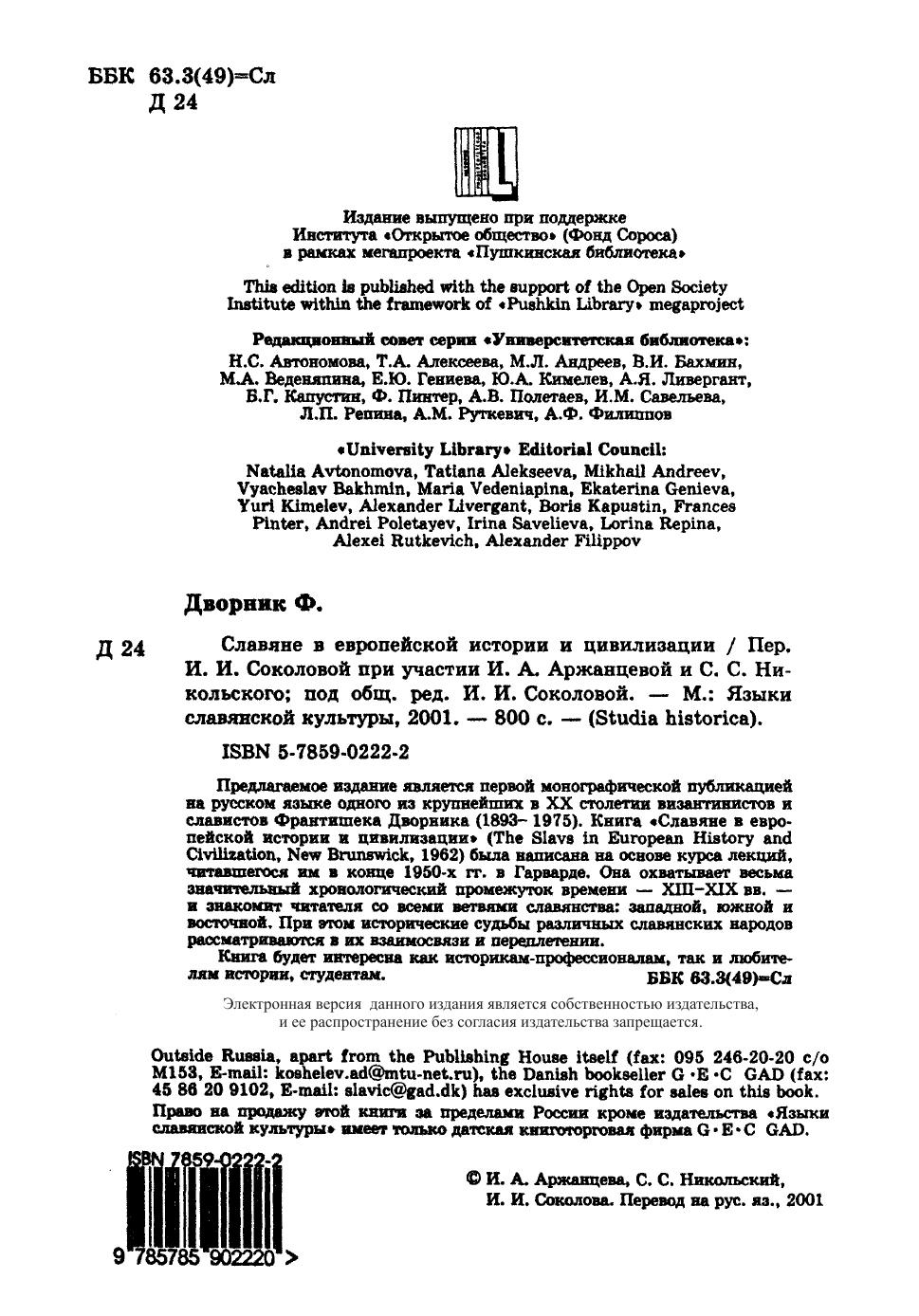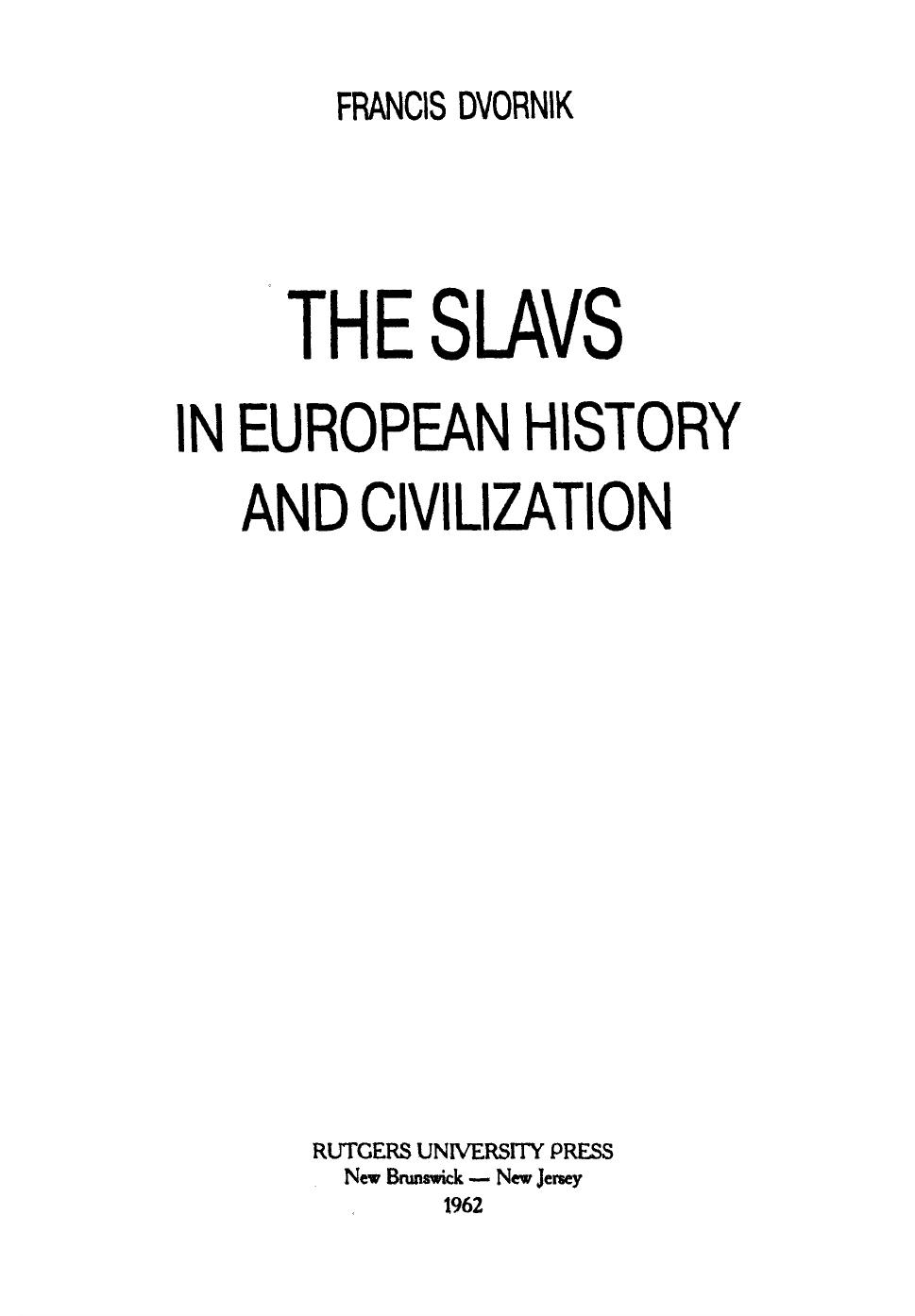 Предлагаемое издание является первой монографической публикацией на русском языке одного из крупнейших в XX столетии византинистов и славистов Франтишека Дворника (1893- 1975). Книга `Славяне в европейской истории и цивилизации` (The Slavs in European History and Civilization, New Brunswick, 1962) была написана на основе курса лекций, читавшегося им в конце 1950-х гг. в Гарварде. Она охватывает весьма значительный хронологический промежуток времени — ХIII-XIX вв. — и знакомит читателя со всеми ветвями славянства: западной, южной и восточной. При этом исторические судьбы различных славянских народов рассматриваются в их взаимосвязи и переплетении. Книга будет интересна как историкам-профессионалам, так и любителям истории, студентам.