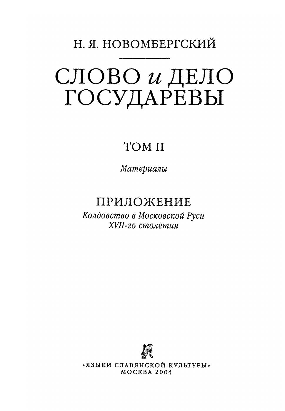 Слово и Дело Государевы: Т. II. Материалы. Приложение. Колдовство в Московской Руси XVII-го столетия