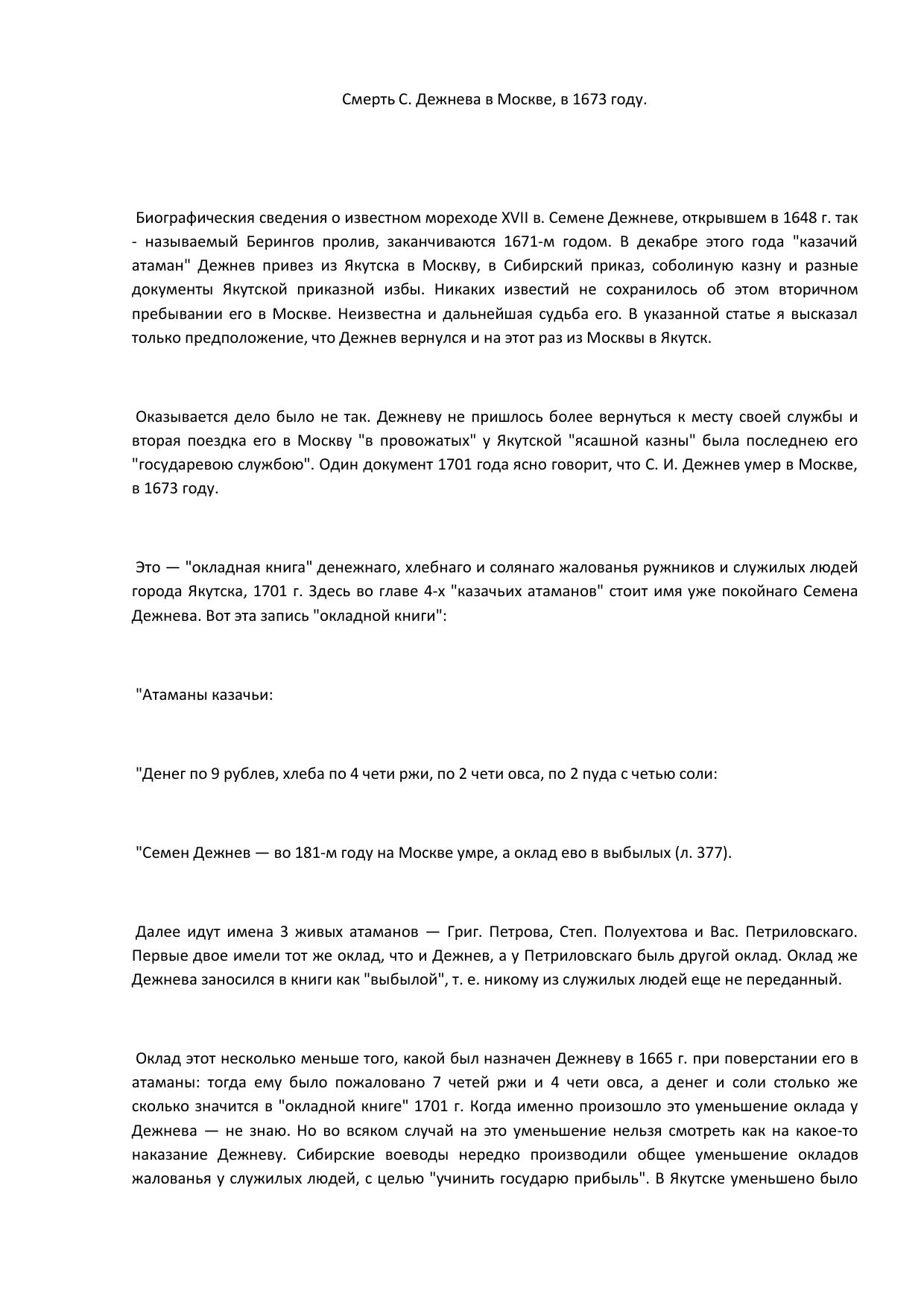 Смерть Семена Дежнева в Москве в 1873 г.