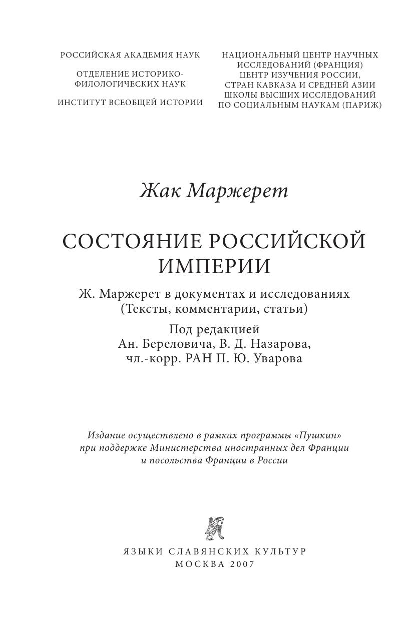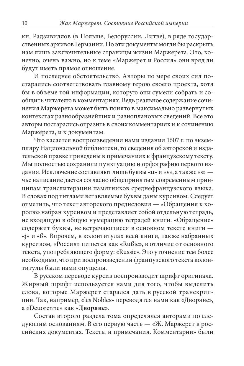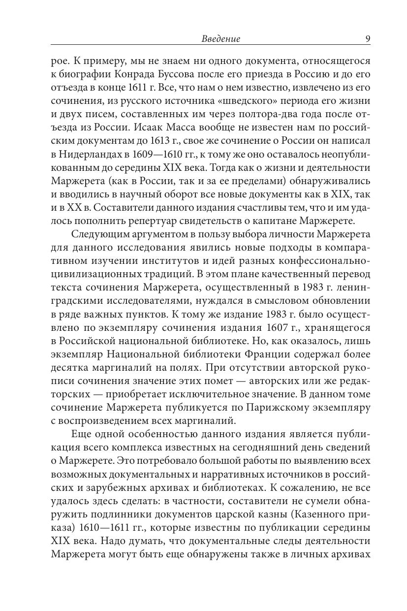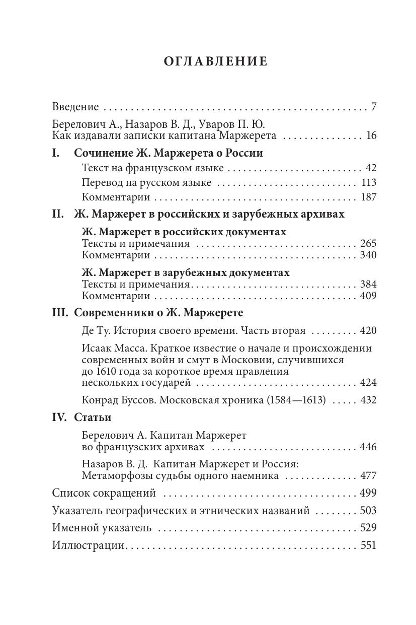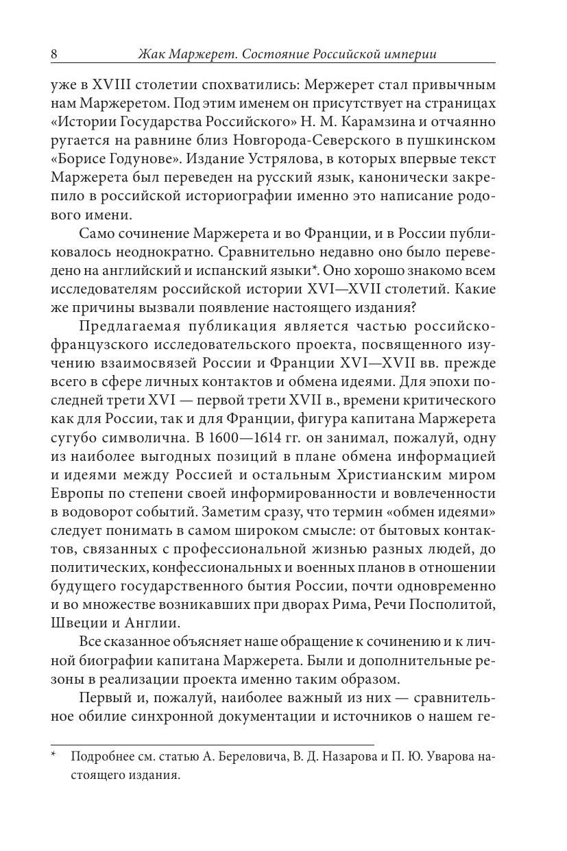 Сочинение капитана Жака Маржерета, служившего Борису Годунову и Лжедмитрию I, содержащее описание «Российской империи» и бурных событий начала Смуты, относится к числу наиболее ярких и познавательных свидетельств иноземцев о России. В издании публикуется заново переведенный текст Маржерета по экземпляру из Национальной библиотеки Франции, снабженный подробными комментариями. Самостоятельный раздел составляют многочисленные документы из российских и зарубежных архивов, относящиеся к деятельности Маржерета в России и за ее пределами. Участие в действиях королевского гарнизона в Москве, намерение примкнуть ко Второму ополчению, попытка склонить английского короля к оккупации русского Севера, приобщенность к большой европейской политике кануна и начала Тридцатилетней войны – эти и другие эпизоды биографии Маржерета и история изданий его текста раскрываются в публикуемых документах и в статьях ведущих историков России и Франции. Книга адресована как специалистам-гуманитариям разного профиля, так и широкому кругу читателей, интересующихся прошлым России в контексте европейской истории.