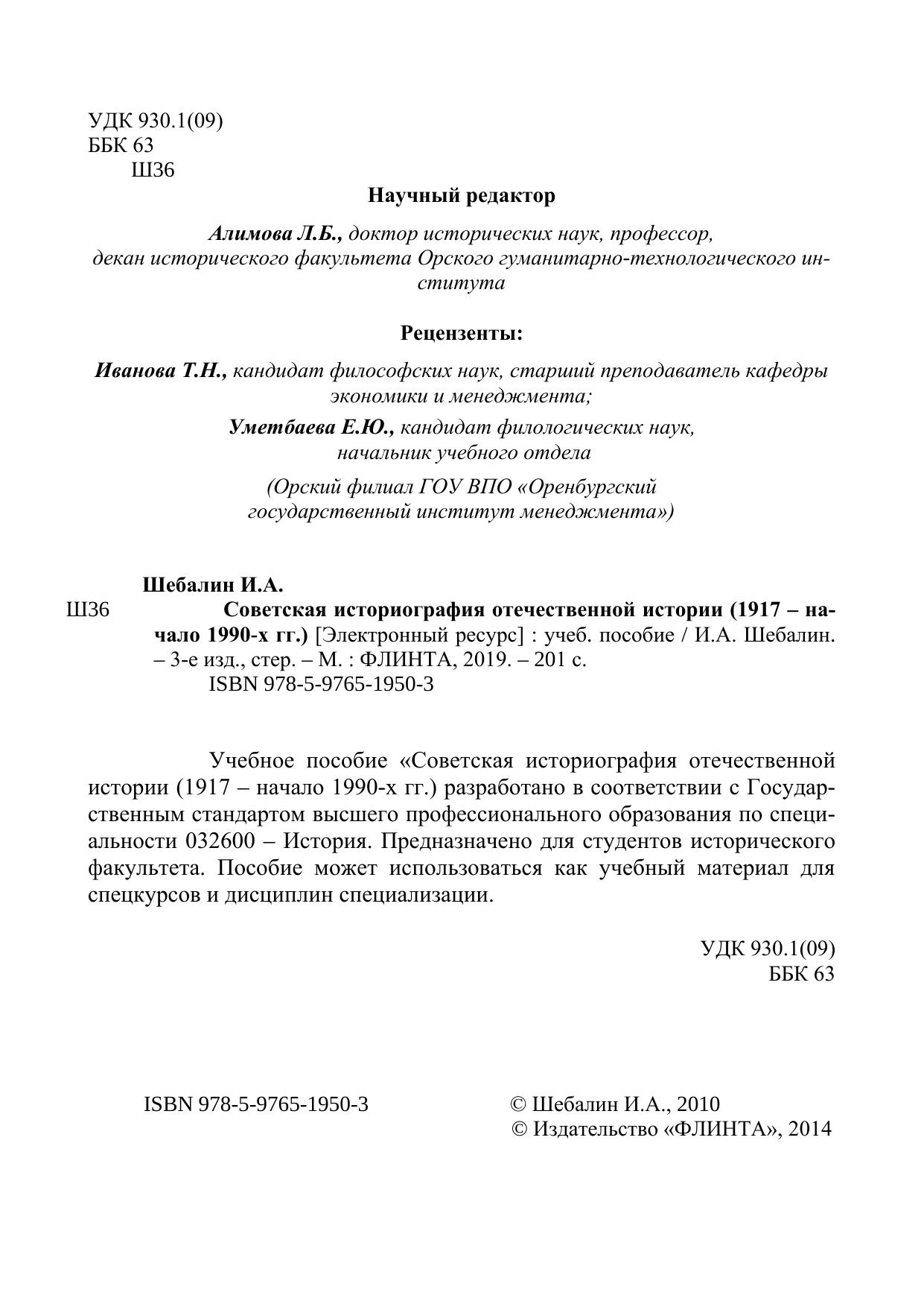 Учебное пособие «Советская историография отечественной истории (1917 – начало 1990-х гг.) разработано в соответствии с Государственным стандартом высшего профессионального образования по специальности 032600 – История. Предназначено для студентов исторического факультета. Пособие может использоваться как учебный материал для спецкурсов и дисциплин специализации.