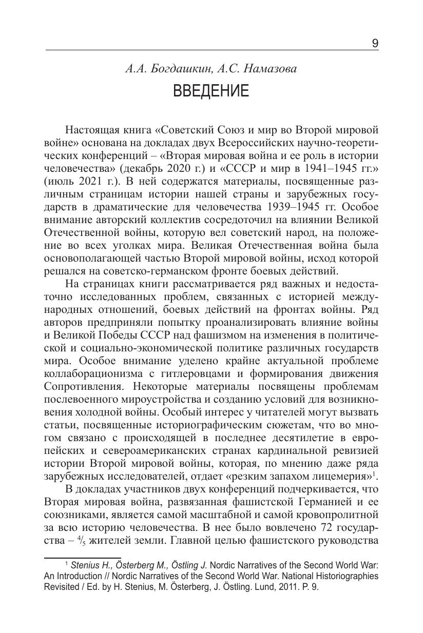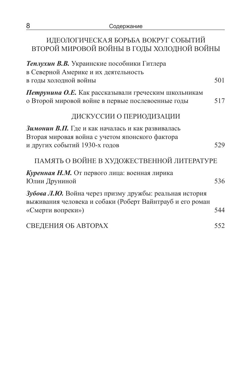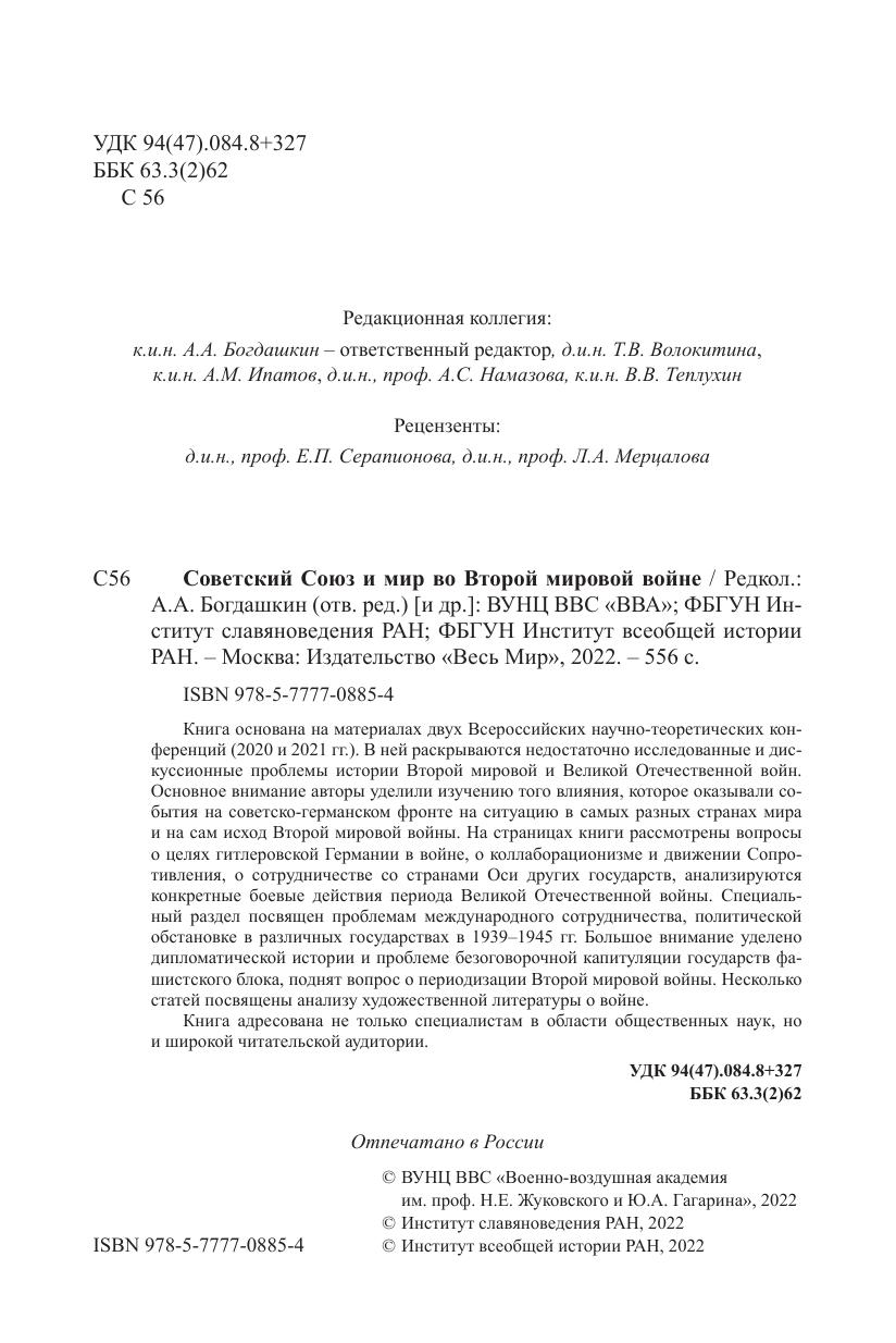 Книга основана на материалах двух Всероссийских научно-теоретических конференций (2020 и 2021 гг.). В ней раскрываются недостаточно исследованные и дискуссионные проблемы истории Второй мировой и Великой Отечественной войн. Основное внимание авторы уделили изучению того влияния, которое оказывали события на советско-германском фронте на ситуацию в самых разных странах мира и на сам исход Второй мировой войны. На страницах книги рассмотрены вопросы о целях гитлеровской Германии в войне, о коллаборационизме и движении Сопротивления, о сотрудничестве со странами Оси других государств, анализируются конкретные боевые действия периода Великой Отечественной войны. Специальный раздел посвящен проблемам международного сотрудничества, политической обстановке в различных государствах в 1939–1945 гг. Большое внимание уделено дипломатической истории и проблеме безоговорочной капитуляции государств фашистского блока, поднят вопрос о периодизации Второй мировой войны. Несколько статей посвящены анализу художественной литературы о войне. Книга адресована не только специалистам в области общественных наук, но и широкой читательской аудитории.