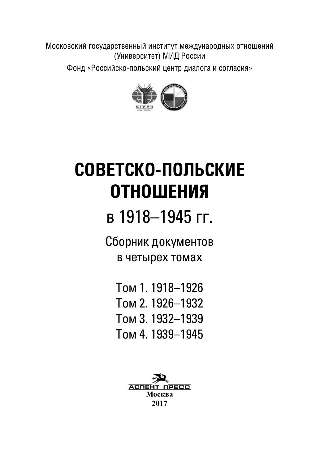 Подготовленная историками МГИМО, МГУ имени М. В. Ломоносова и Института всеобщей истории РАН четырехтомная публикация «Советско-польские отношения в 1918–1945 гг.» включает в свой состав извлеченные из отечественных хранилищ документы и материалы, в большей своей части ранее не опубликованные. Предлагаемое издание существенно дополняет ставший классическим восьмитомник «Документы и материалы по истории советско-польских отношений» (М., 1963–1974). Издание предназначено для специалистов-историков, преподавателей, аспирантов и студентов, изучающих историю международных отношений в ХХ веке, а также всем, кто хочет самостоятельно разобраться в перипетиях непростого, а временами и трагического сосуществования Советского и Польского государств.
