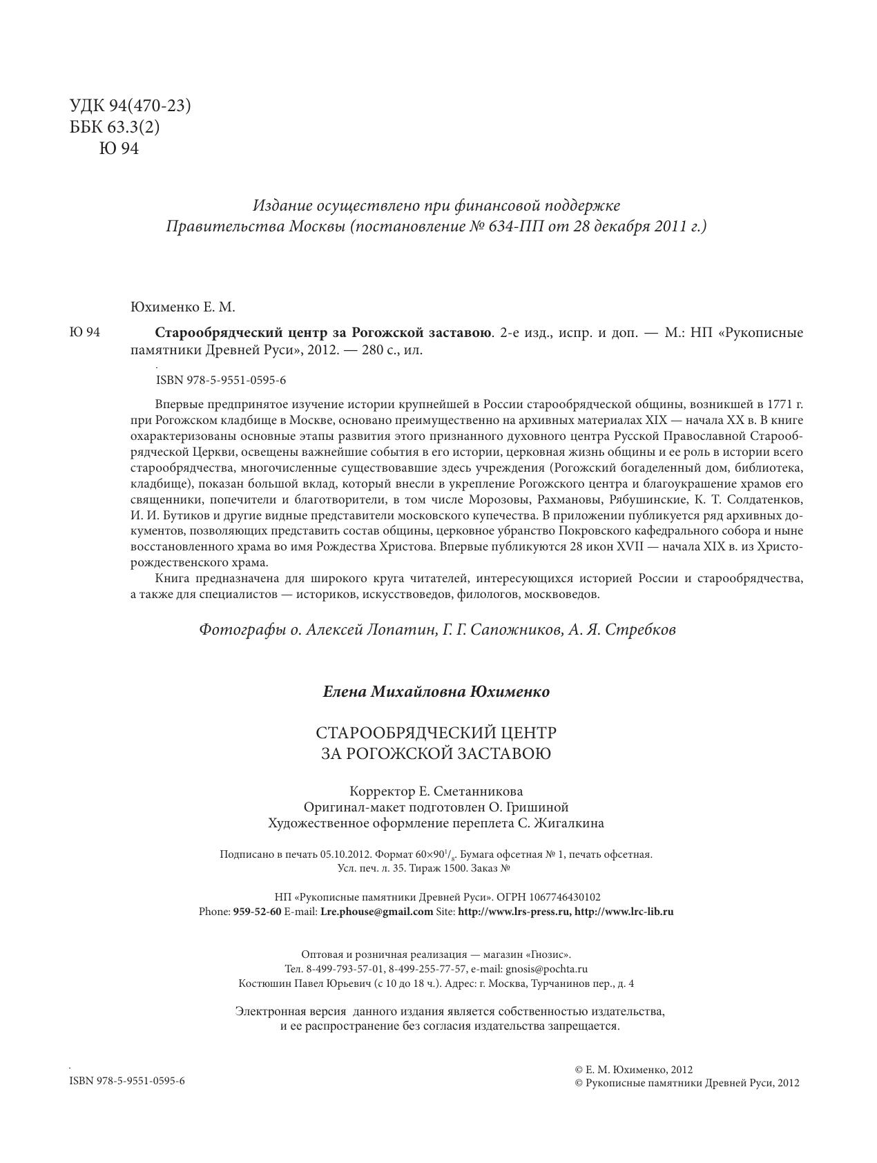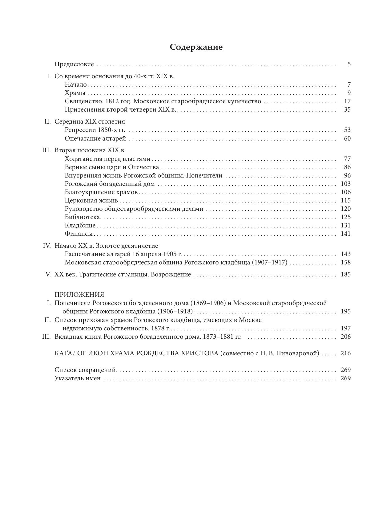Впервые предпринятое изучение истории крупнейшей в России старообрядческой общины, возникшей в 1771 г. при Рогожском кладбище в Москве, основано преимущественно на архивных материалах XIX — начала XX в. В книге охарактеризованы основные этапы развития этого признанного духовного центра Русской Православной Старообрядческой Церкви, освещены важнейшие события в его истории, церковная жизнь общины и ее роль в истории всего старообрядчества, многочисленные существовавшие здесь учреждения (Рогожский богаделенный дом, библиотека, кладбище), показан большой вклад, который внесли в укрепление Рогожского центра и благоукрашение храмов его священники, попечители и благотворители, в том числе Морозовы, Рахмановы, Рябушинские, К. Т. Солдатенков, И. И. Бутиков и другие видные представители московского купечества. В приложении публикуется ряд архивных документов, позволяющих представить состав общины, церковное убранство Покровского кафедрального собора и ныне восстановленного храма во имя Рождества Христова. Впервые публикуются 28 икон XVII — начала XIX в. из Христорождественского храма. Книга предназначена для широкого круга читателей, интересующихся историей России и старообрядчества, а также для специалистов — историков, искусствоведов, филологов, москвоведов.