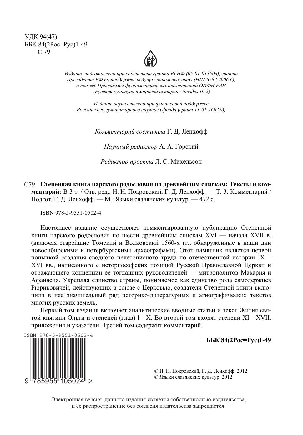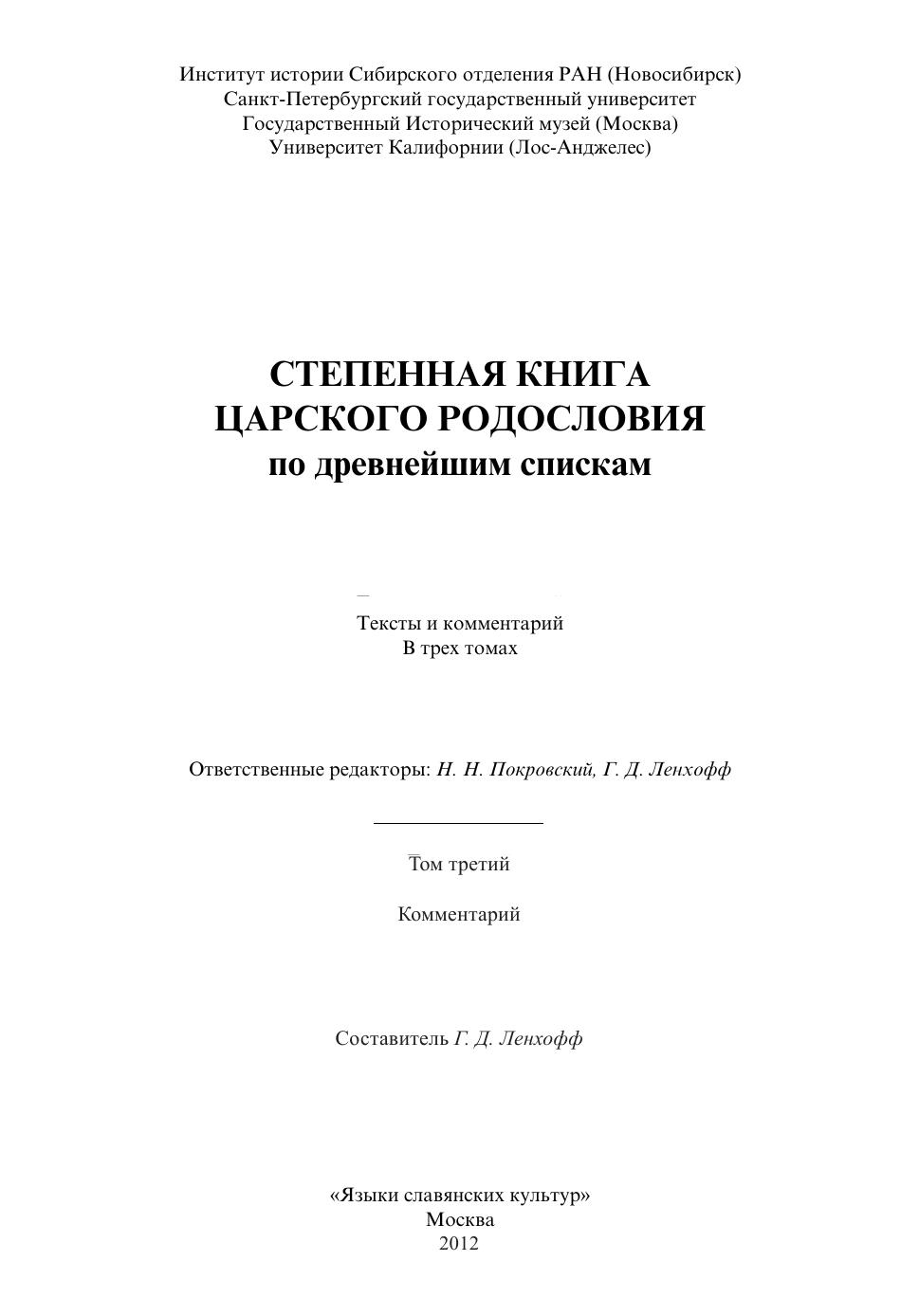 Настоящее издание осуществляет комментированную публикацию Степенной книги царского родословия по шести древнейшим спискам XVI - начала XVII в. (включая старейшие Томский и Волковский 1060-х гг., обнаруженные в наши дни новосибирскими и петербургскими археографами). Этот памятник является первой попыткой создания сводного нелетописного труда по отечественной истории -- XVI в в., написанного с историософских позиций Русской Православной Церкви и отражающего концепции ее тогдашних руководителей - митрополитов Макария и Афанасия. Укрепляя единство страны, понимаемое как единство рода самодержцев Рюриковичей, действующих в союзе с Церковью, создатели Степенной книги включили в нее, значительный ряд историко-литературных и агиографических текстов многих русских земель. Первый том издания включает аналитические вводные статьи и текст Жития святой княгини Ольги и степеней (глав) I-X. Во второй том входят степени XI-XVII, приложения и указатели. Третий том содержит комментарий.