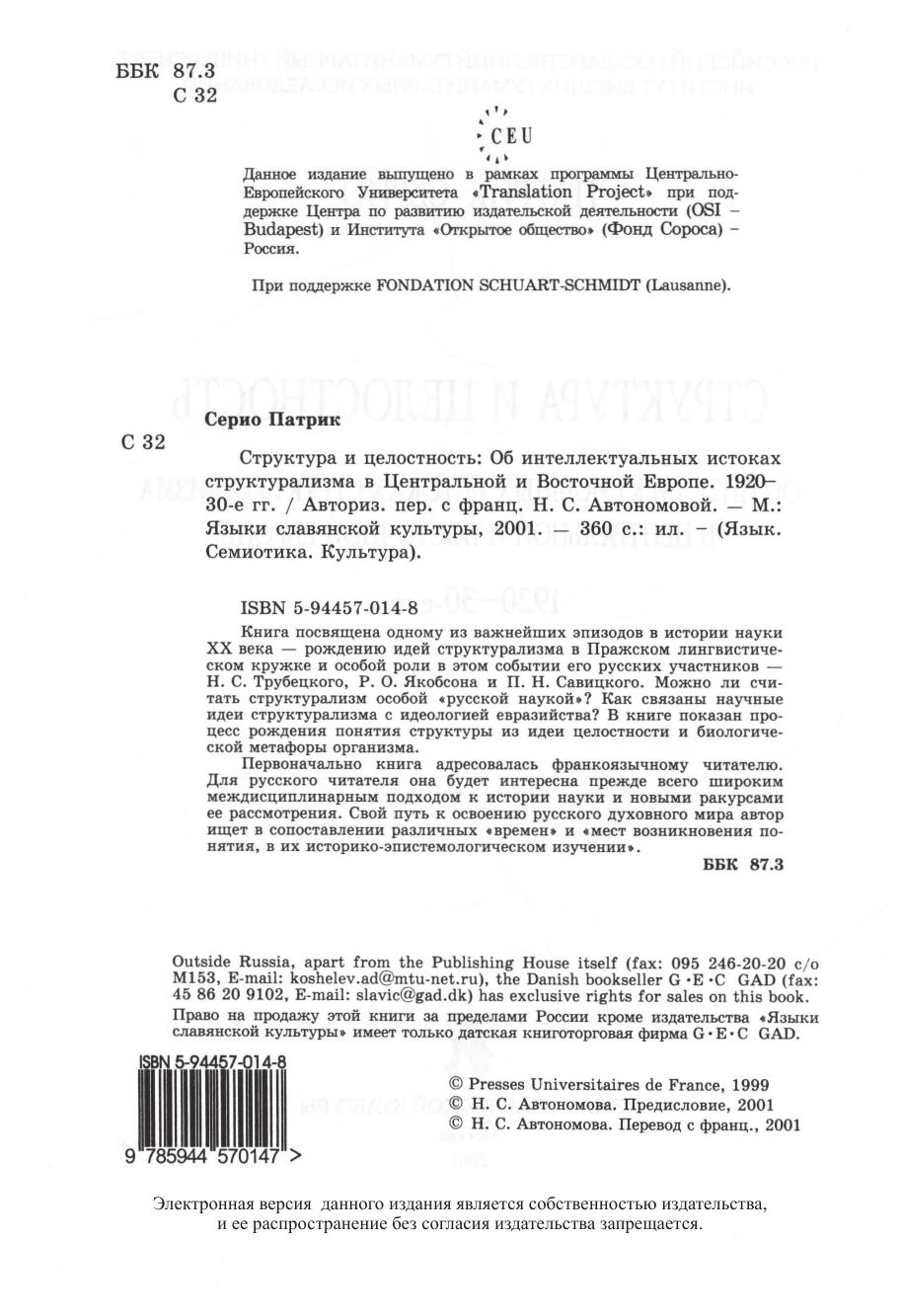 Книга посвящена одному из важнейших эпизодов в истории науки XX века – рождению идей структурализма в Пражском лингвистическом кружке и особой роли в этом событии его русских участников – Н. С. Трубецкого, Р. О. Якобсона и П. Н. Савицкого. Можно ли считать структурализм особой «русской наукой»? Как связаны научные идеи структурализма с идеологией евразийства? В книге показан процесс рождения понятия структуры из идеи целостности и биологической метафоры организма. Первоначально книга адресовалась франкоязычному читателю. Для русского читателя она будет интересна прежде всего широким междисциплинарным подходом к истории науки и новыми ракурсами ее рассмотрения. Свой путь к освоению русского духовного мира автор ищет в сопоставлении различных «времен» и «мест возникновения понятия, в их историко-эпистемологическом изучении».