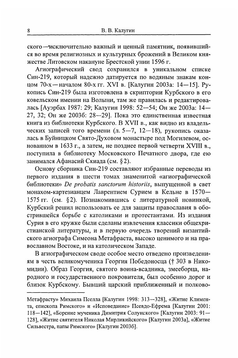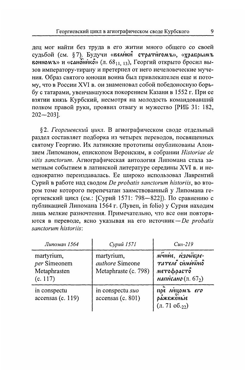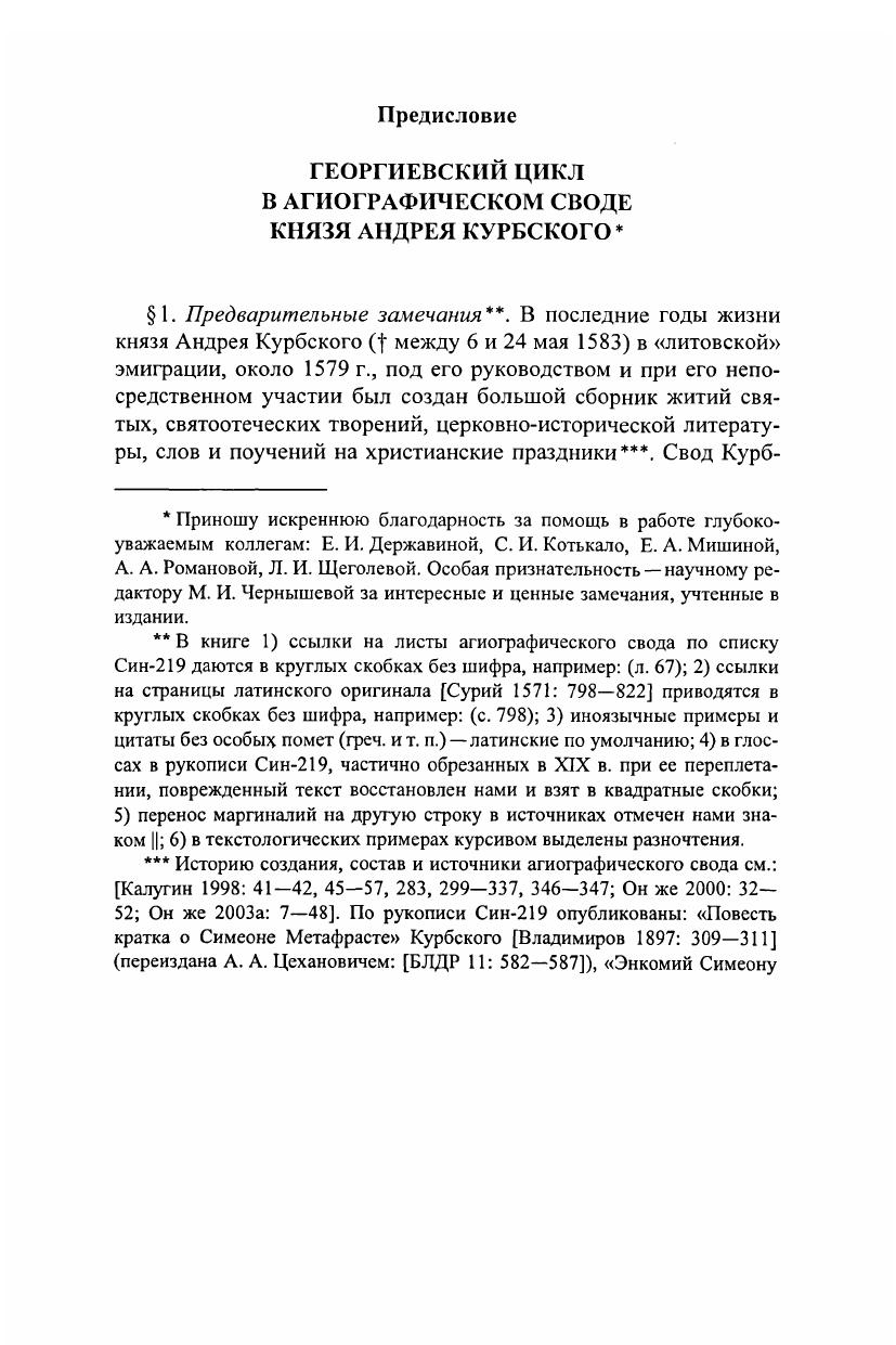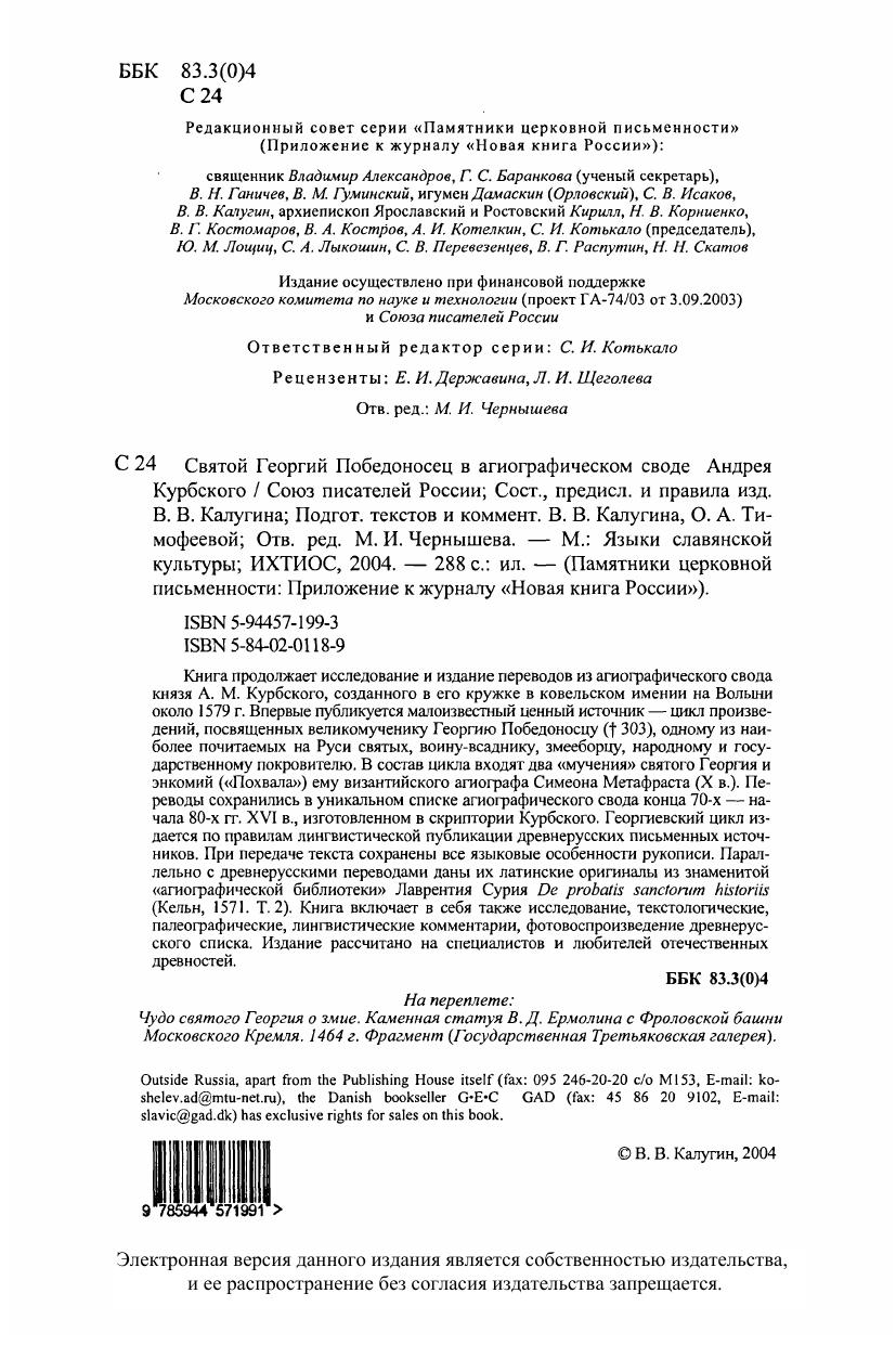 Книга продолжает исследование и издание переводов из агиографического свода князя А. М. Курбского, созданного в его кружке в ковельском имении на Волыни около 1579 г. Впервые публикуется малоизвестный ценный источник – цикл произведений, посвященных великомученику Георгию Победоносцу (†303), одному из наиболее почитаемых на Руси святых, воину-всаднику, змееборцу, народному и государственному покровителю. В состав цикла входят два «мучения» святого Георгия и энкомий («Похвала») ему византийского агиографа Симеона Метафраста (X в.). Переводы сохранились в уникальном списке агиографического свода конца 70-х – начала 80-х гг. XVI в., изготовленном в скриптории Курбского. Георгиевский цикл издается по правилам лингвистической публикации древнерусских письменных источников. При передаче текста сохранены все языковые особенности рукописи. Параллельно с древнерусскими переводами даны их латинские оригиналы из знаменитой «агиографической библиотеки» Лаврентия Сурия De probatis sanctorum historiis (Кельн, 1571. Т. 2). Книга включает в себя также исследование, текстологические, палеографические, лингвистические комментарии, фотовоспроизведение древнерусского списка. Издание рассчитано на специалистов и любителей отечественных древностей.