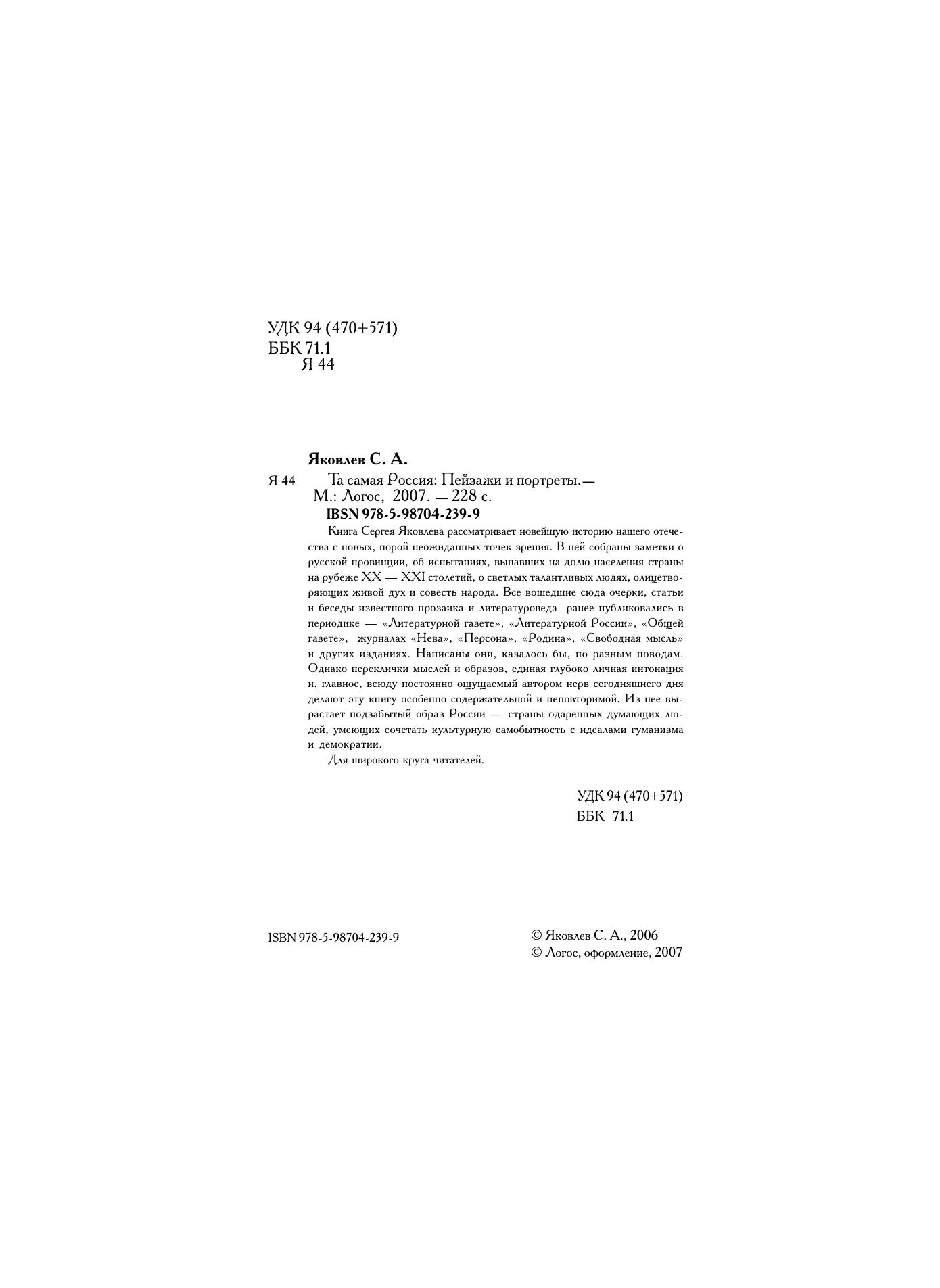 Книга Сергея Яковлева рассматривает новейшую историю нашего отечества с новых, порой неожиданных точек зрения. В ней собраны заметки о русской провинции, об испытаниях, выпавших на долю населения страны на рубеже XX — XXI столетий, о светлых талантливых людях, олицетворяющих живой дух и совесть народа. Все вошедшие сюда очерки, статьи и беседы известного прозаика и литературоведа ранее публиковались в периодике — «Литературной газете», «Литературной России», «Общей газете», журналах «Нева», «Персона», «Родина», «Свободная мысль» и других изданиях. Написаны они, казалось бы, по разным поводам. Однако переклички мыслей и образов, единая глубоко личная интонация и, главное, всюду постоянно ощущаемый автором нерв сегодняшнего дня делают эту книгу особенно содержательной и неповторимой. Из нее вырастает подзабытый образ России — страны одаренных думающих людей, умеющих сочетать культурную самобытность с идеалами гуманизма и демократии. Для широкого круга читателей.