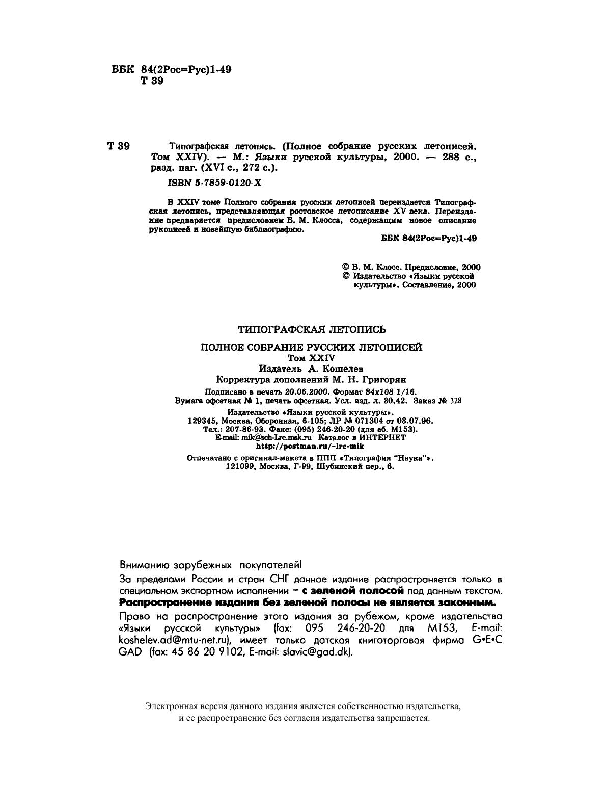 В ХХIV томе Полного собрания русских летописей переиздается Типографская летопись, представляющая ростовское летописание XV века. Переиздание предваряется предисловием Б.М. Клосса, содержащим новое описание рукописей и новейшую библиографию. Книга предназначена для историков, филологов и всех интересующихся древнерусской литературой и историей культуры.