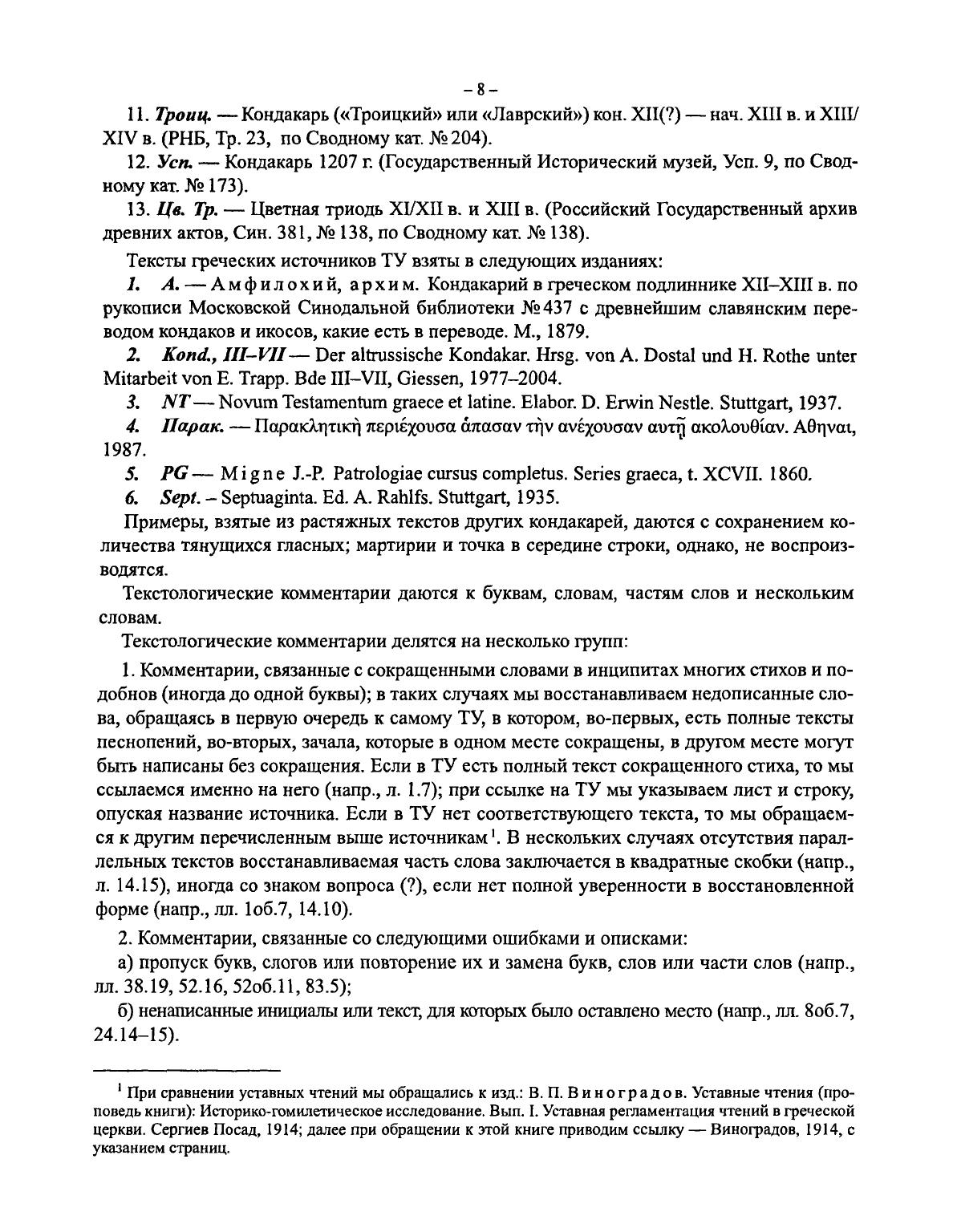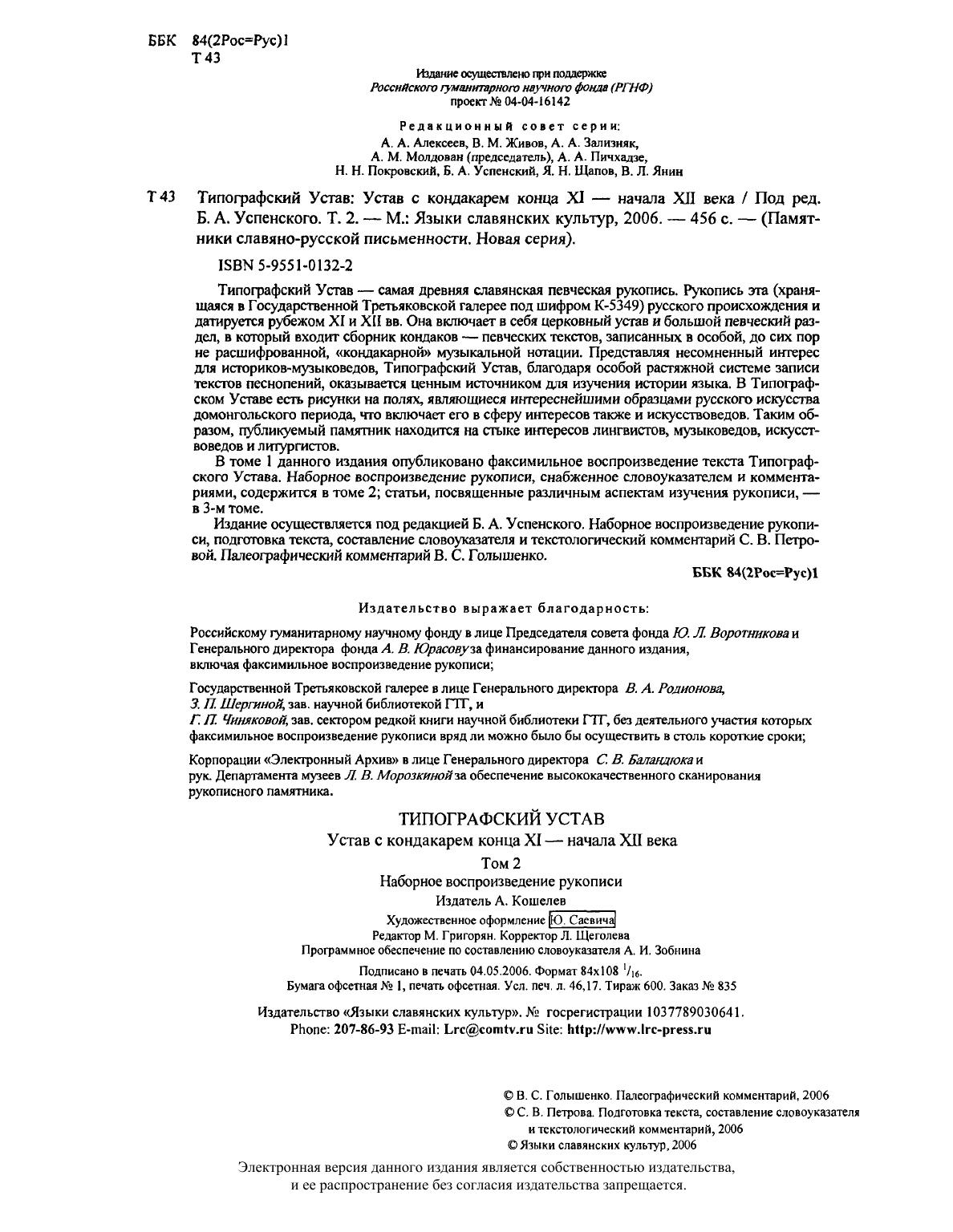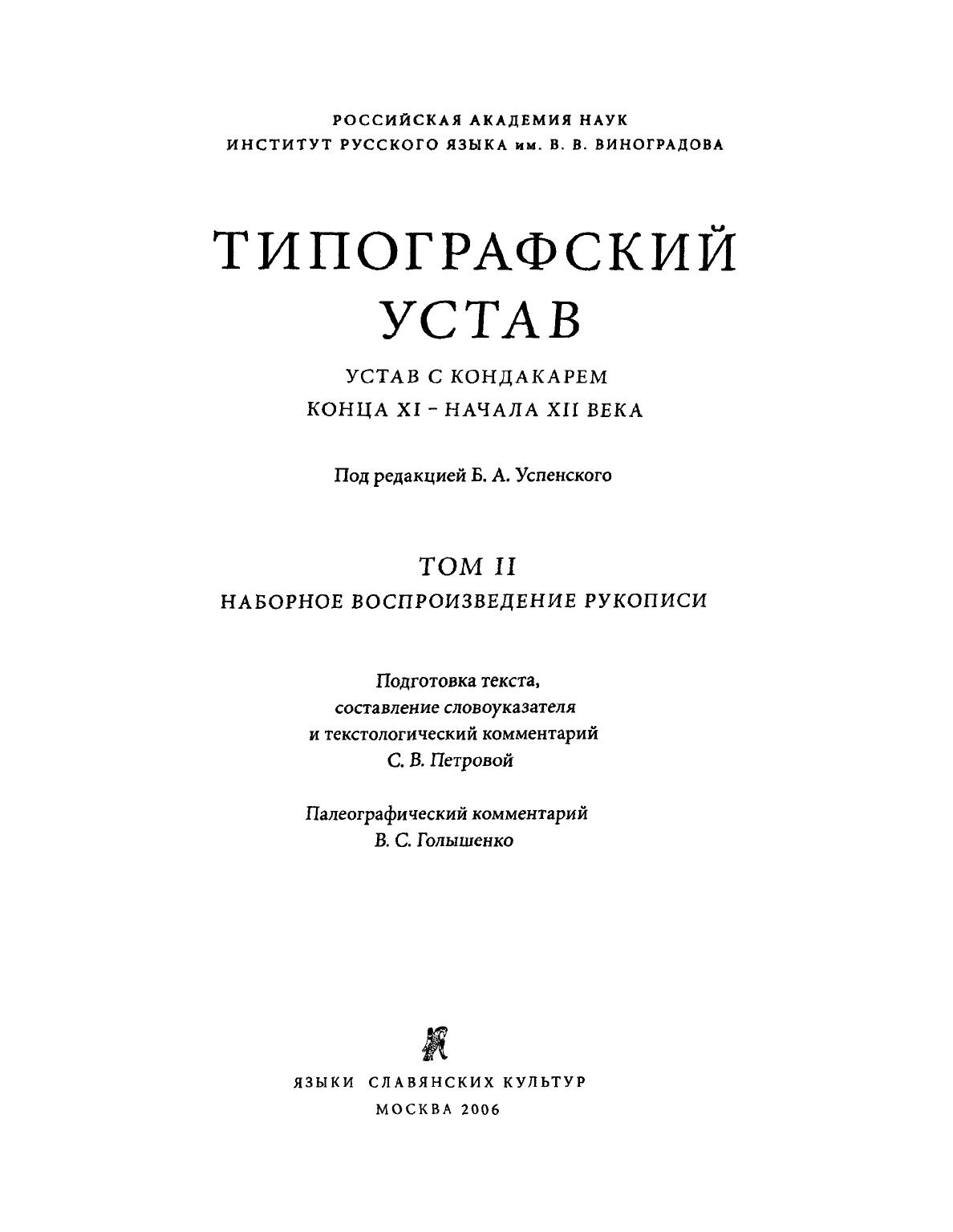 Типографский Устав - самая древняя славянская певческая рукопись. Рукопись эта (хранящаяся в Государственной Третьяковской галерее под шифром К-5349) русского происхождения и датируется рубежом XI и XII вв. Она включает в себя церковный устав и большой певческий раздел, в который входит сборник кондаков - певческих текстов, записанных в особой, до сих пор не расшифрованной, "кондакарной" музыкальной нотации. Представляя несомненный интерес для историков-музыковедов, Типографский Устав, благодаря особой растяжной системе записи текстов песнопений, оказывается ценным источником для изучения истории языка. В Типографском Уставе есть рисунки на полях, являющиеся интереснейшими образцами русского искусства домонгольского периода, что включает его в сферу интересов также и искусствоведов. Таким образом, публикуемый памятник находится на стыке интересов лингвистов, музыковедов, искусствоведов и литургистов. В томе 1 данного издания опубликовано факсимильное воспроизведение текста Типографского Устава. Наборное воспроизведение рукописи, снабженное словоуказателем и комментариями, содержится в томе 2, статьи, посвященные различным аспектам изучения рукописи, - в 3-м томе. Издание осуществляется под редакцией Б. А. Успенского. Наборное воспроизведение рукописи, подготовка текста, составление словоуказателя и текстологический комментарий С. В. Петровой. Палеографический комментарий В. С. Голышенко.