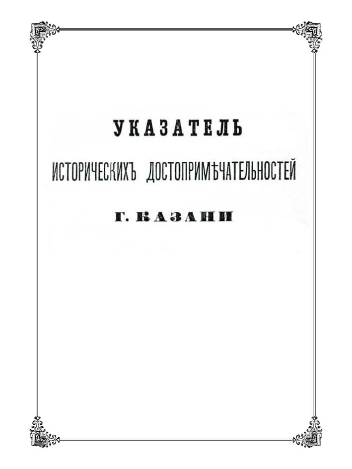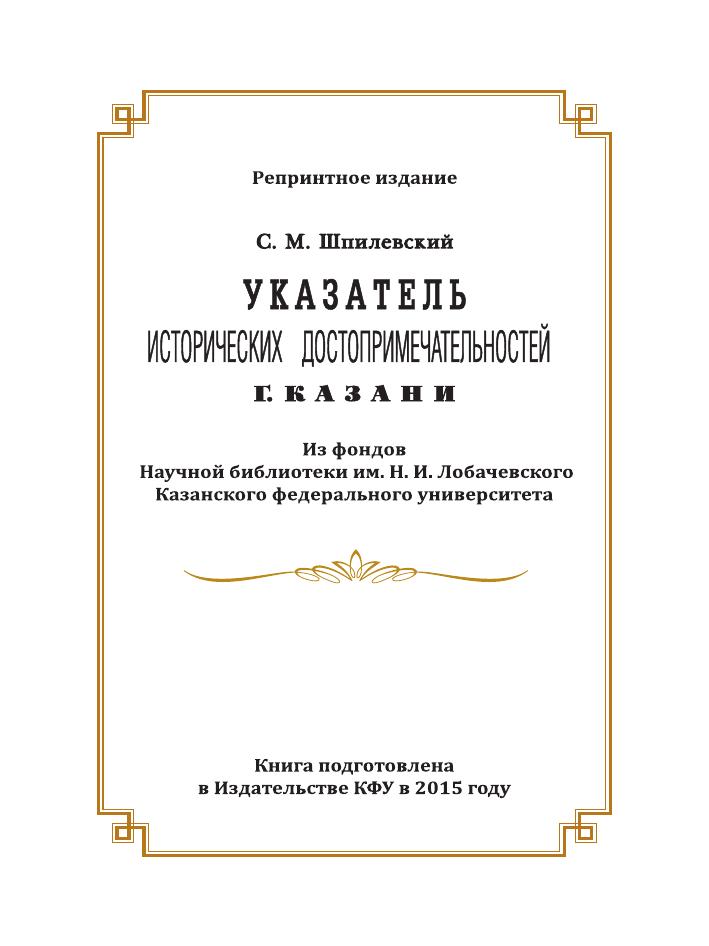 Переиздание первого в истории Казани путеводителя, вышедшего в свет в 1873 г., отправляет в путешествие по сформированным на его страницах первым экскурсионным маршрутам: от древних архитектурных памятников к новым «храмам» - образовательным учреждениям. С.М. Шпилевский отразил стереотипы восприятия истории города и дал импульс к их переосмыслению. «Указатель…», вопреки своему названию, визуально не продемонстрировал богатство культурного наследия Казани, что позволяет сейчас восполнить уникальное приложение в виде репродукций гравюр и фотографий, описанных С.М. Шпилевским достопримечательностей 1840-1890-х гг.