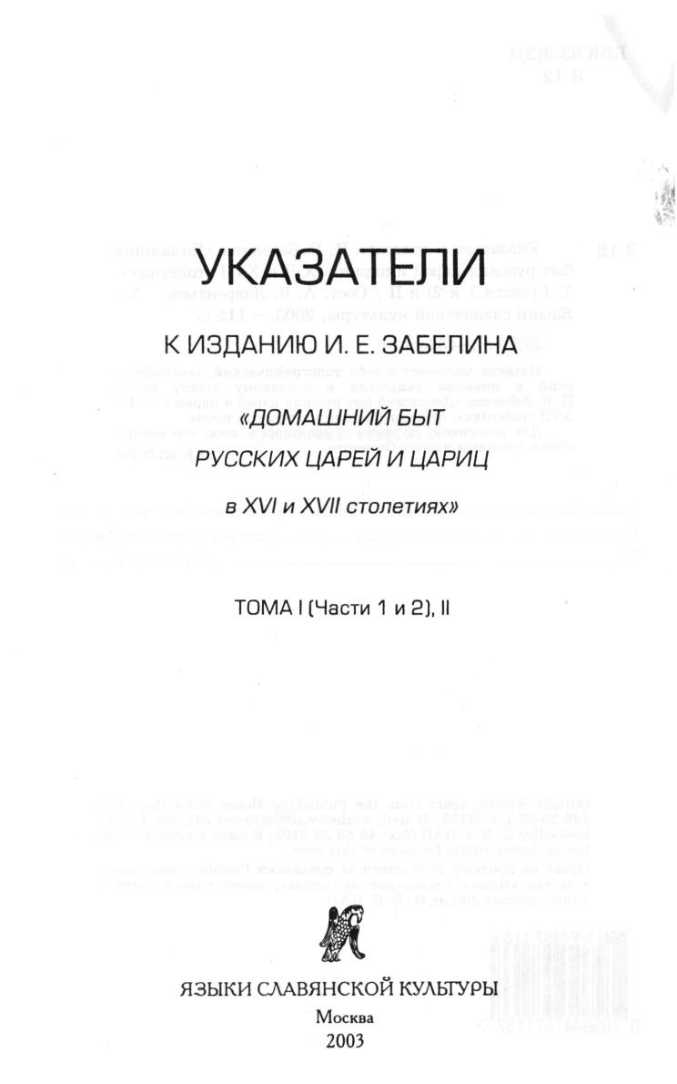Указатели к изданию И.Е. Забелина: Домашний быт русских царей и цариц в XVI и XVII столетиях. Том 1 (части 1 и 2) и 2