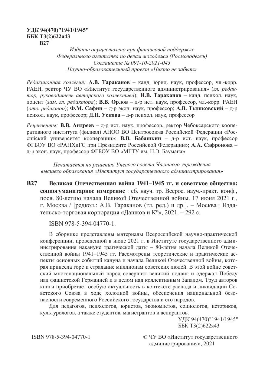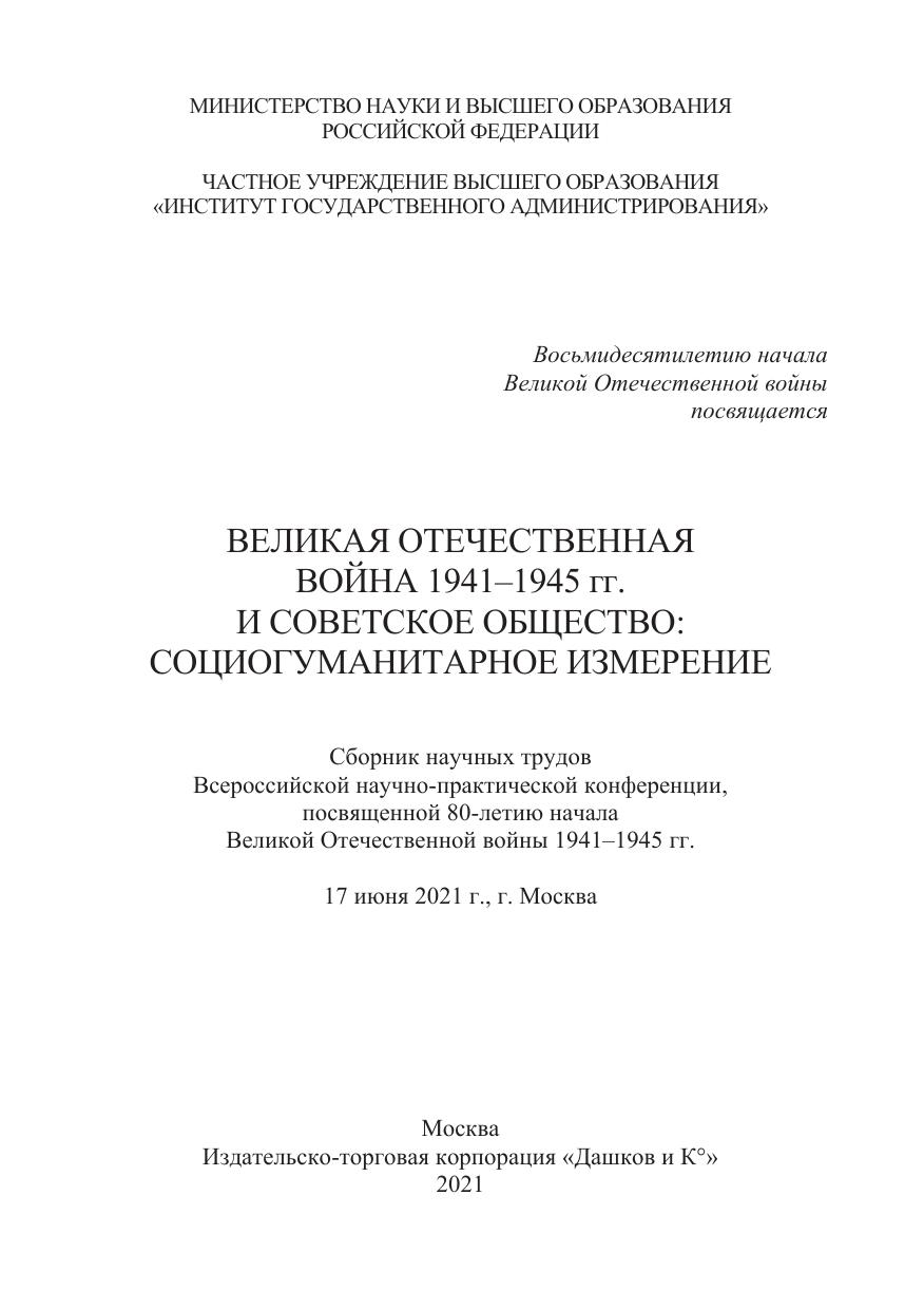 Великая Отечественная война 1941-1945 гг. и советское общество: социогуманитарное измерение: Сборник научных трудов Всероссийской научно-практической конференции