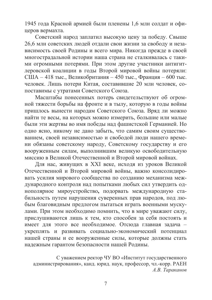 В сборнике представлены материалы Всероссийской научно-практической конференции, проведенной в июне 2021 г. в Институте государственного адми- нистрирования накануне трагической даты – 80-летия начала Великой Отечественной войны 1941–1945 гг. Рассмотрены теоретические и практические аспекты основных событий кануна и начала Великой Отечественной войны, которая принесла горе и страдание миллионам советских людей. В этой войне советский многонациональный