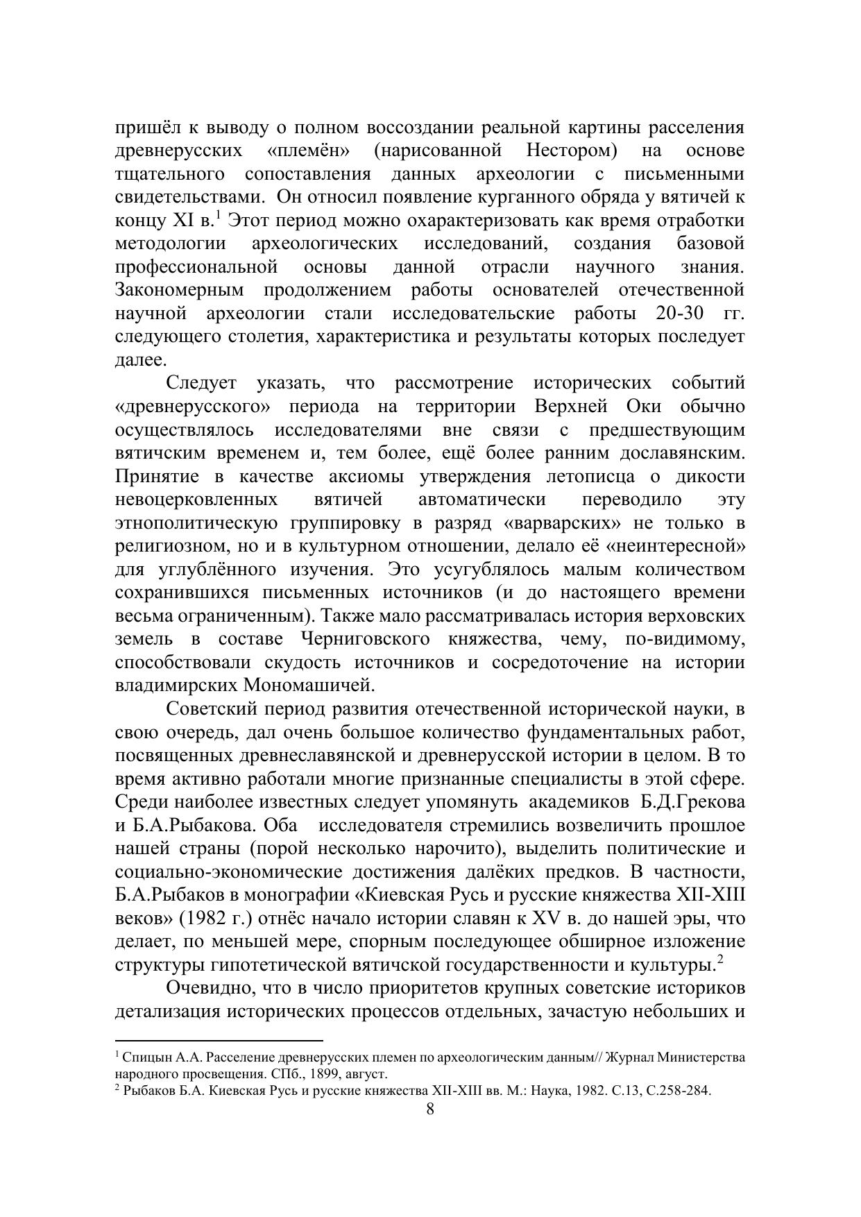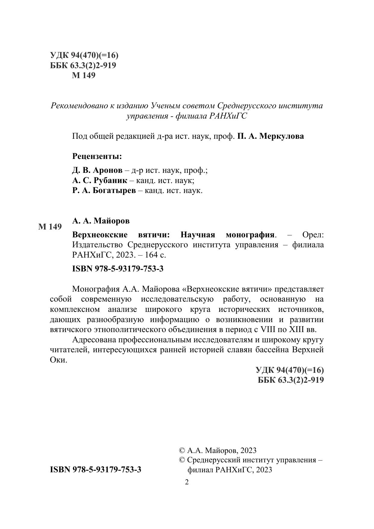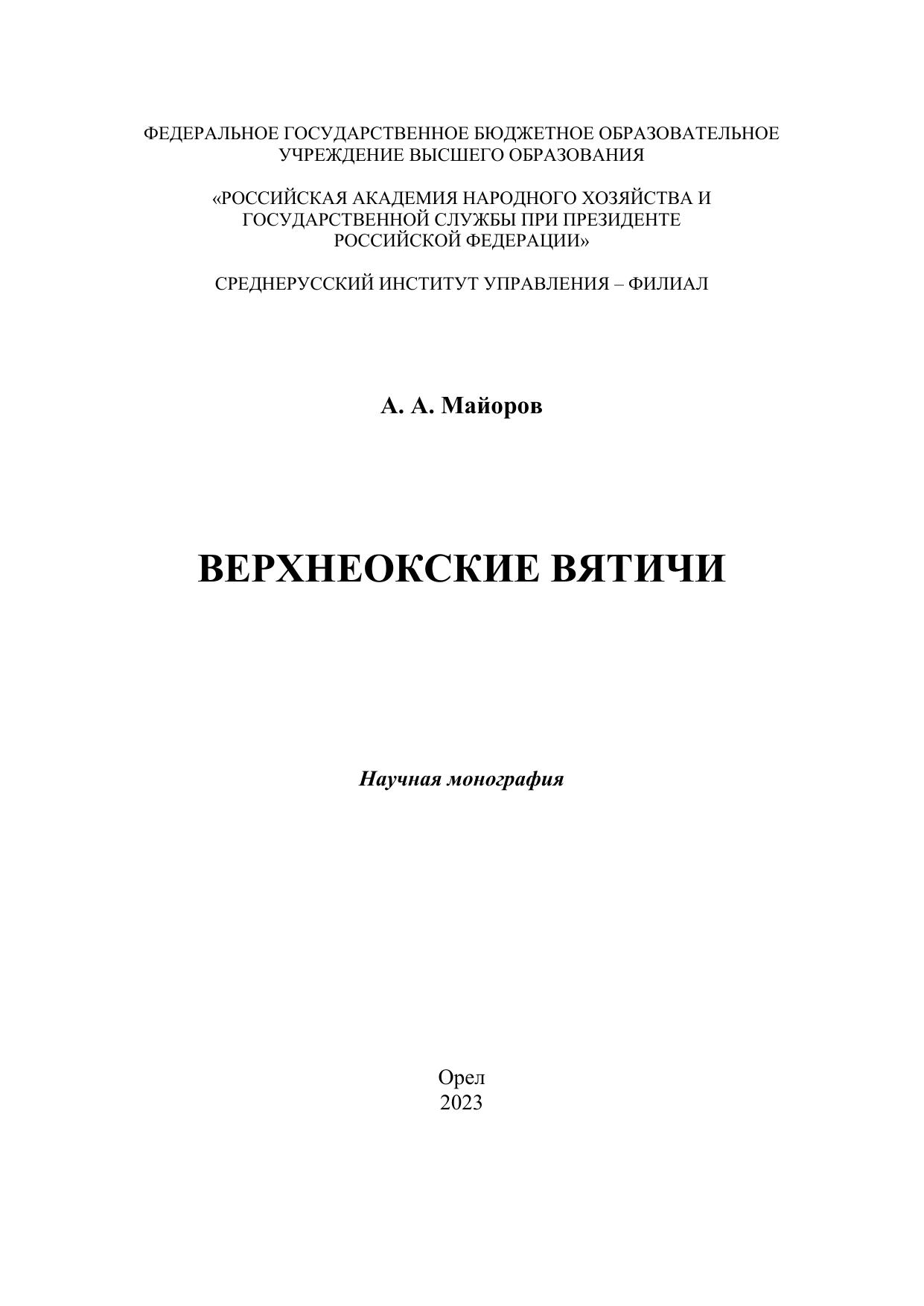 Монография А.А. Майорова «Верхнеокские вятичи» представляет собой современную исследовательскую работу, основанную на комплексном анализе широкого круга исторических источников, дающих разнообразную информацию о возникновении и развитии вятичского этнополитического объединения в период с VIII по XIII вв. Адресована профессиональным исследователям и широкому кругу читателей, интересующихся ранней историей славян бассейна Верхней Оки.