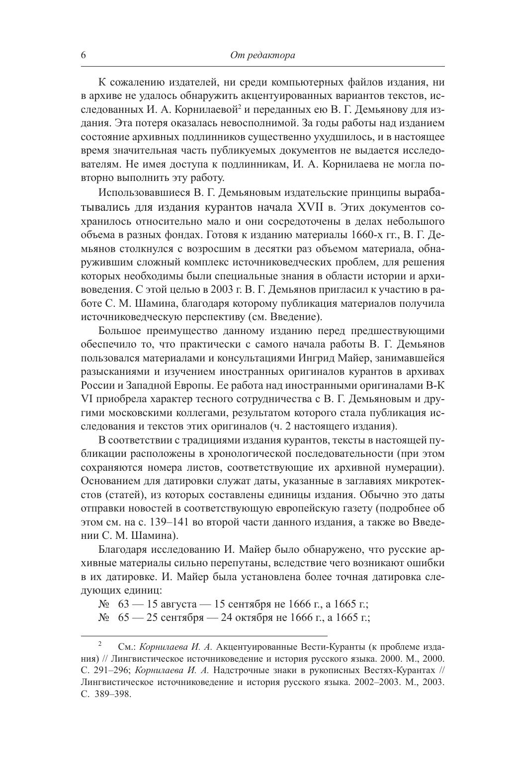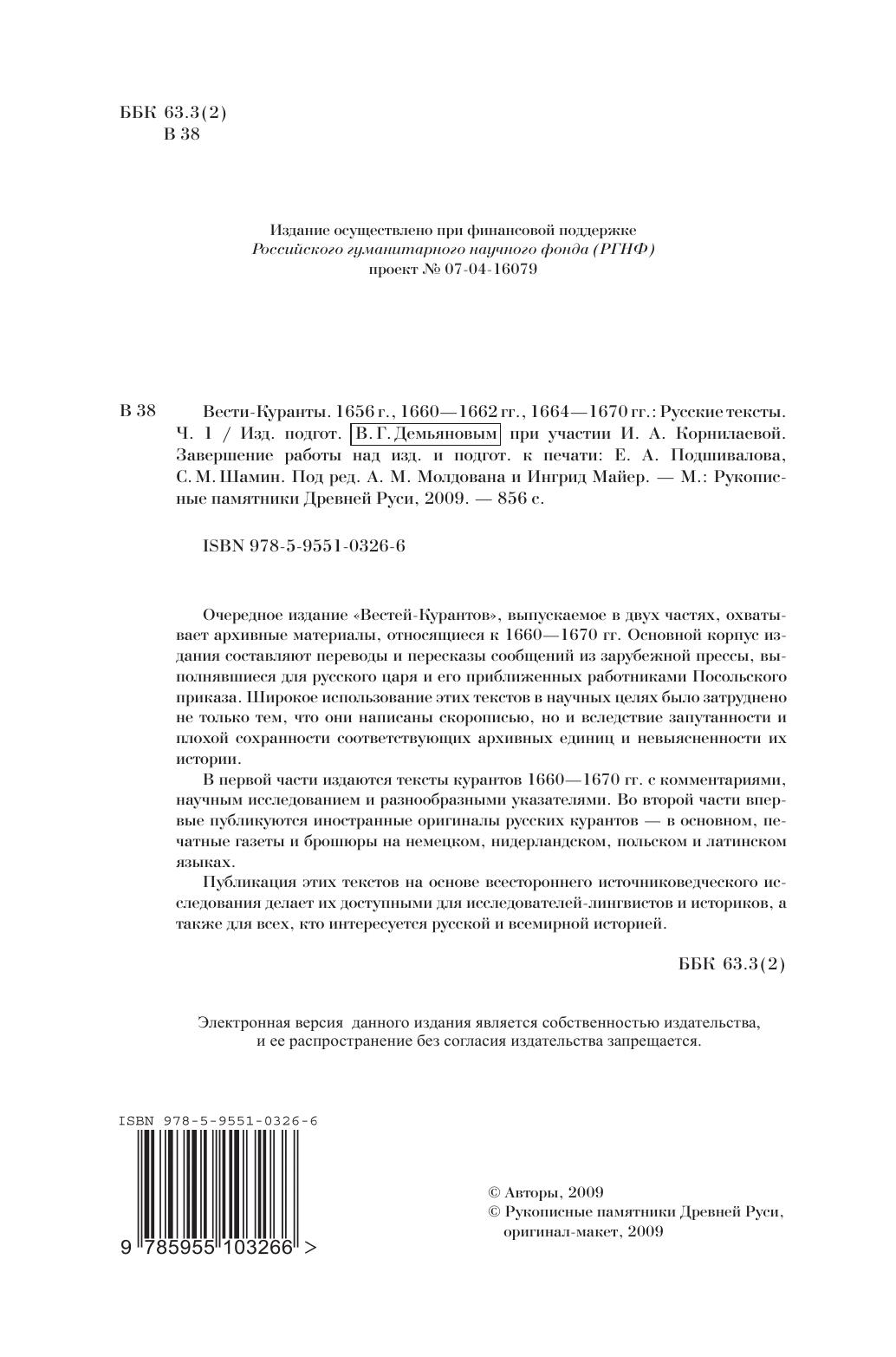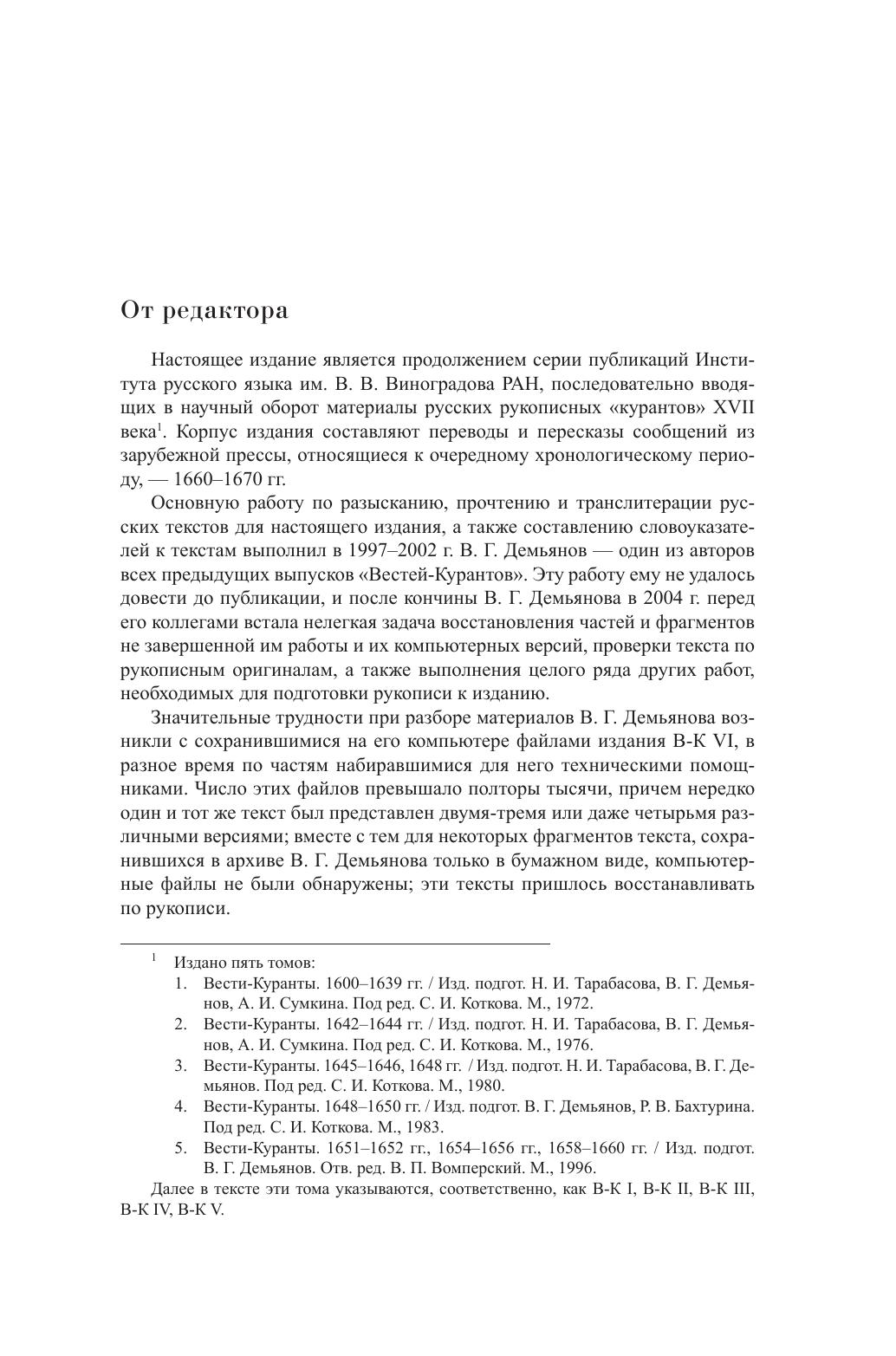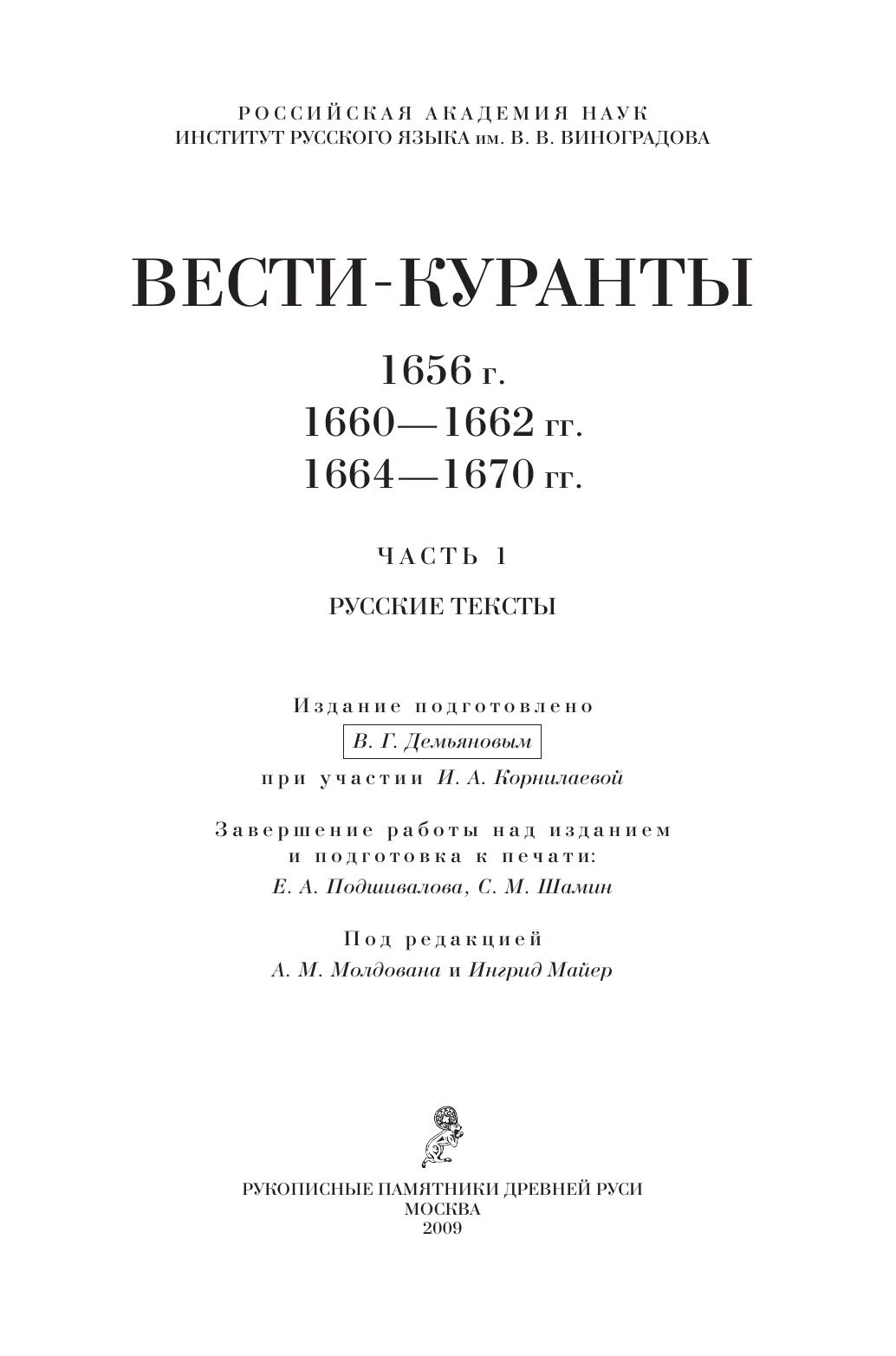 Очередное издание "Вестей-Курантов", выпускаемое в двух частях, охватывает архивные материалы, относящиеся к 1660-1670 гг. Основной корпус издания составляют переводы и пересказы сообщений из зарубежной прессы, выполнявшиеся для русского царя и его приближенных работниками Посольского приказа. Широкое использование этих текстов в научных целях было затруднено не только тем, что они написаны скорописью, но и вследствие запутанности и плохой сохранности соответствующих архивных единиц и невыясненности их истории. В первой части издаются тексты курантов 1660-1670 гг. с комментариями, научным исследованием и разнообразными указателями. Во второй части впервые публикуются иностранные оригиналы русских курантов - в основном, печатные газеты и брошюры на немецком, нидерландском, польском и латинском языках. Публикация этих текстов на основе всестороннего источниковедческого исследования делает их доступными для исследователей-лингвистов и историков, а также для всех, кто интересуется русской и всемирной историей.