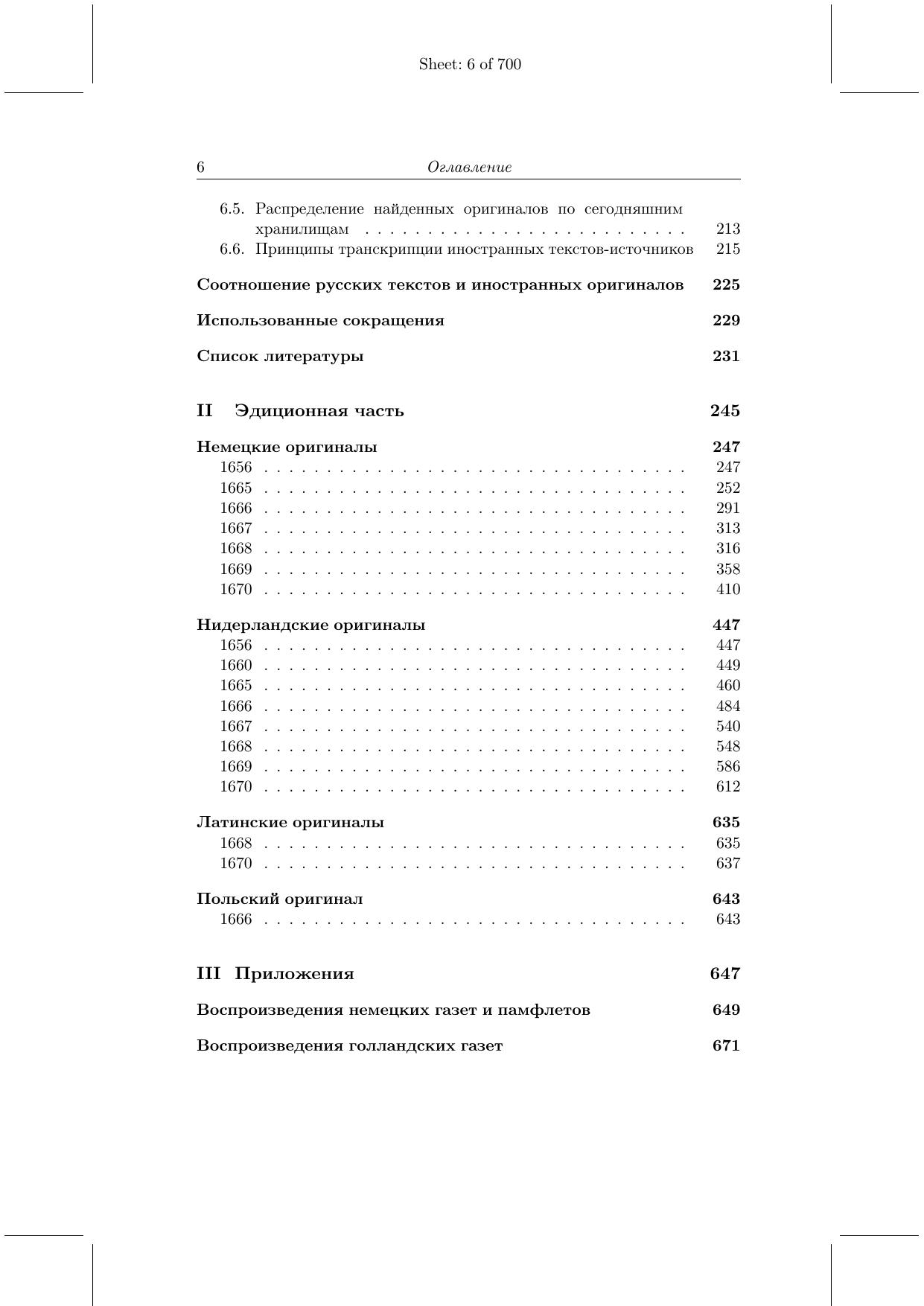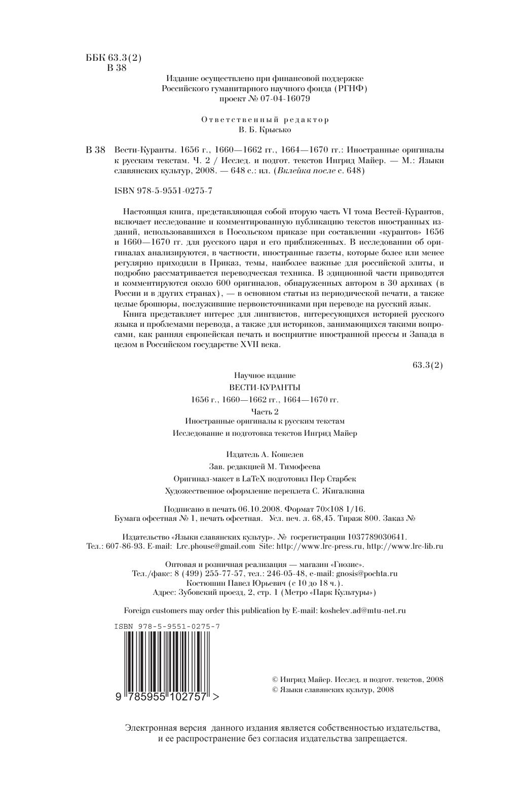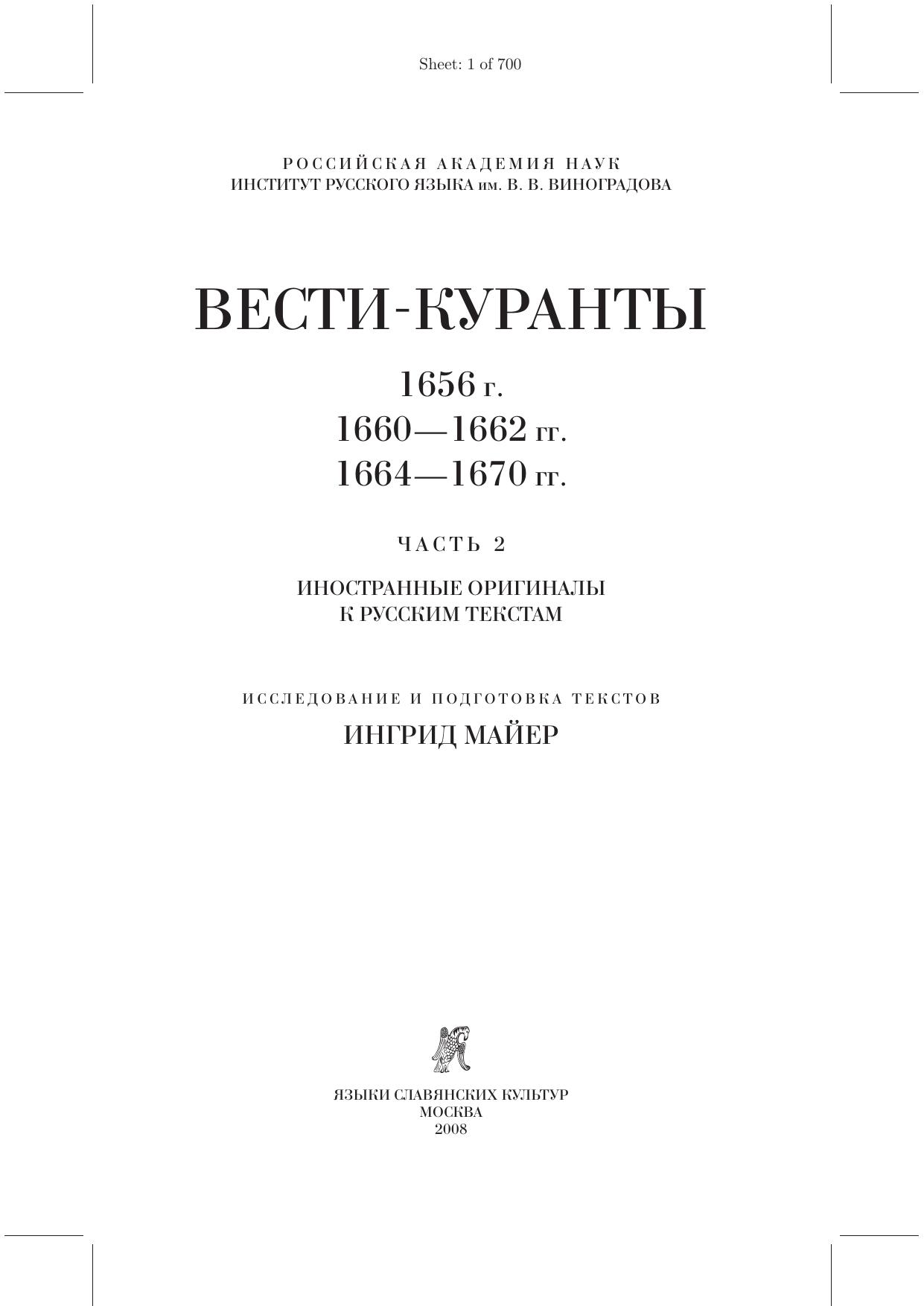 Настоящая книга, представляющая собой вторую часть VI тома Вестей-Курантов, включает исследование и комментированную публикацию текстов иностранных изданий, использовавшихся в Посольском приказе при составлении «курантов» 1656 и 1660—1670 гг. для русского царя и его приближенных. В исследовании об оригиналах анализируются, в частности, иностранные газеты, которые более или менее регулярно приходили в Приказ, темы, наиболее важные для российской элиты, и подробно рассматривается переводческая техника. В эдиционной части приводятся и комментируются около 600 оригиналов, обнаруженных автором в 30 архивах (в России и в других странах), – в основном статьи из периодической печати, а также целые брошюры, послужившие первоисточниками при переводе на русский язык. Книга представляет интерес для лингвистов, интересующихся историей русского языка и проблемами перевода, а также для историков, занимающихся такими вопросами, как ранняя европейская печать и восприятие иностранной прессы и Запада в целом в Российском государстве XVII века.