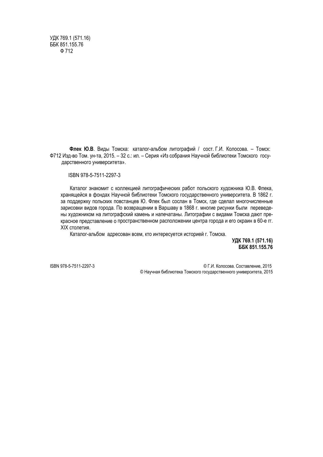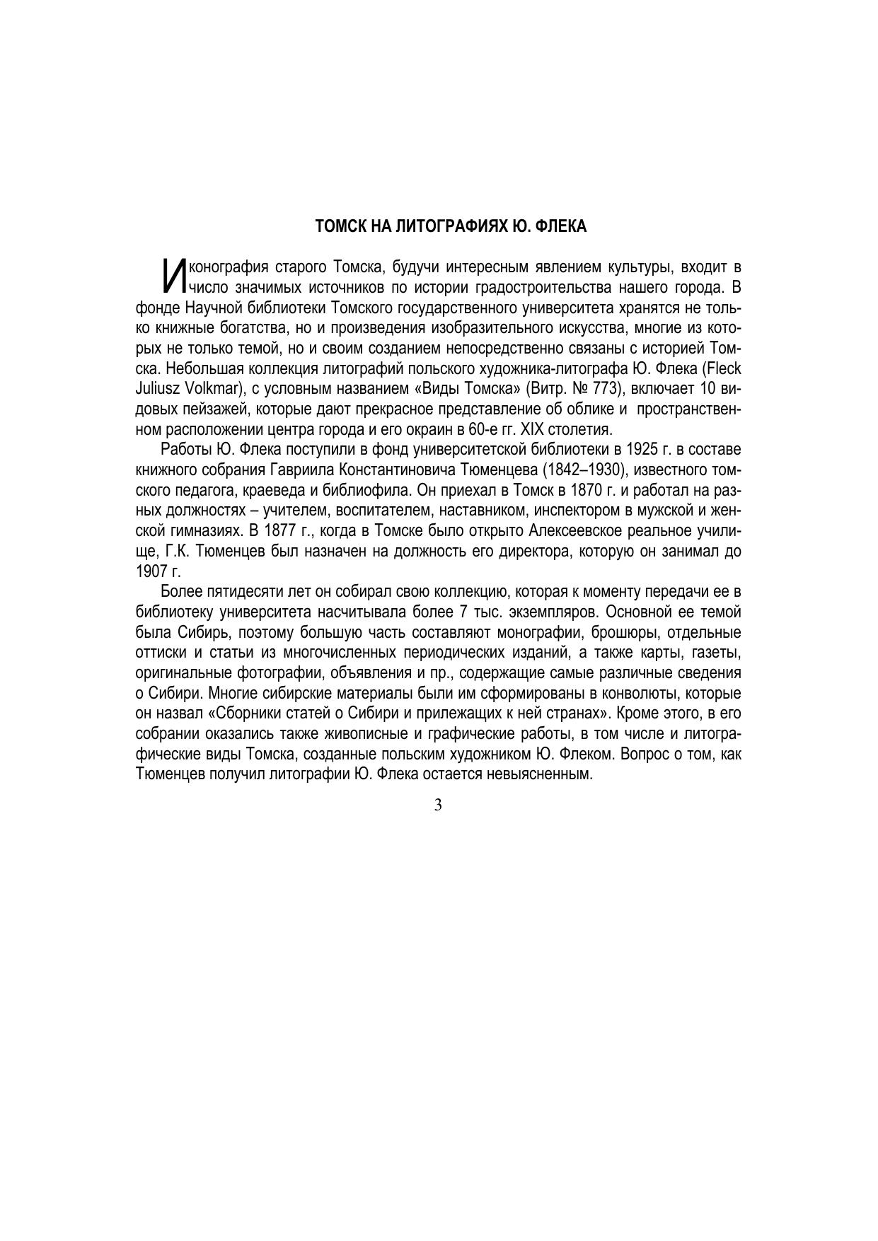 Каталог знакомит с коллекцией литографических работ польского художника Ю.В. Флека, хранящейся в фондах Научной библиотеки Томского государственного университета. В 1862 г. за поддержку польских повстанцев Ю. Флек был сослан в Томск, где сделал многочисленные зарисовки видов города. По возвращении в Варшаву в 1868 г. многие рисунки были переведены художником на литографский камень и напечатаны. Литографии с видами Томска дают прекрасное представление о пространственном расположении центра города и его окраин в 60-е гг. XIX столетия. Каталог-альбом адресован всем, кто интересуется историей г. Томска
