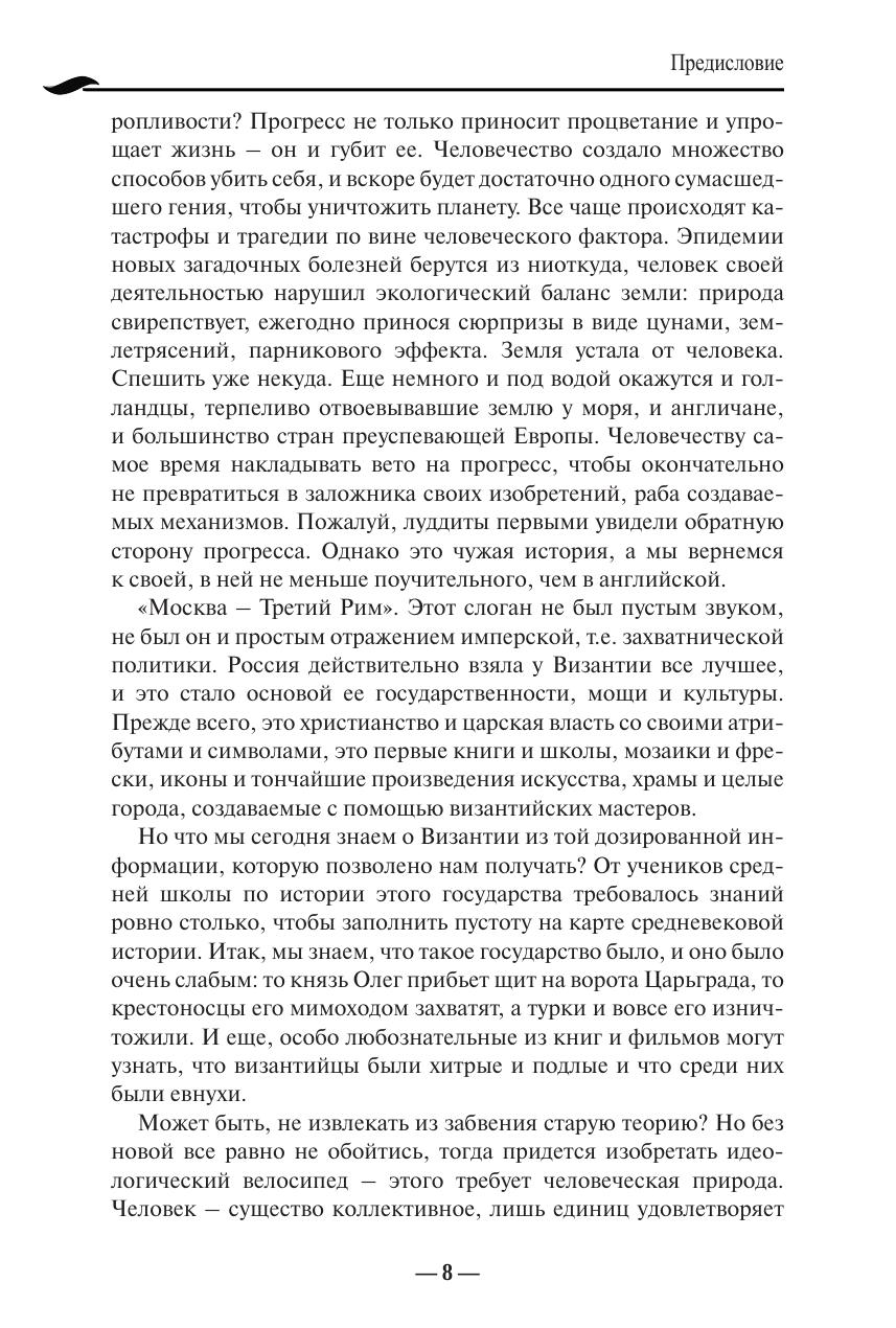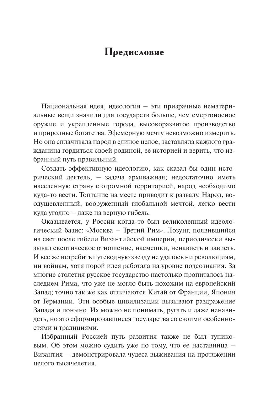 Рассмотрена история России как восприемницы Византийской империи. Рассказано о первых контактах русских и византийцев, об их влиянии на становление Древней Руси. Раскрыты характерные черты Византии в сфере политики, экономики, культуры, религии, образа жизни, мировоззрения. Показано, как они проникали в Древнюю Русь, становились существенной частью жизни и образа мысли князей, аристократии, а затем и простого народа. Большое внимание уделено таким переломным событиям, как крещение Руси и падение Византийской империи, давшим импульс к формированию идеологической доктрины «Москва – Третий Рим». Прослежена судьба византийского наследия в период Третьего Рима, как называет автор Российскую империю, и Четвертого Рима, в качестве которого в книге представлен Советский Союз. Анализируются противоречивые взаимоотношения России и Запада. Высказываются гипотезы о будущем нашей страны и мира. Книга написана живым языком, содержит малоизвестные факты и новые, оригинальные трактовки событий прошлого. Для студентов, школьников старших классов. Может использоваться в учебном процессе школ и вузов в качестве дополнительной литературы. Представляет интерес для широкого круга читателей.