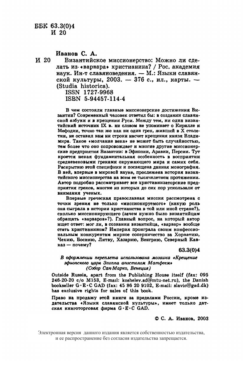 В чем состояли главные миссионерские достижения Византии? Современный человек ответил бы: в создании славянской азбуки и в крещении Руси. Между тем, ни один византийский источник IX в. ни словом не упоминает о Кирилле и Мефодии, точно так же как ни один грек, живший в X столетии, не оставил нам ни строки насчет крещения князя Владимира. Такое "молчание века" не может быть случайностью, тем более что оно сопровождает и многие другие миссионерские предприятия Византии: в Эфиопии, Аравии, Персии. Тут кроется некая фундаментальная особенность в восприятии средневековыми греками окружающего мира и самих себя. Раскрытию этой специфики и посвящена данная монография. В ней, впервые в мировой науке, прослежена история византийского миссионерства на всем ее тысячелетнем протяжении. Автор подробно рассматривает все христианизаторские предприятия греков, многие из которых до сих пор ускользали от внимания ученых. Впервые греческая православная миссия рассмотрена с точки зрения не только "миссионируемого" (какую роль она сыграла в истории христианства в той или иной стране?), сколько миссионирующего (зачем нужно было византийцам обращать "варваров"?). Главный вопрос, на который автор ищет ответ: мог ли, в сознании византийца, "варвар" вообще стать христианином? Империя проиграла своим конфессиональным конкурентам мирное соперничество за Хорватию, Чехию, Боснию, Литву, Хазарию, Венгрию, Северный Кавказ - почему? Для научных работников, широкого круга специалистов.