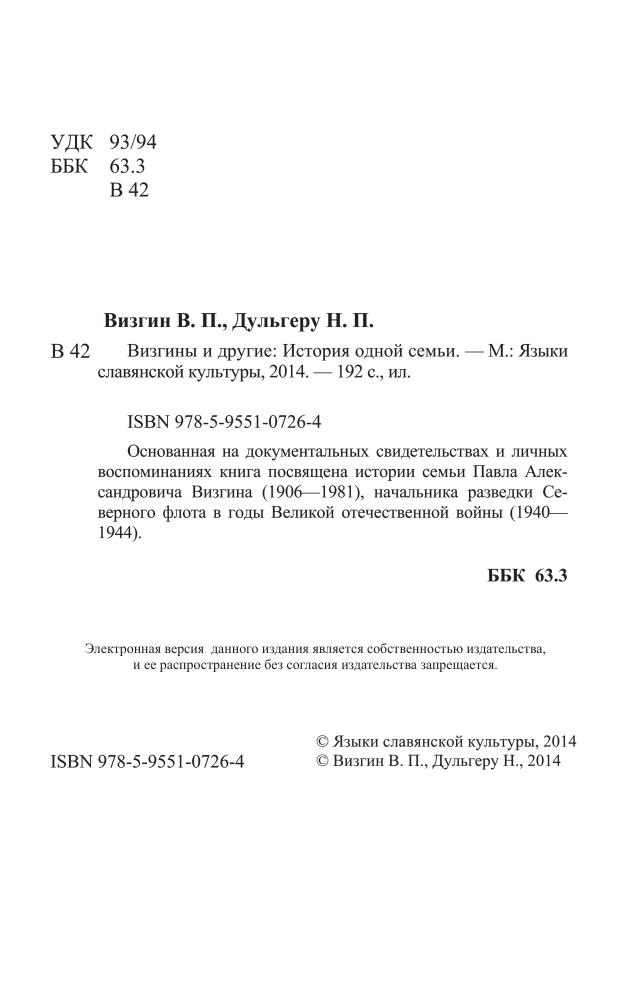 Основанная на документальных свидетельствах и личных воспоминаниях книга посвящена истории семьи Павла Александровича Визгина (1906-1981), начальника разведки Северного флота в годы Великой отечественной войны (1940- 1944).