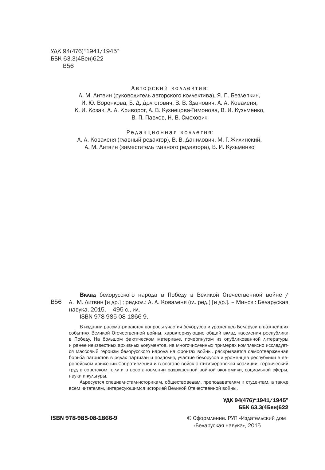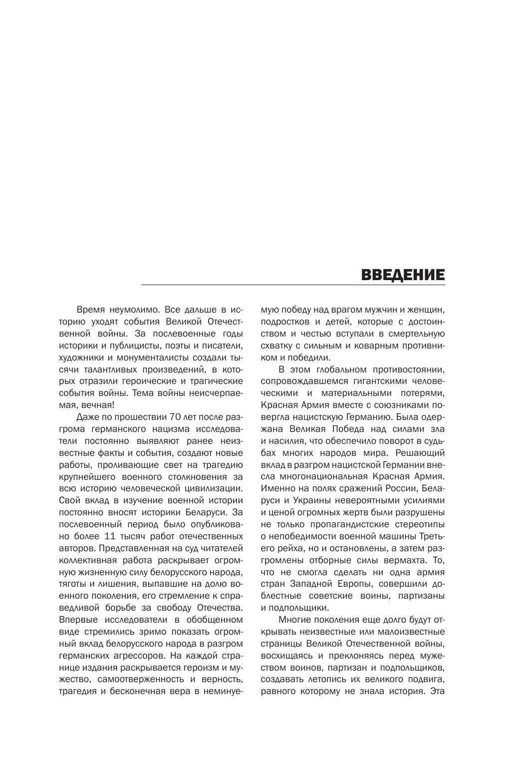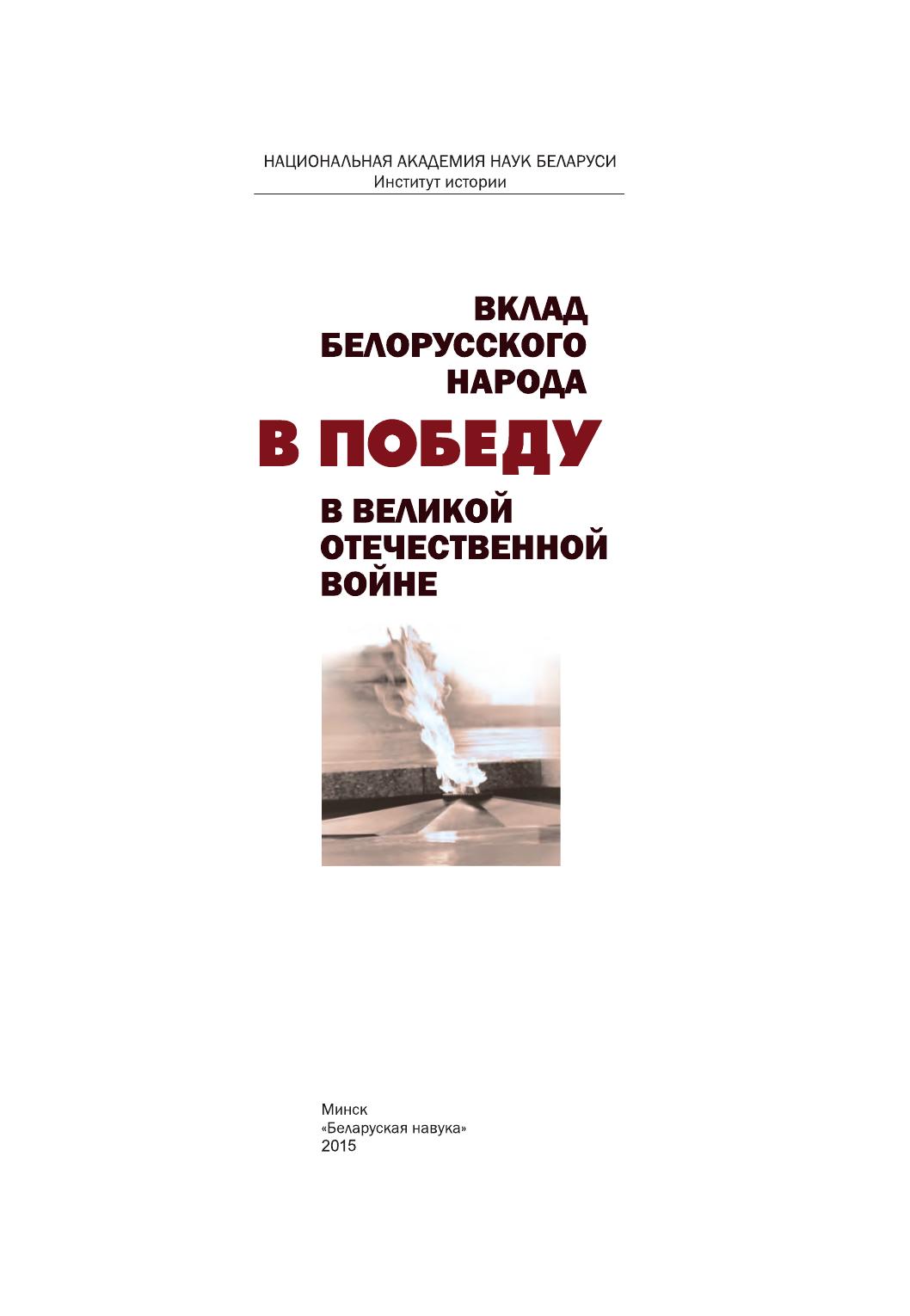 В издании рассматриваются вопросы участия белорусов и уроженцев Беларуси в важнейших событиях Великой Отечественной войны, характеризующие общий вклад населения республики в Победу. На большом фактическом материале, почерпнутом из опубликованной литературы и ранее неизвестных архивных документов, на многочисленных примерах комплексно исследуется массовый героизм белорусского народа на фронтах войны, раскрывается самоотверженная борьба патриотов в рядах партизан и подполья, участие белорусов и уроженцев республики в европейском движении Сопротивления и в составе войск антигитлеровской коалиции, героический труд в советском тылу и в восстановлении разрушенной войной экономики, социальной сферы, науки и культуры. Адресуется специалистам-историкам, обществоведам, преподавателям и студентам, а также всем читателям, интересующимся историей Великой Отечественной войны.